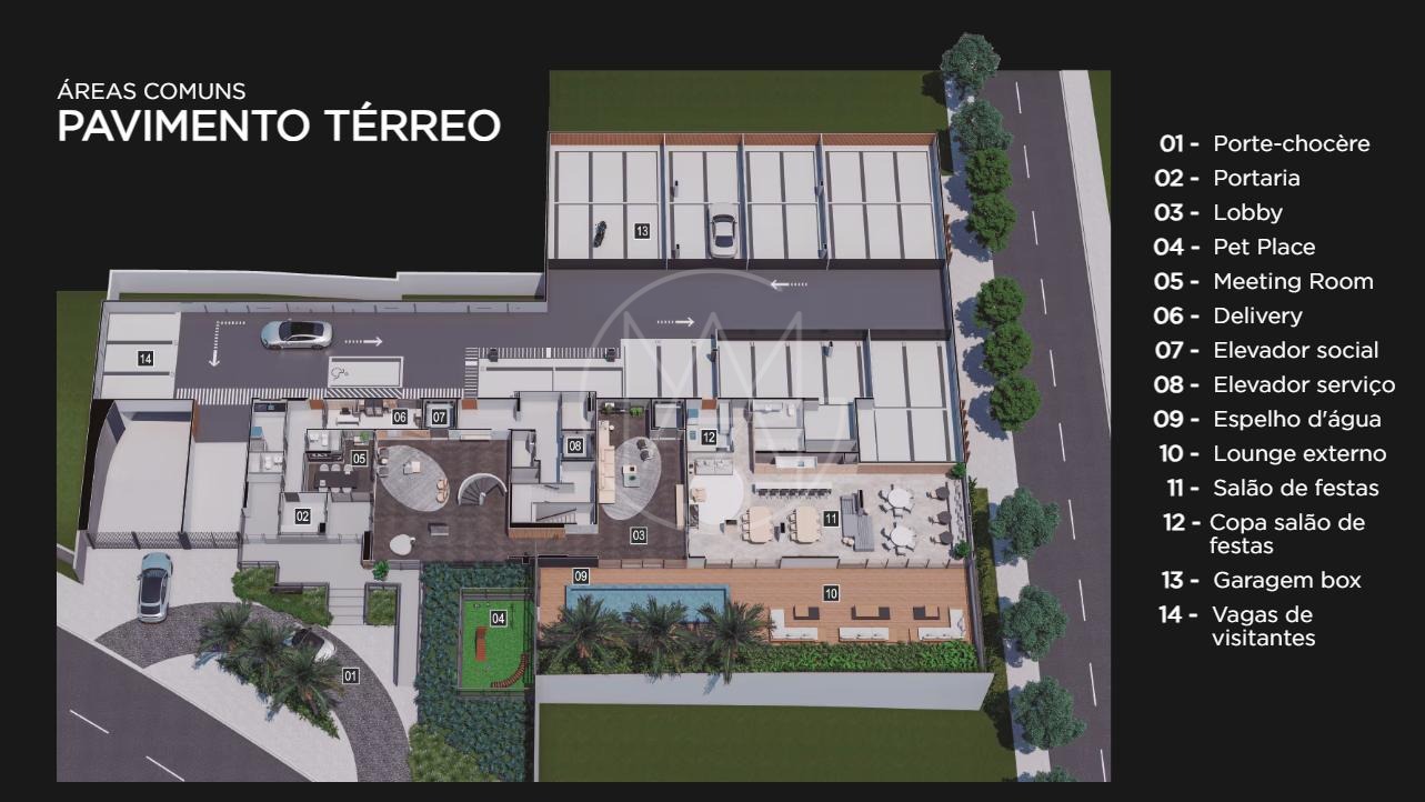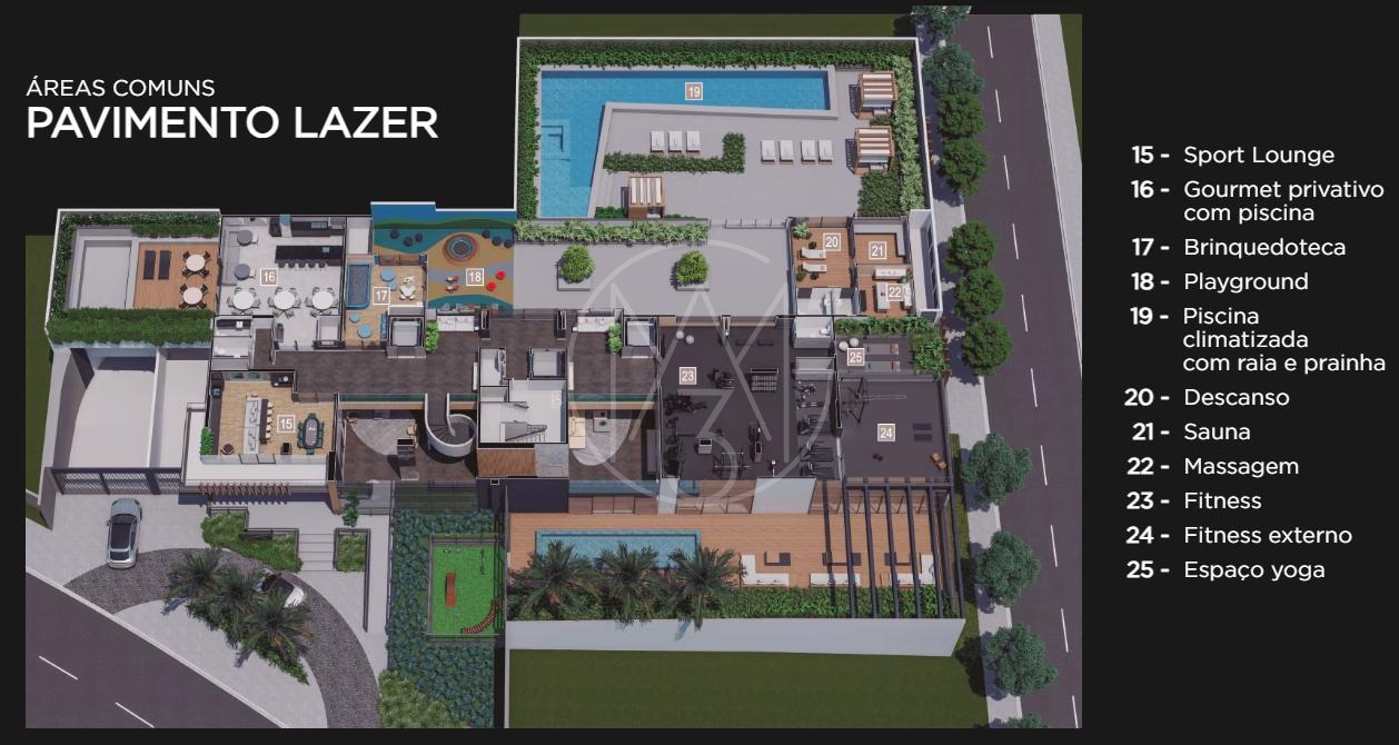 O condomínio oferece infraestrutura completa de lazer e segurança, incluindo piscina com raia, academia equipada, sauna, salão de festas, espaço gourmet, brinquedoteca, playground e portaria 24 horas com controle de acesso.