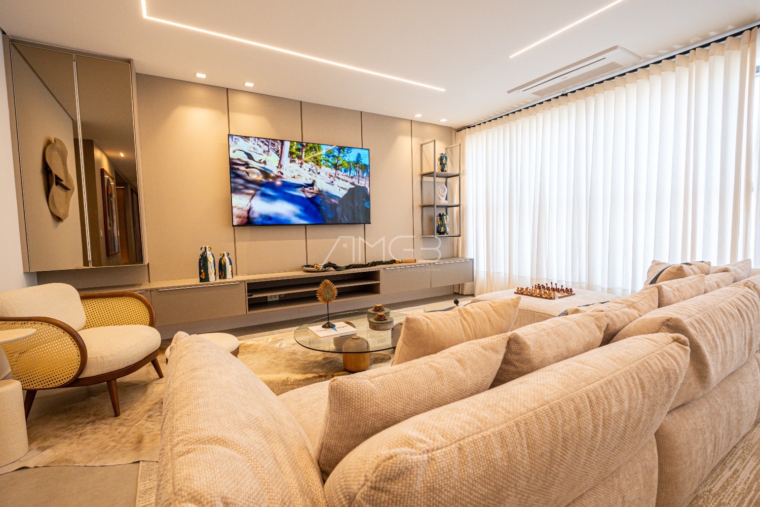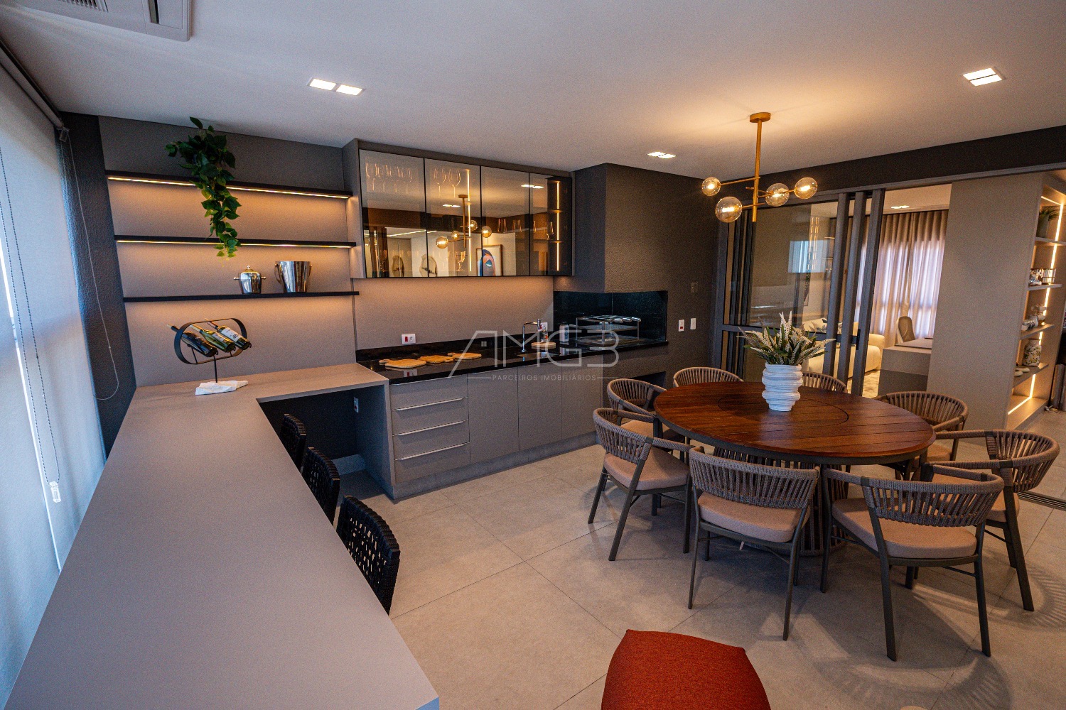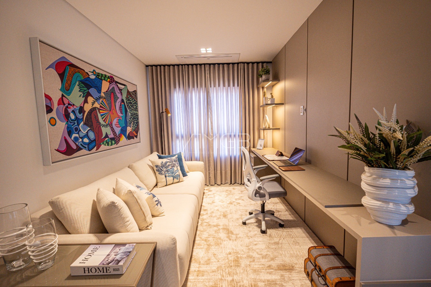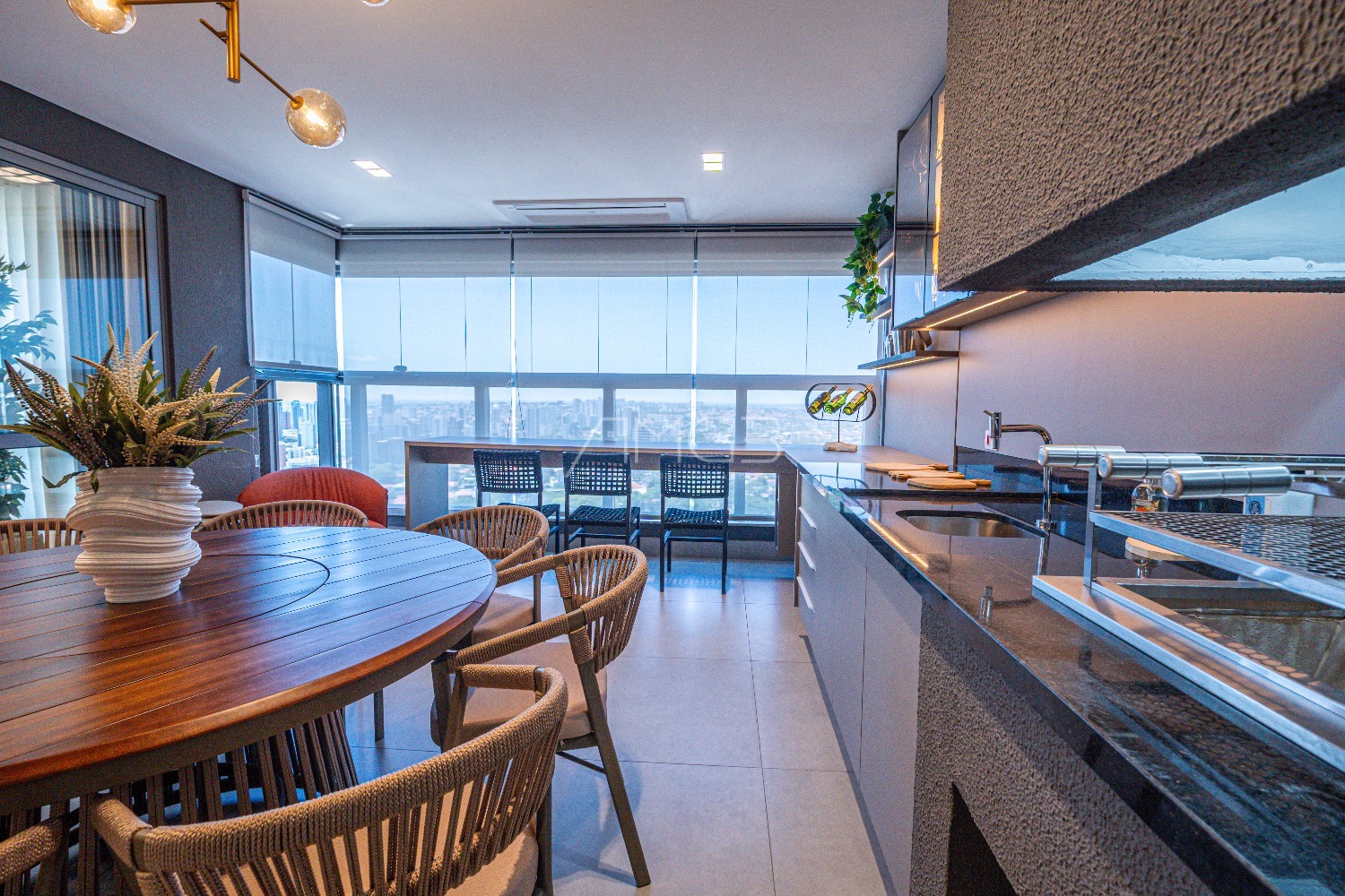 O apartamento conta com três suítes amplas, todas com closet, living imponente, sala de jantar elegante, cozinha totalmente equipada e móveis planejados em todos os ambientes. O espaço gourmet com churrasqueira é perfeito para receber, enquanto o home office integrado à sala de TV traz funcionalidade ao dia a dia. O elevador privativo reforça a sensação de exclusividade desde a chegada.