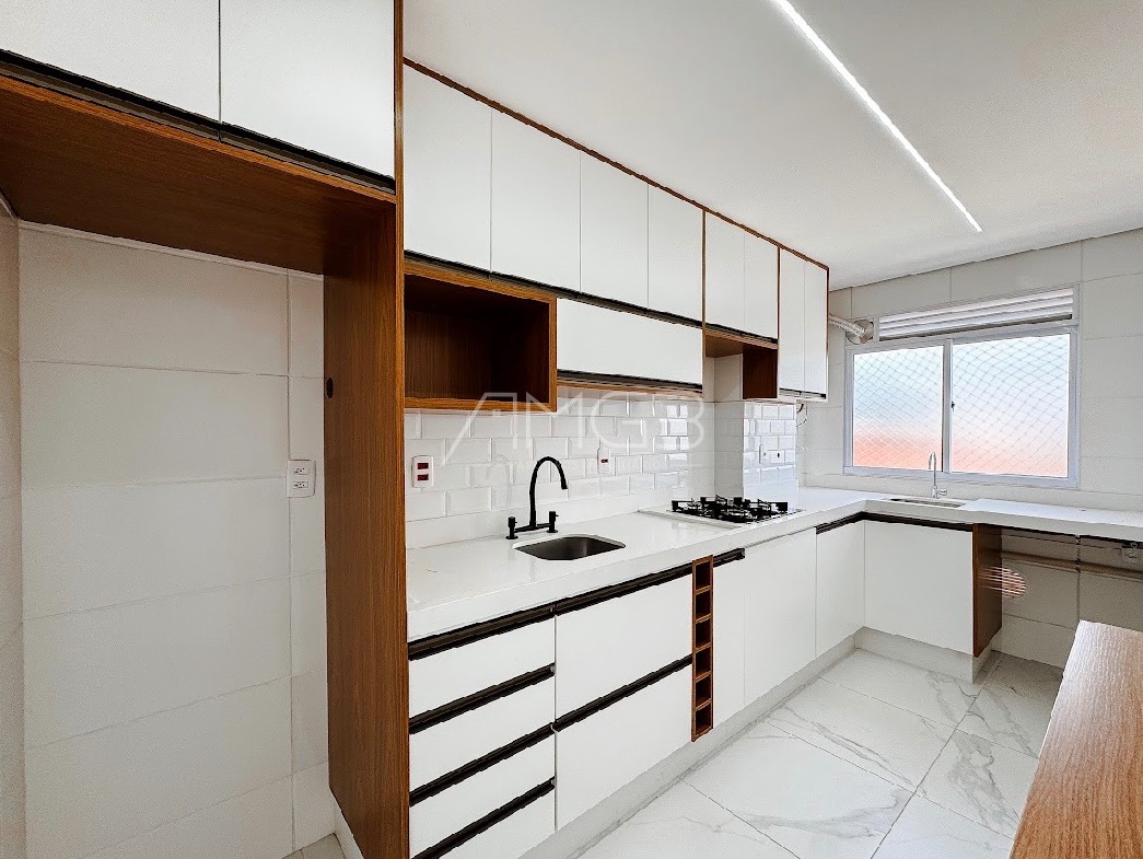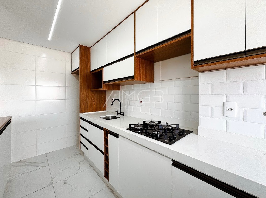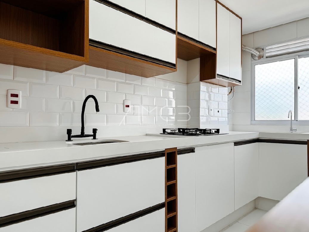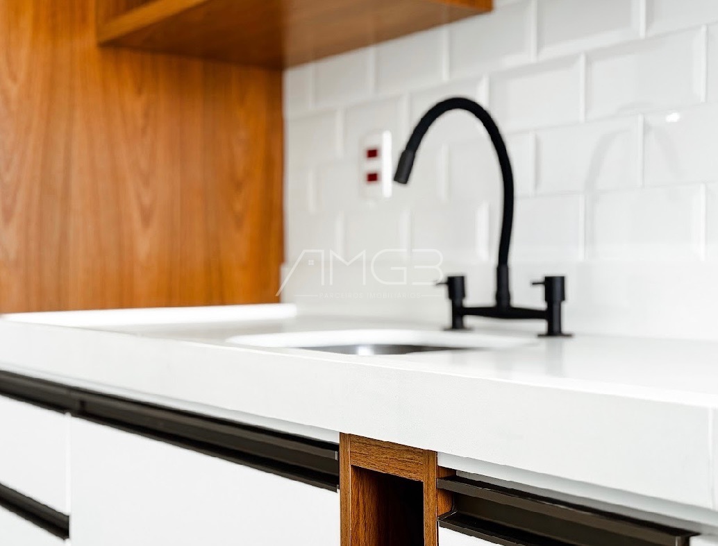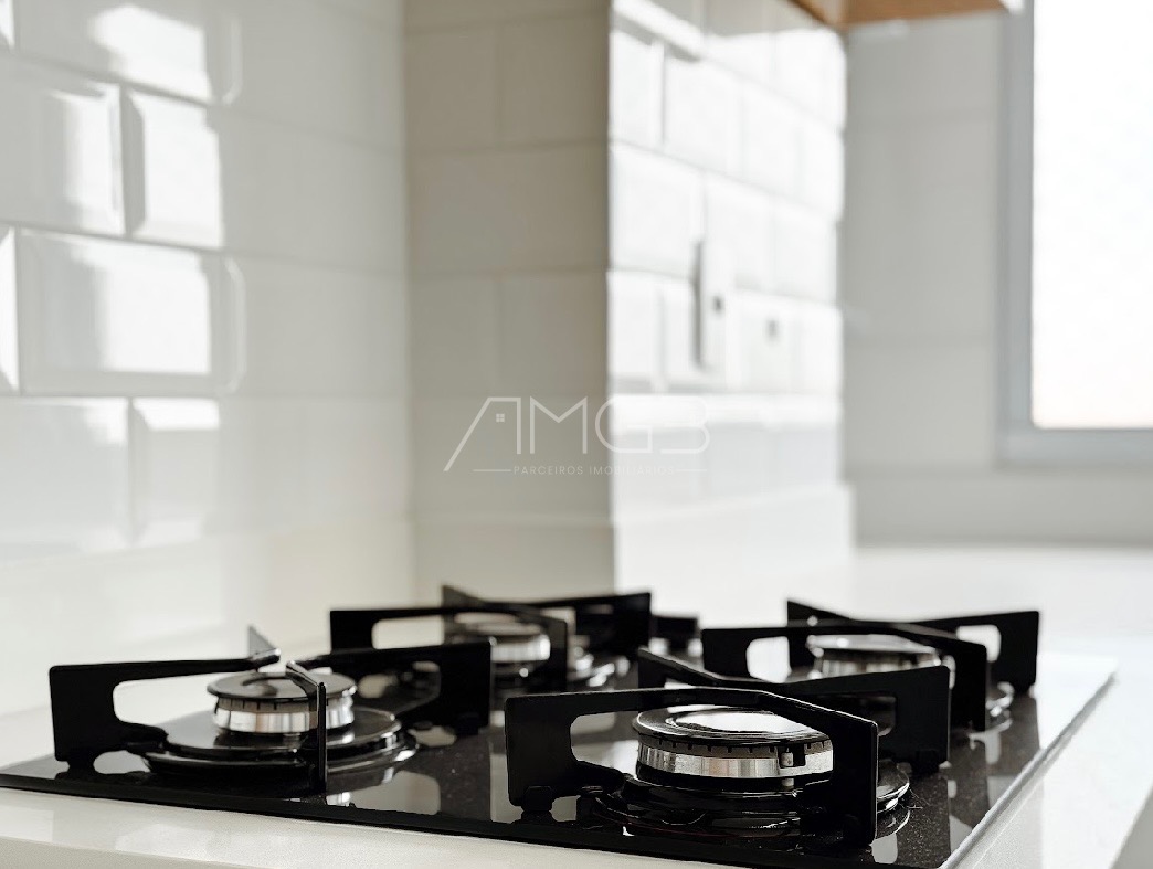 A cozinha é planejada e equipada com cooktop, micro-ondas e geladeira. O imóvel conta ainda com infraestrutura para ar-condicionado, aquecedor a gás e automação com comando via Alexa, trazendo mais conforto e tecnologia para a rotina.