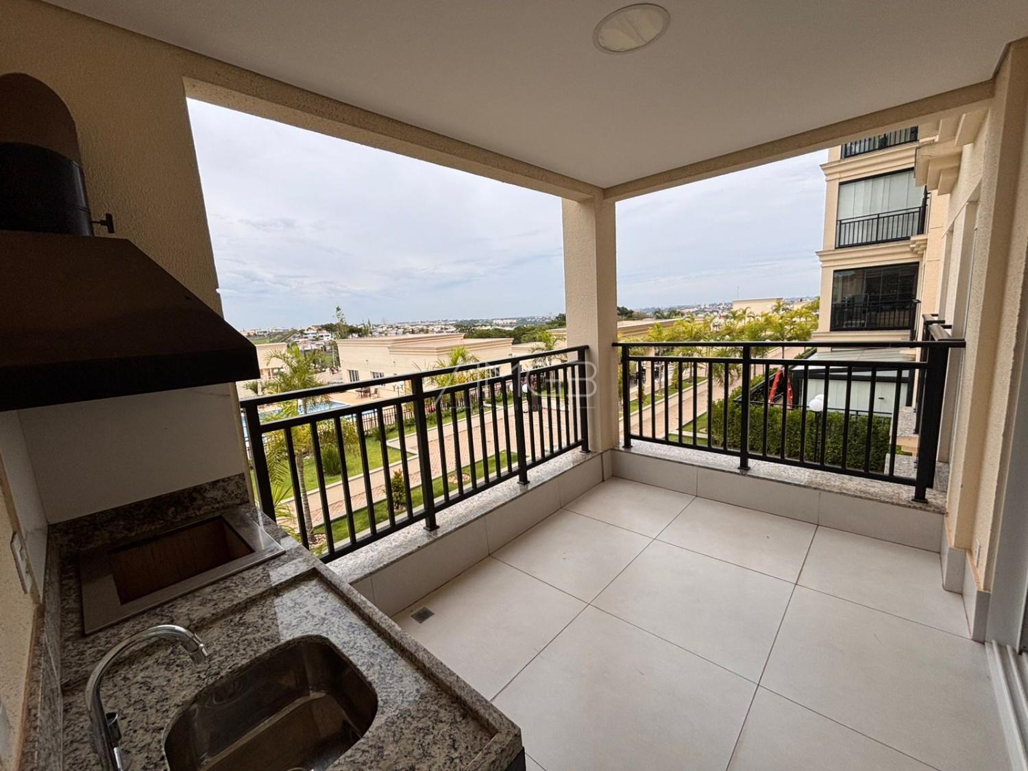 Varanda com churrasqueira e vista para a piscina.
