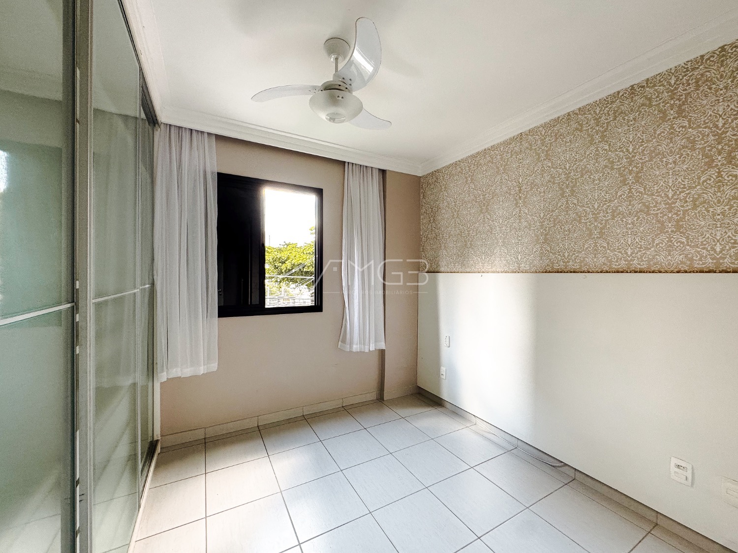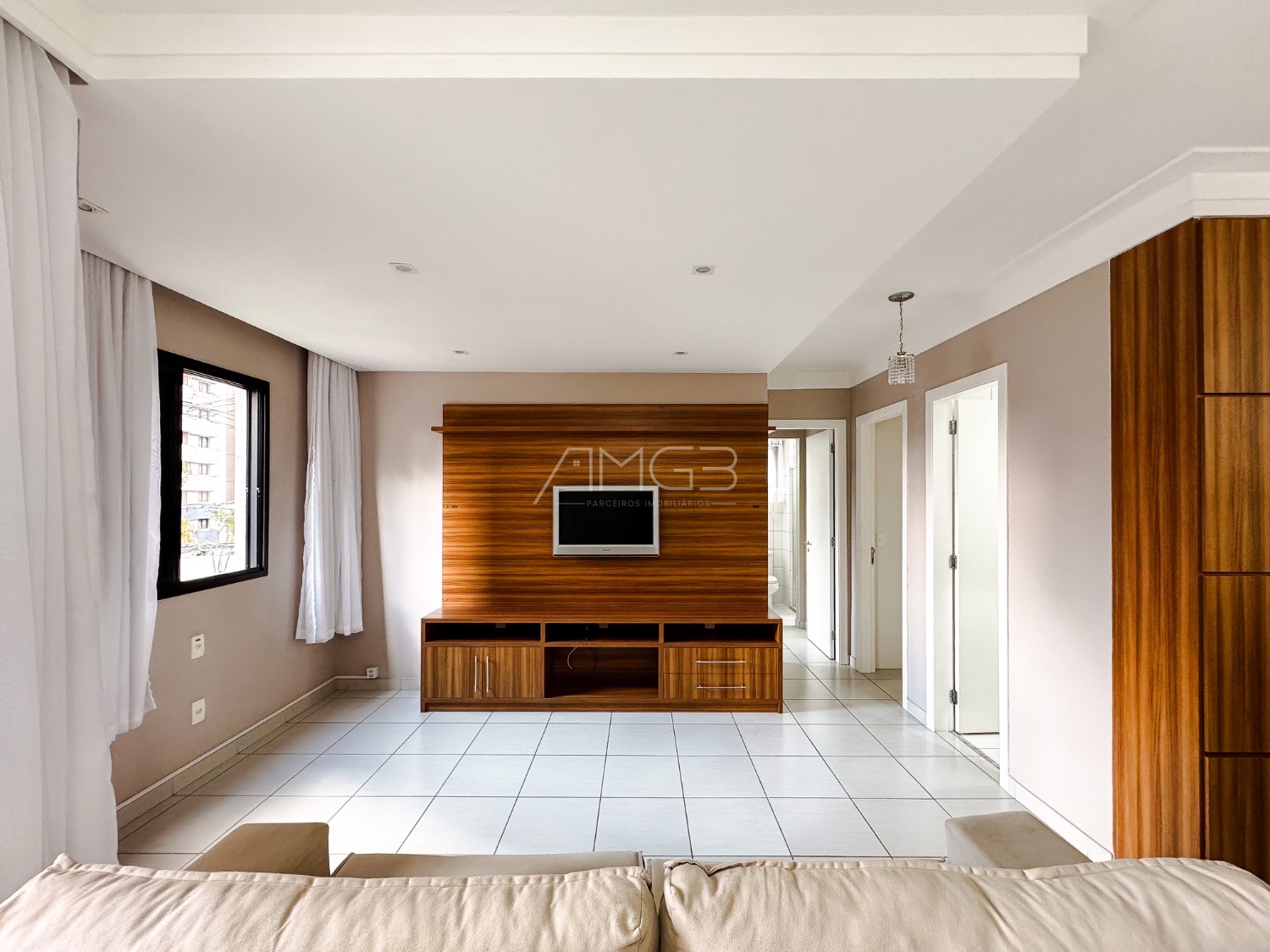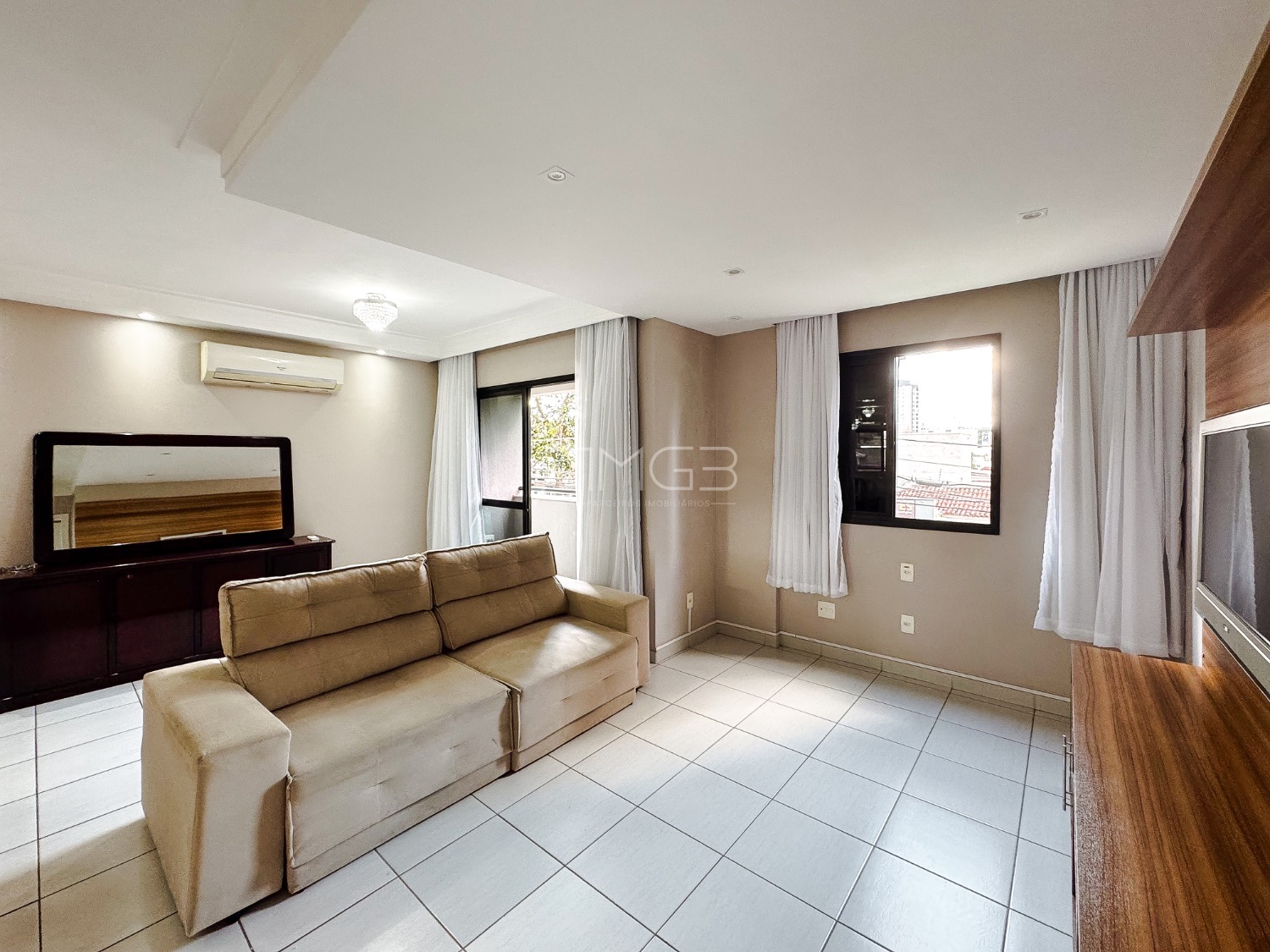 Na sala, o apartamento dispõe de sofá, painel com televisão, mesa de jantar com cadeiras, cortinas e ar-condicionado. O imóvel ainda conta com banheiro social e quartos equipados com guarda-roupas e ventiladores de teto.