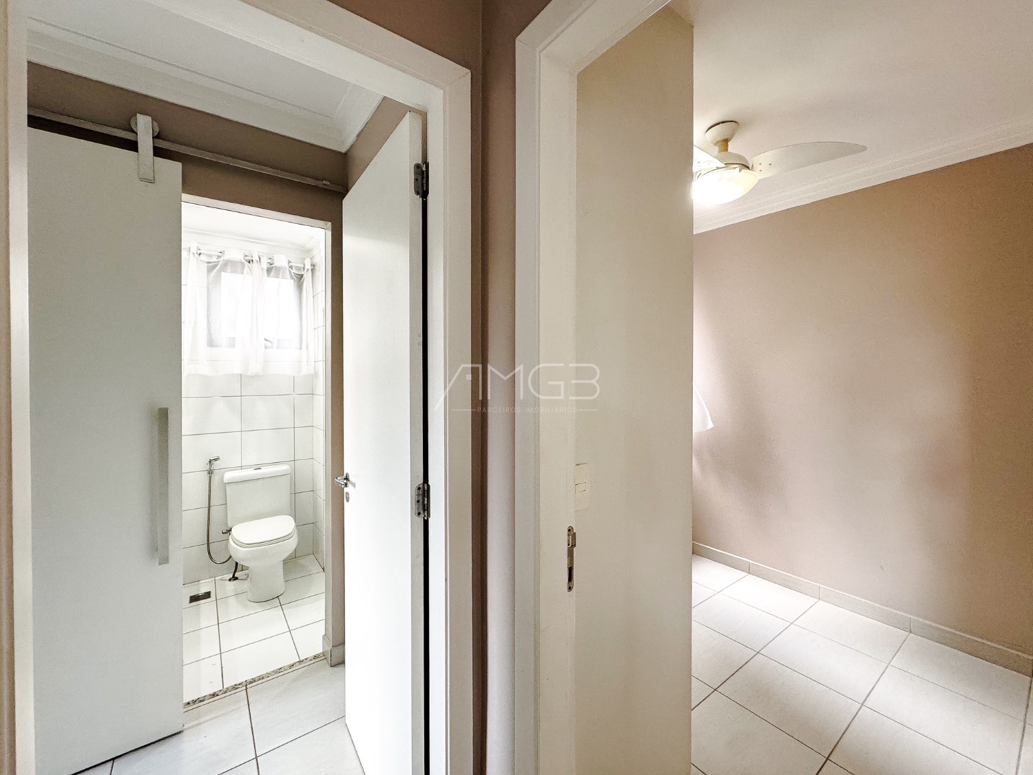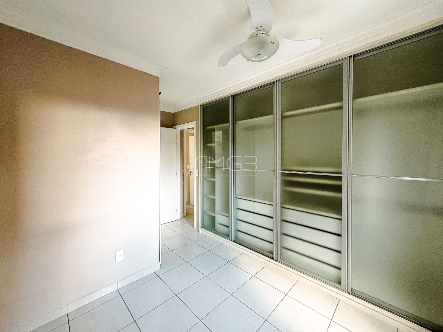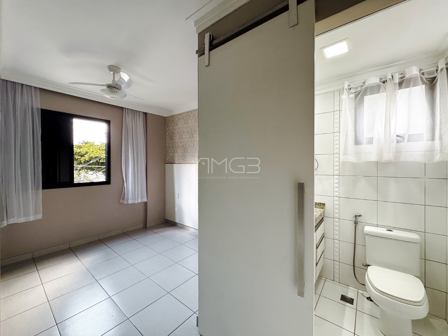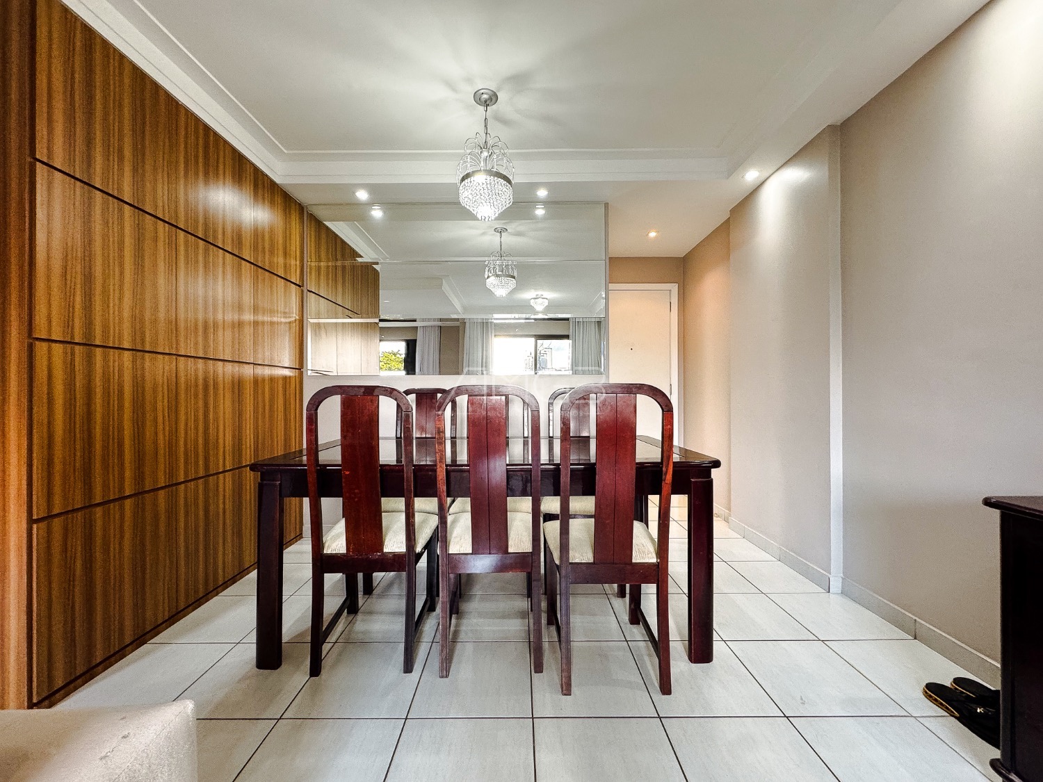 Na sala, o apartamento dispõe de sofá, painel com televisão, mesa de jantar com cadeiras, cortinas e ar-condicionado. O imóvel ainda conta com banheiro social e quartos equipados com guarda-roupas e ventiladores de teto.