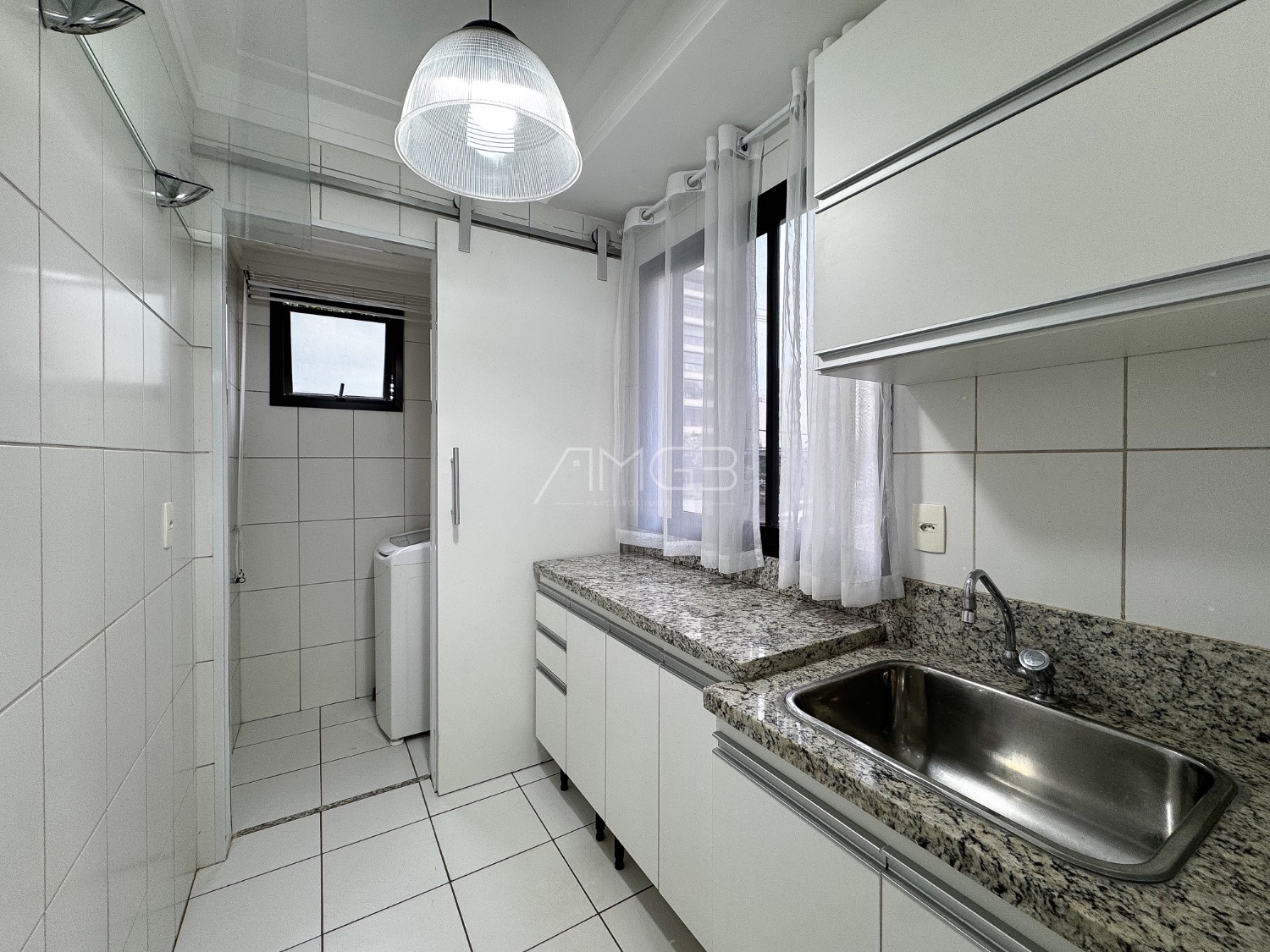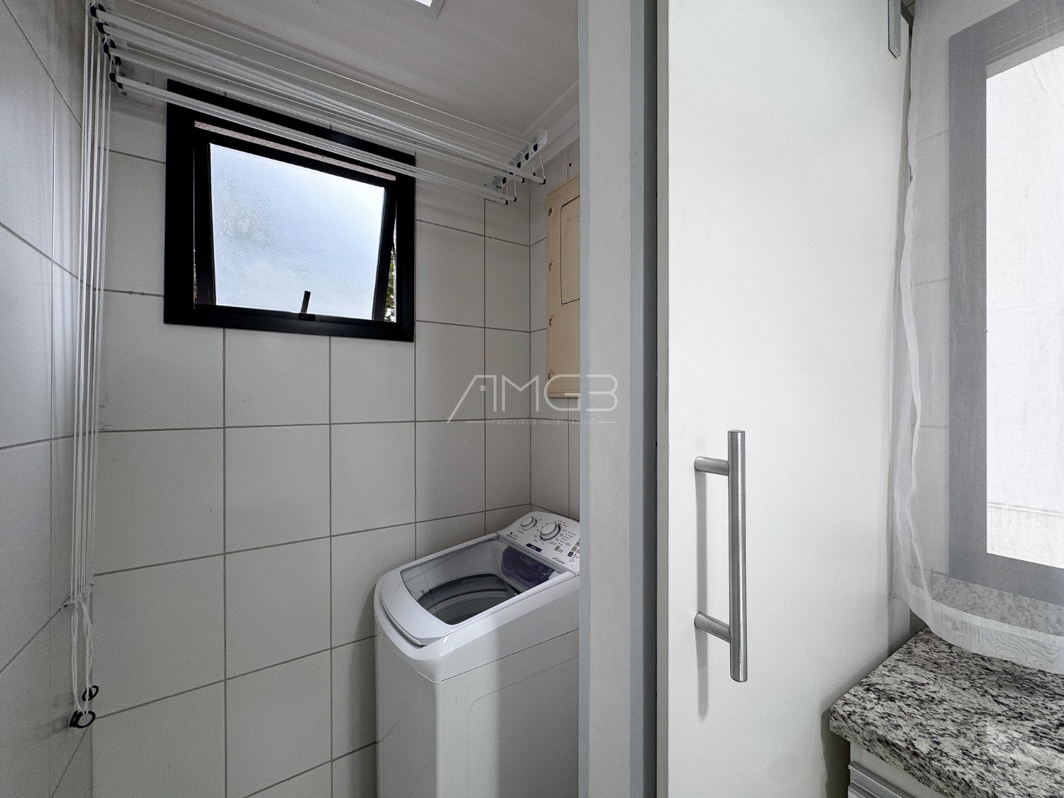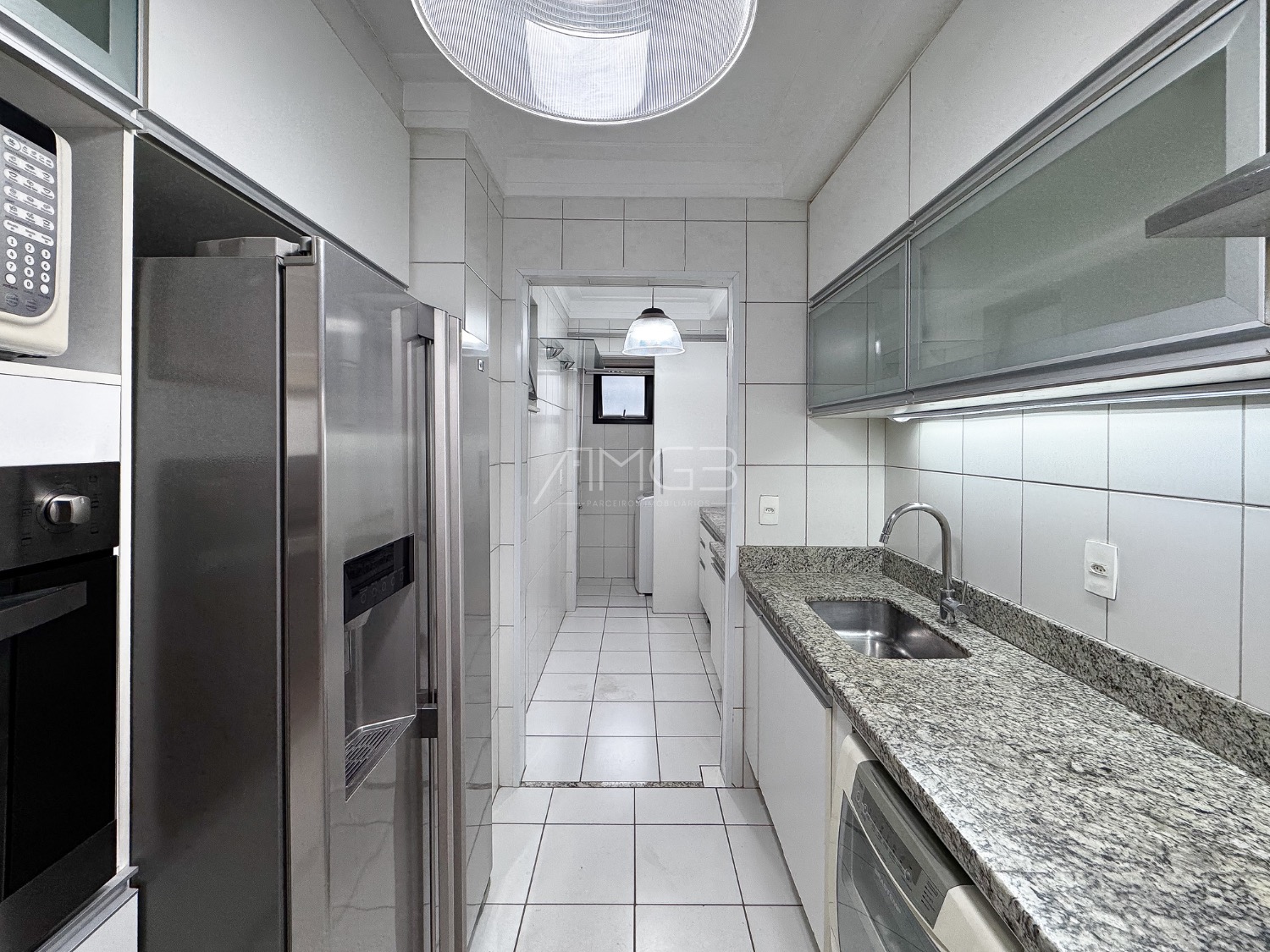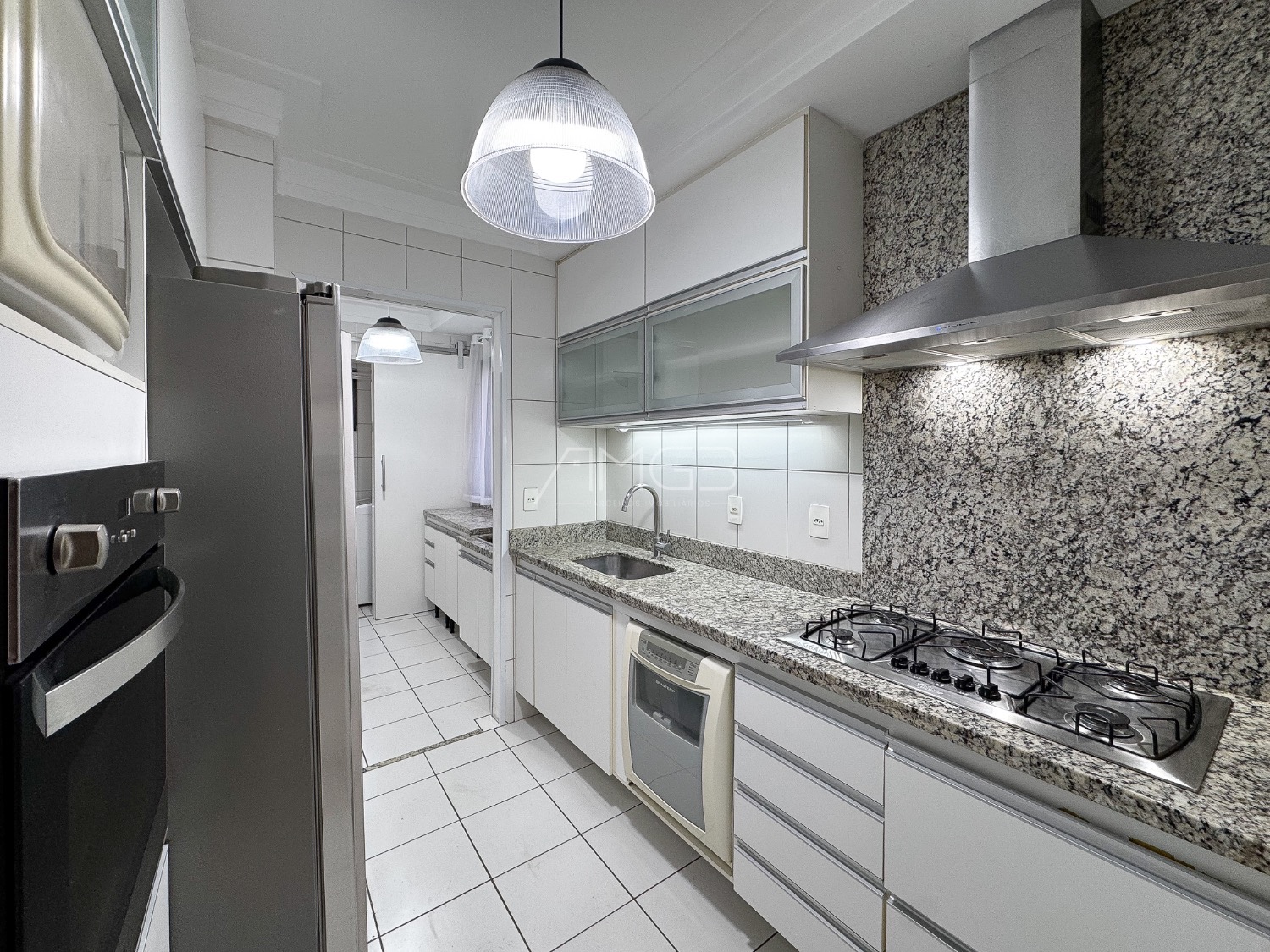 A cozinha é planejada e equipada com cooktop, forno elétrico, micro-ondas, geladeira, lava-louças e coifa, oferecendo praticidade para o dia a dia. A lavanderia possui máquina de lavar já instalada.