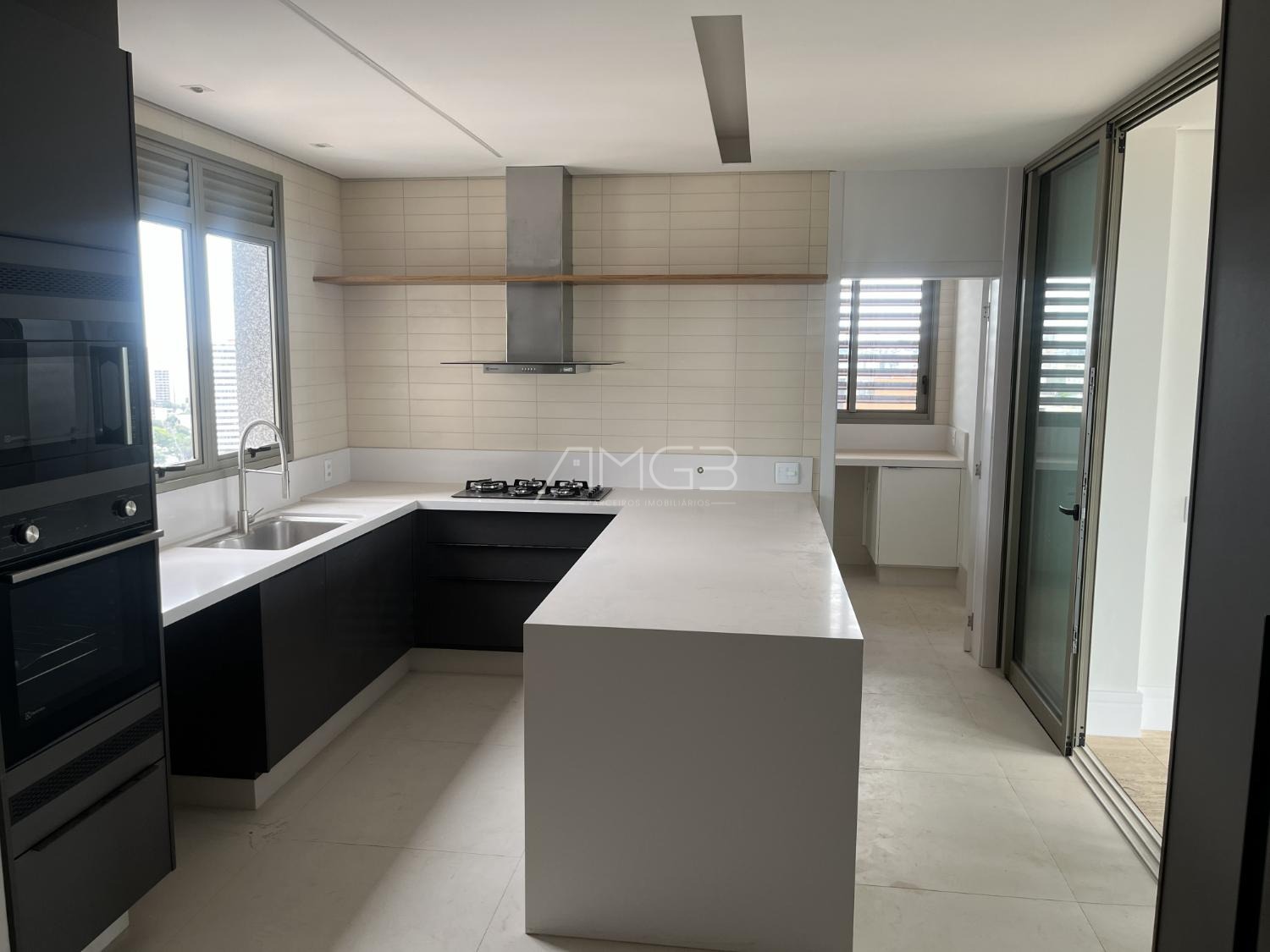 Cozinha planejada com ilha em Quartzo Branco e eletrodomésticos embutidos. Projeto de iluminação, gesso e ar-condicionado em todos os ambientes.