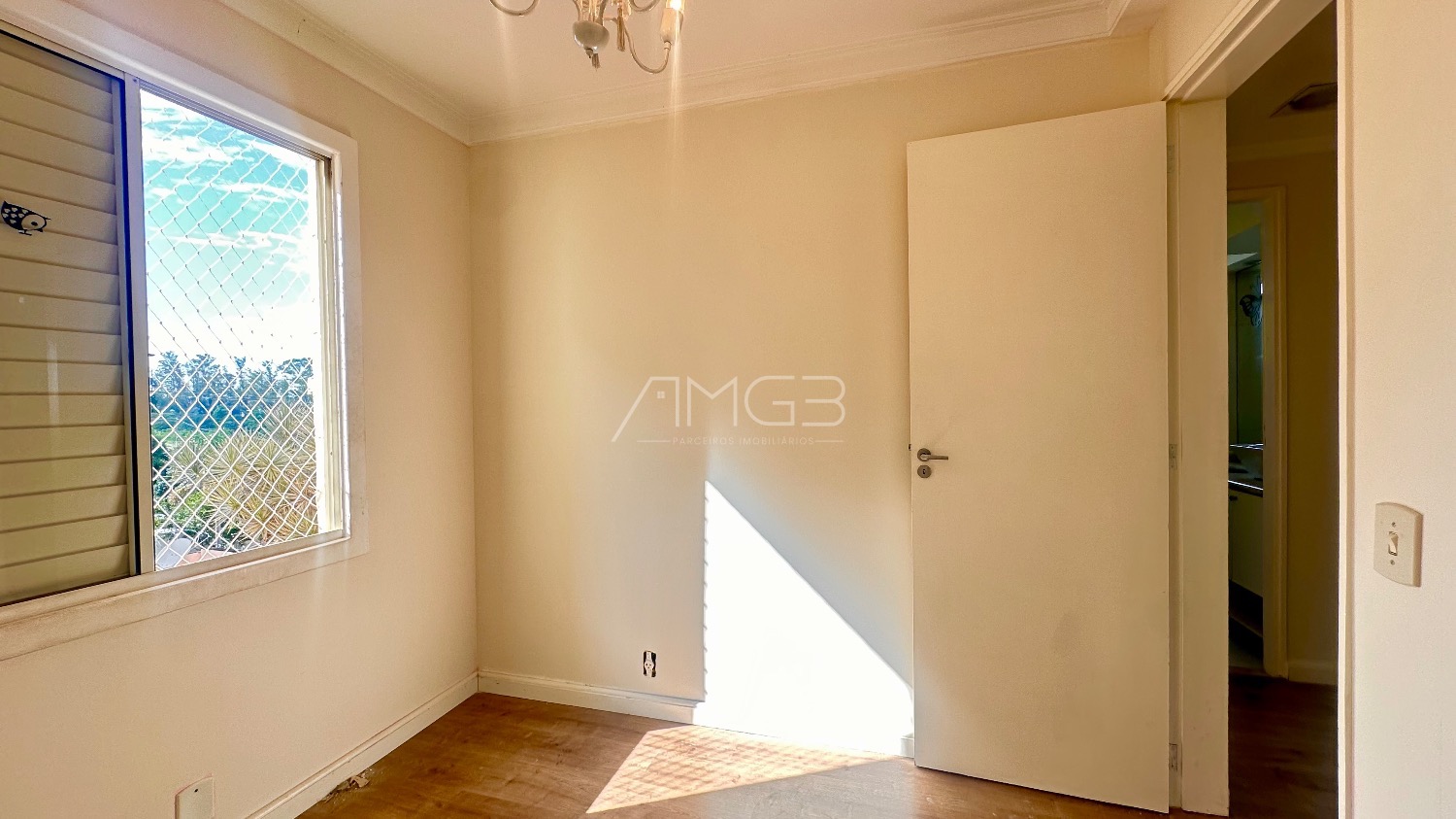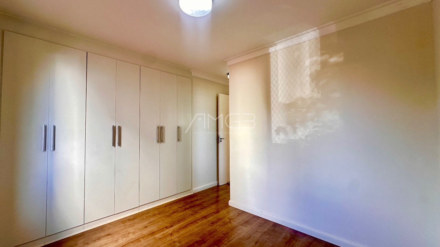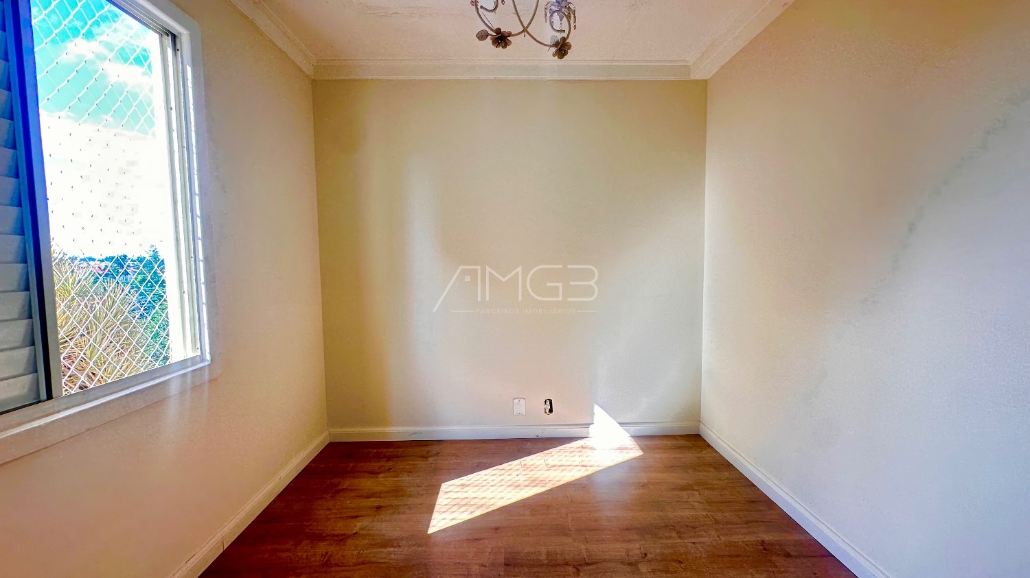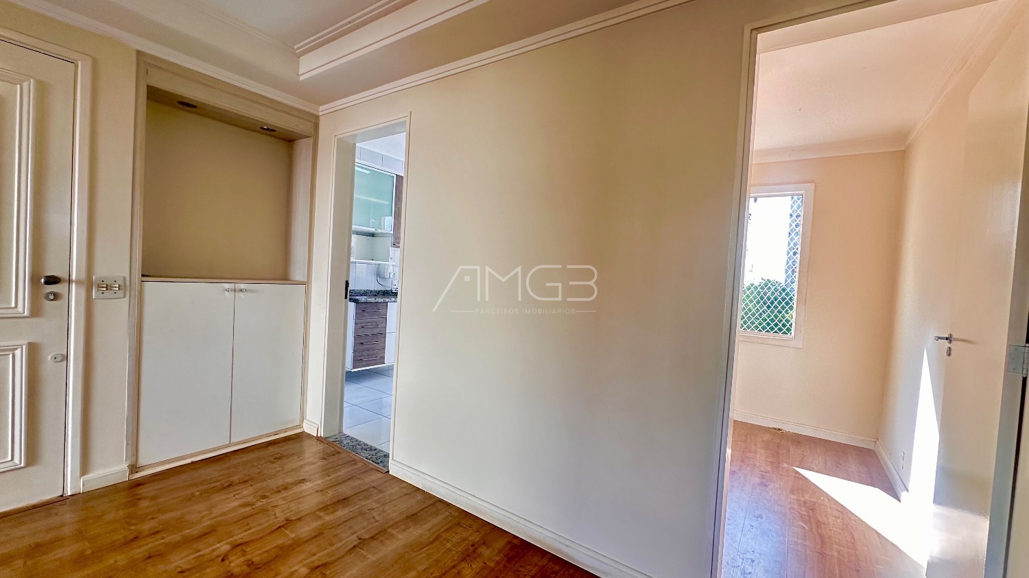 O imóvel conta com três dormitórios, sendo uma suíte com armários planejados, cuba sobreposta e bancada em mármore travertino. Os outros dois quartos são amplos, bem iluminados e contam com lustres de estilo clássico, prontos para personalização conforme o gosto do morador.