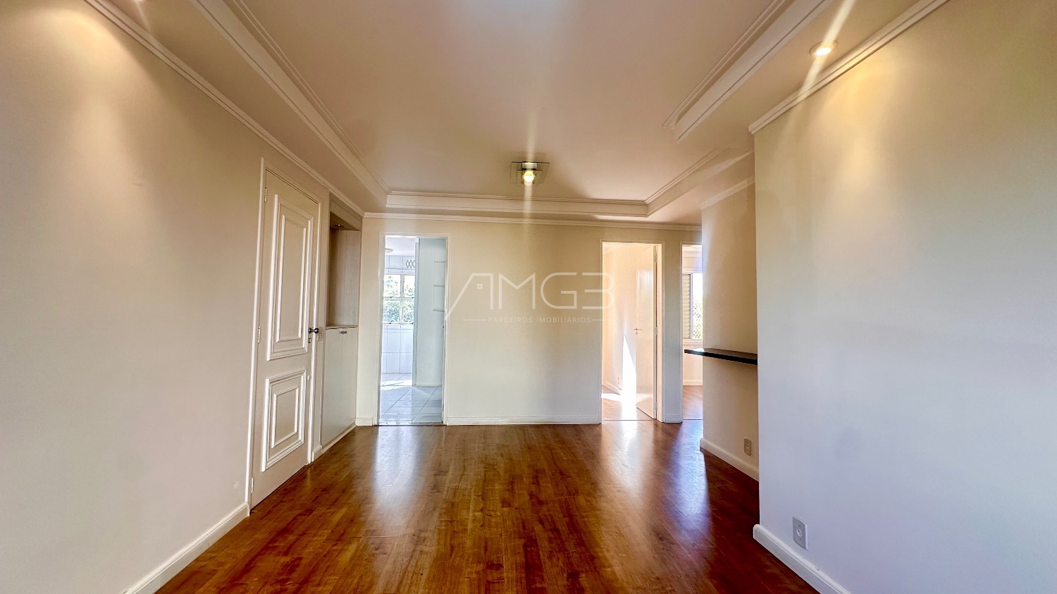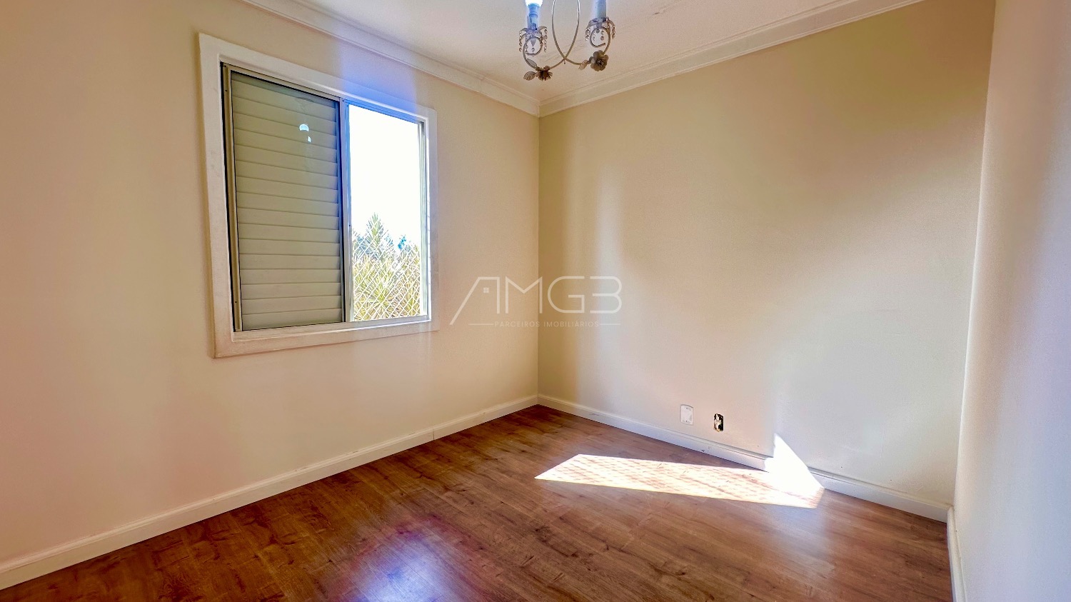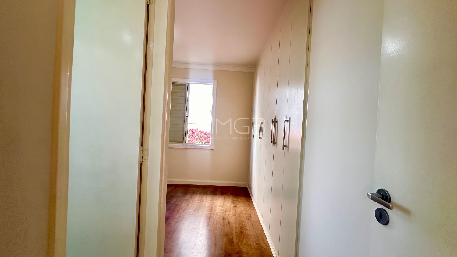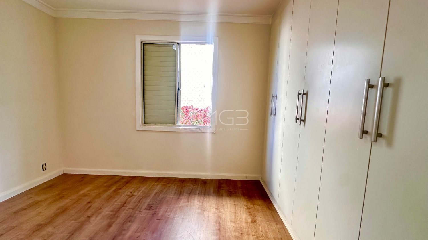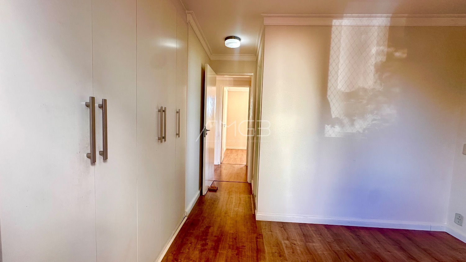 O imóvel conta com três dormitórios, sendo uma suíte com armários planejados, cuba sobreposta e bancada em mármore travertino. Os outros dois quartos são amplos, bem iluminados e contam com lustres de estilo clássico, prontos para personalização conforme o gosto do morador.