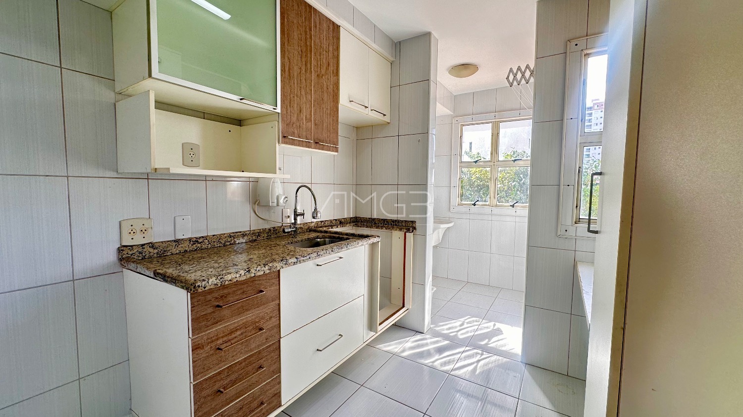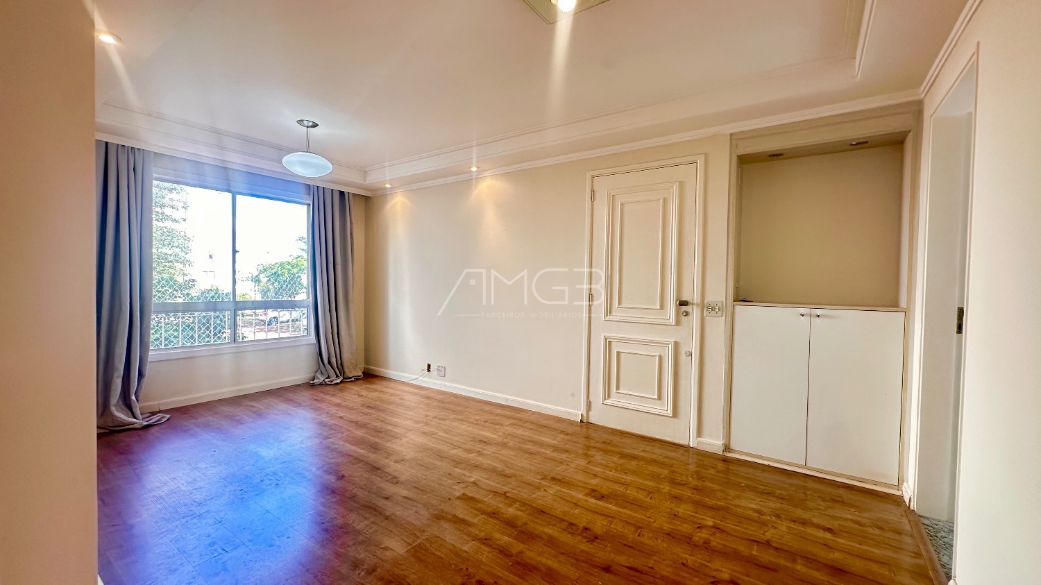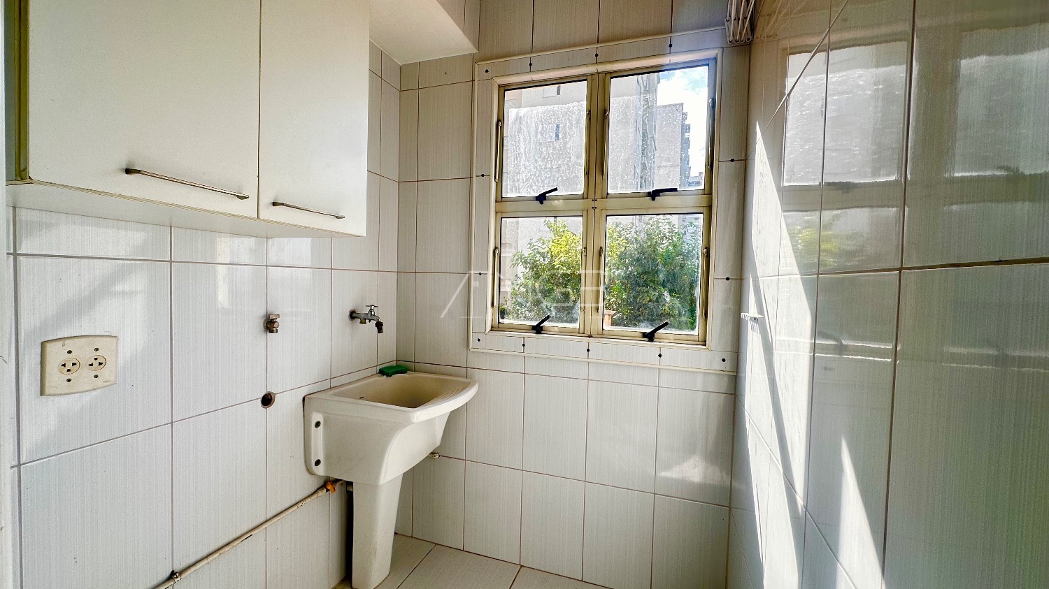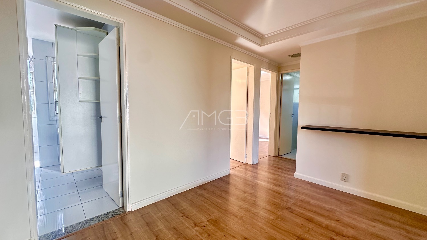 O imóvel conta com três dormitórios, sendo uma suíte com armários planejados, cuba sobreposta e bancada em mármore travertino. Os outros dois quartos são amplos, bem iluminados e contam com lustres de estilo clássico, prontos para personalização conforme o gosto do morador.