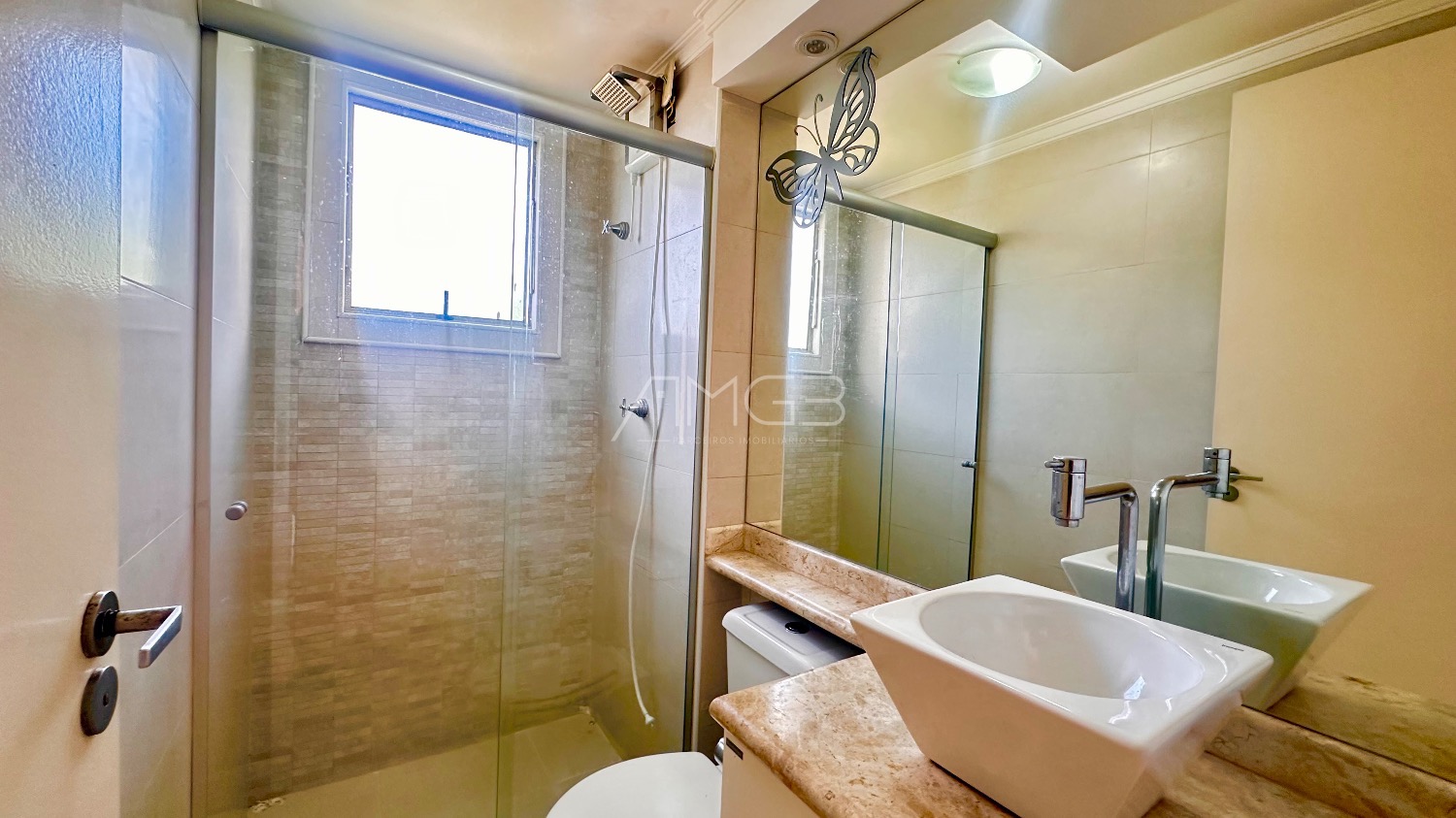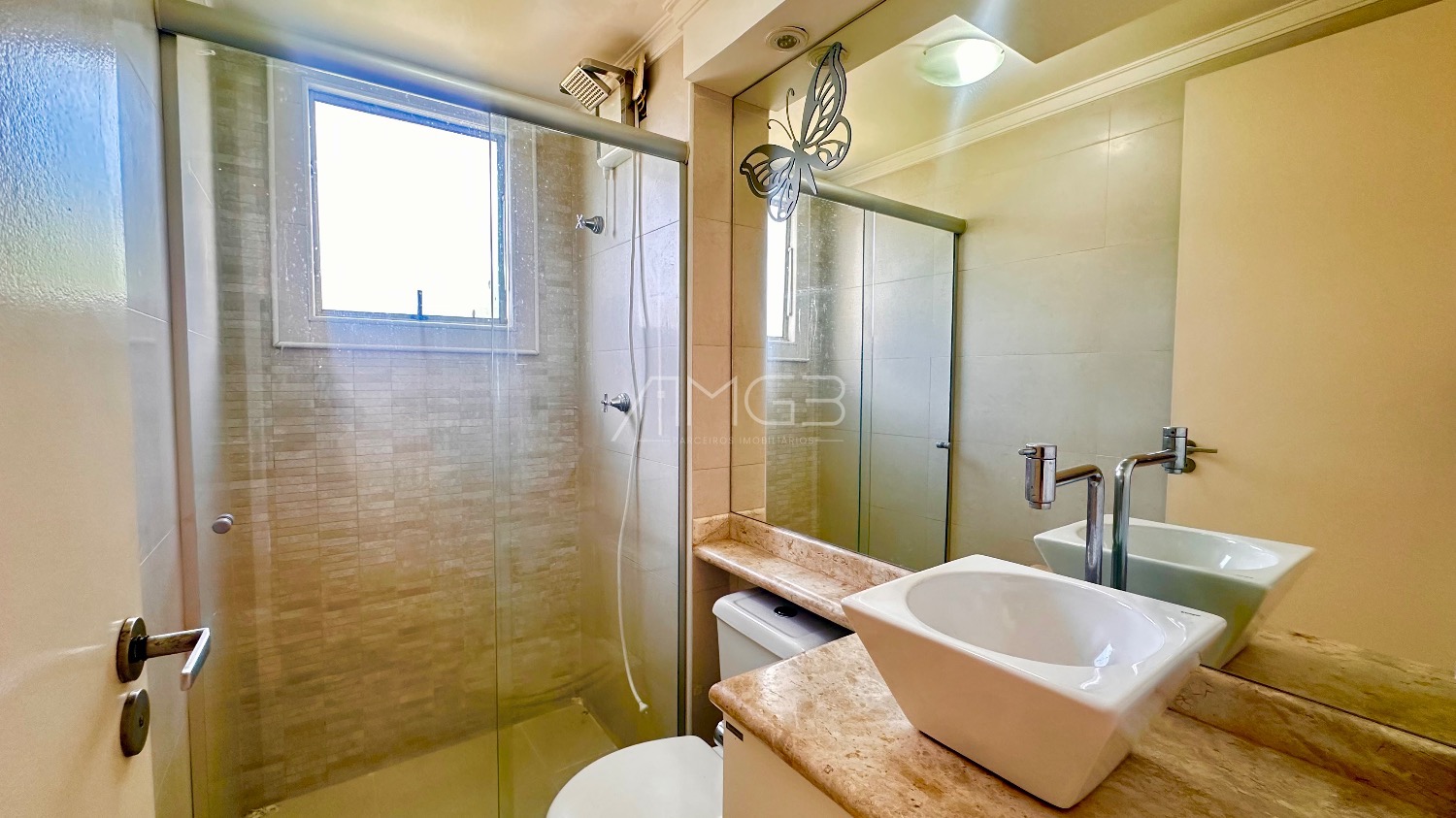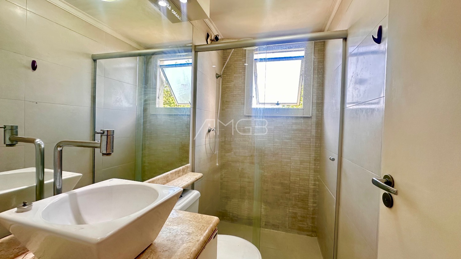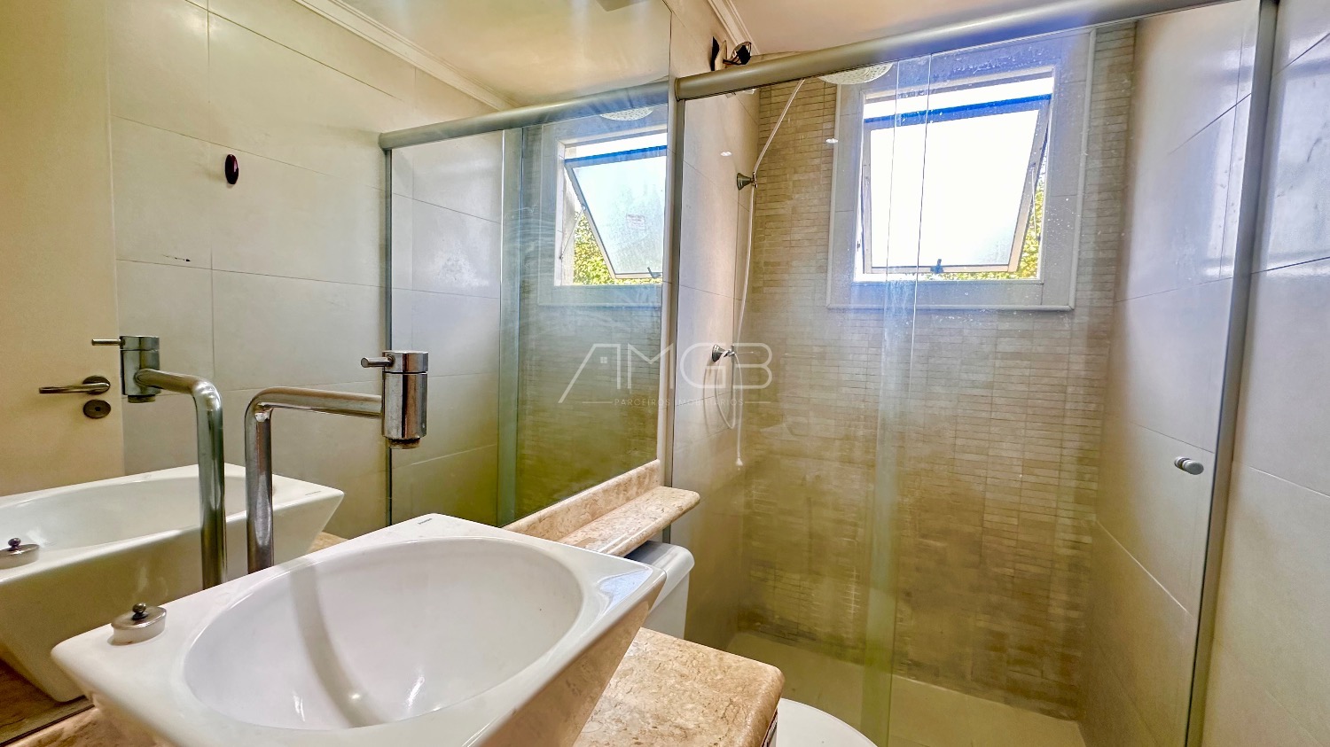 Os banheiros possuem box em vidro temperado e acabamento em mármore travertino.