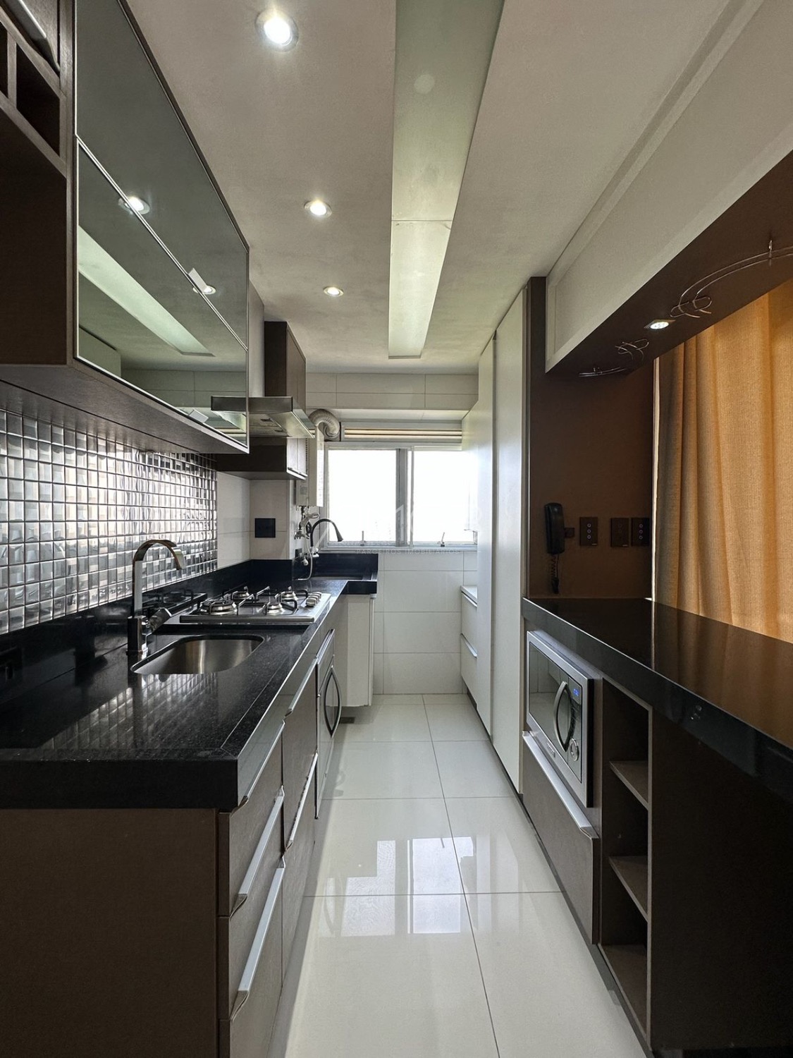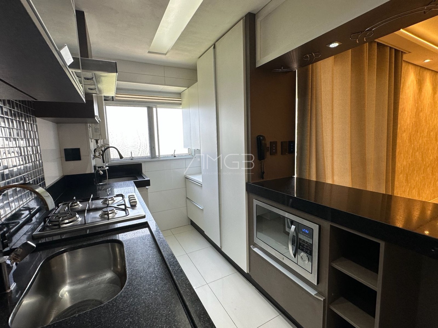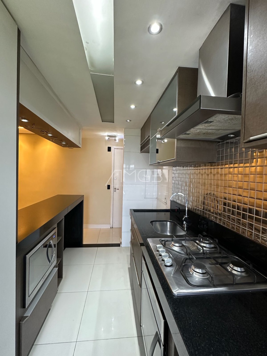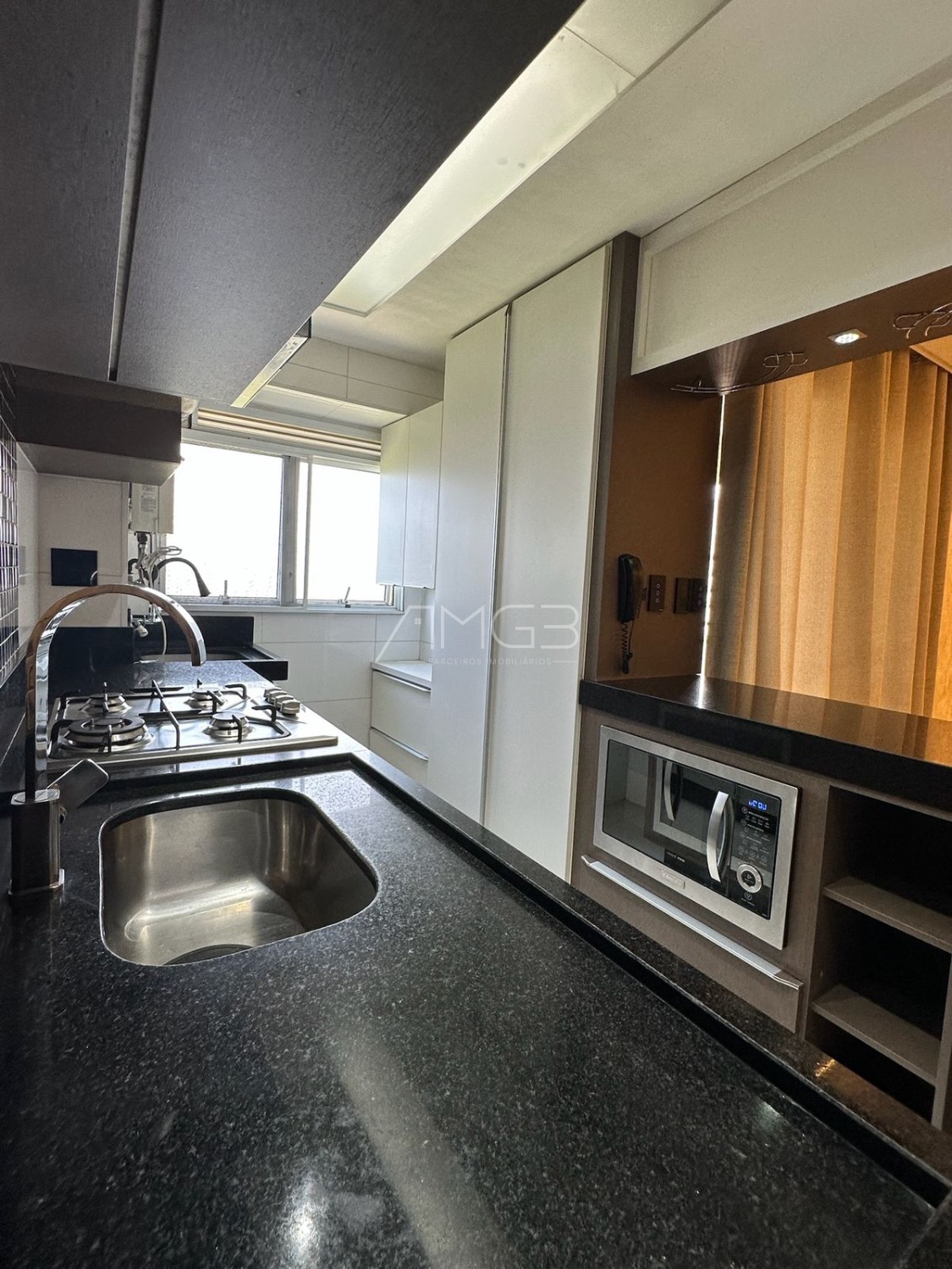 A cozinha é rica em armários, com pia em granito, balcão, coifa, cooktop e forno embutido.