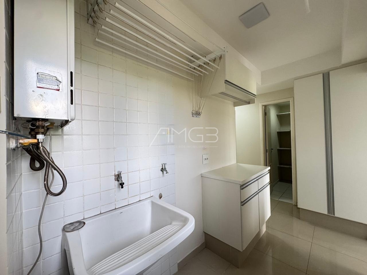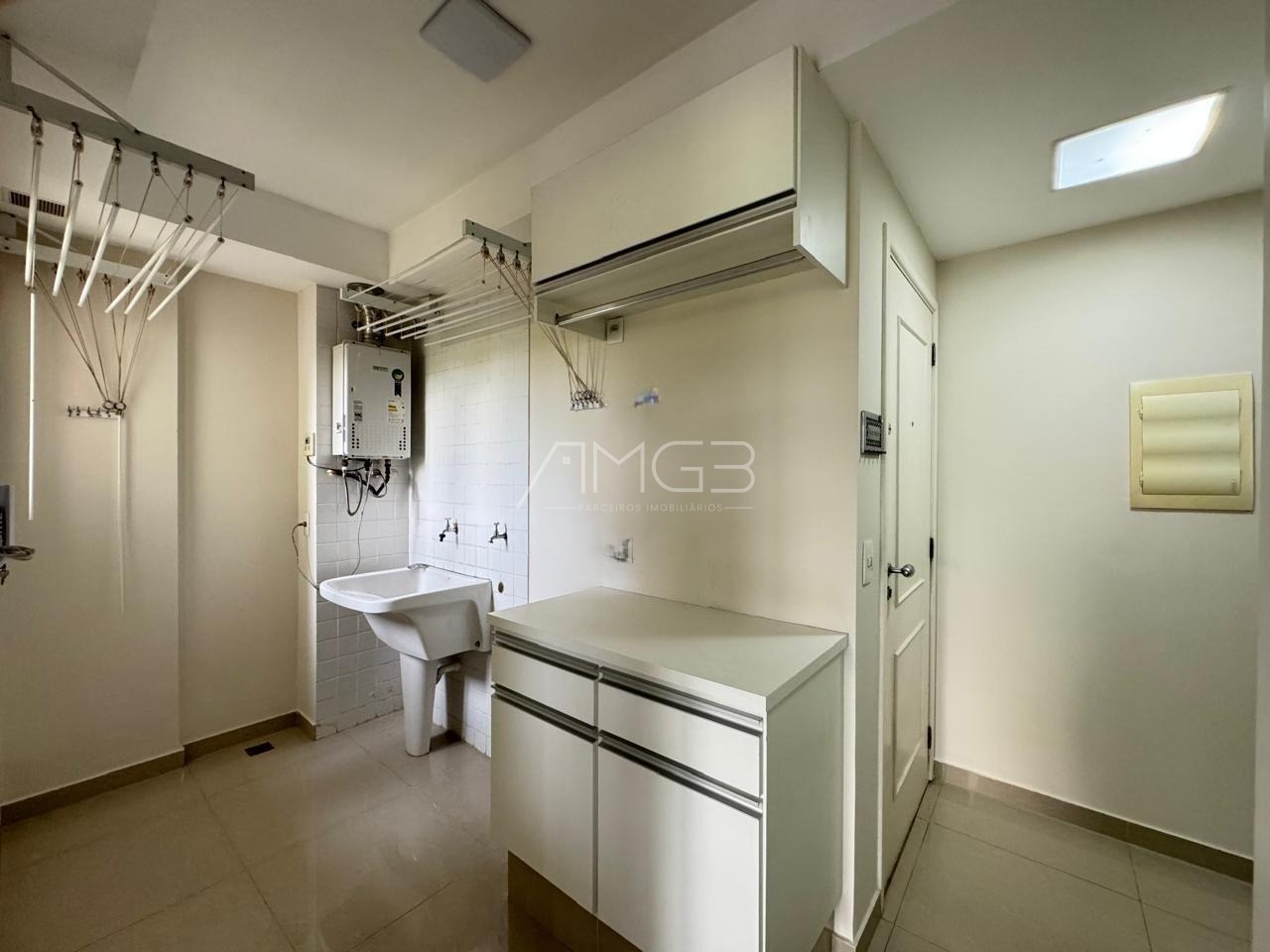 A área de serviço também possui móveis planejados e banheiro de apoio, garantindo mais organização e comodidade na rotina.