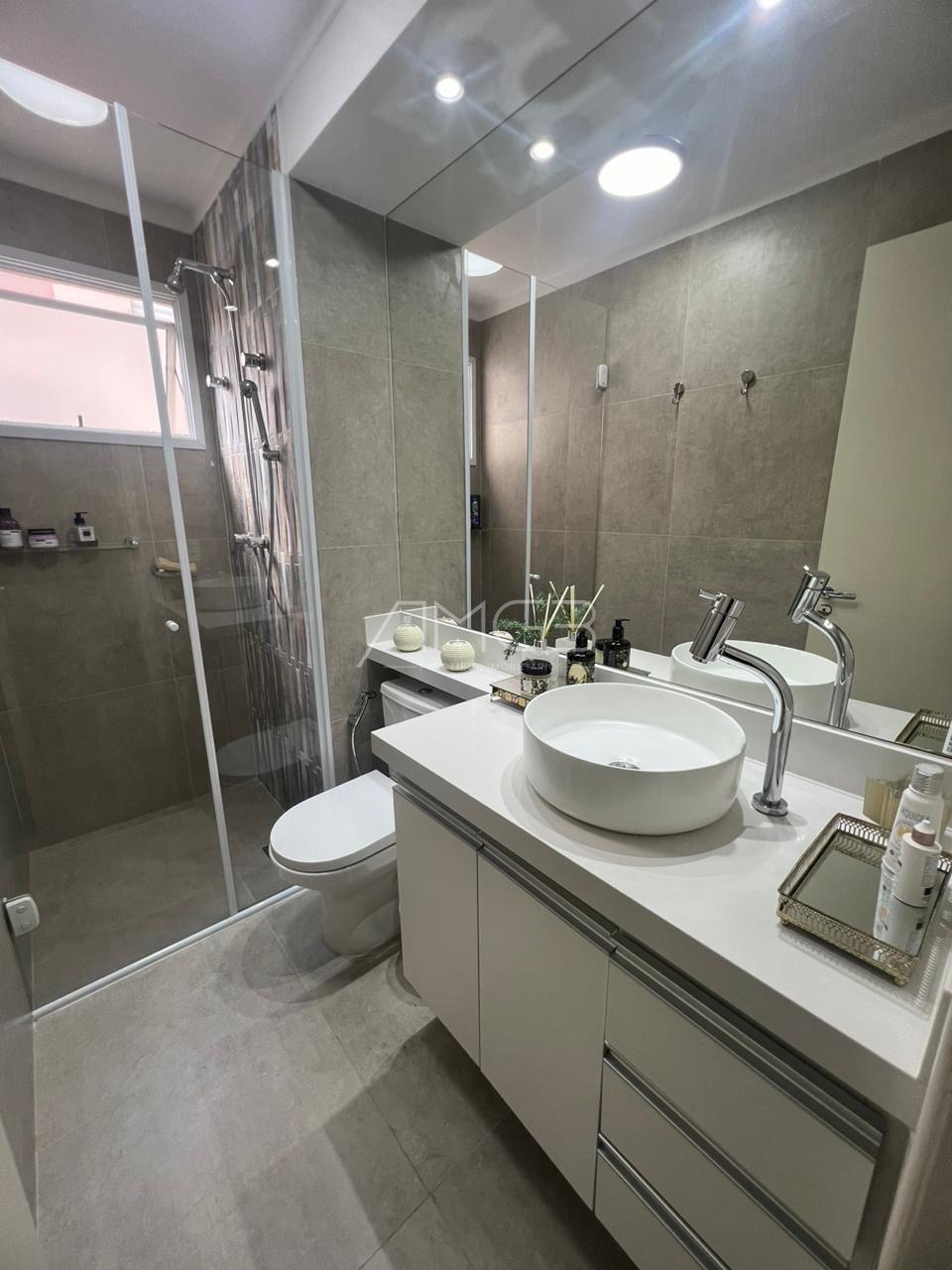Banheiro com cuba sobreposta, box tipo blindex, Metais de banheiro Deca, parede com pedra na sala, persiana de metal.