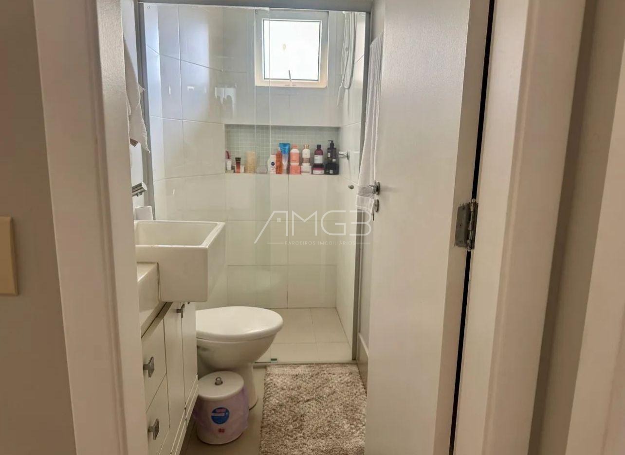 Banheiro completo com armário, espelho amplo e box blindex