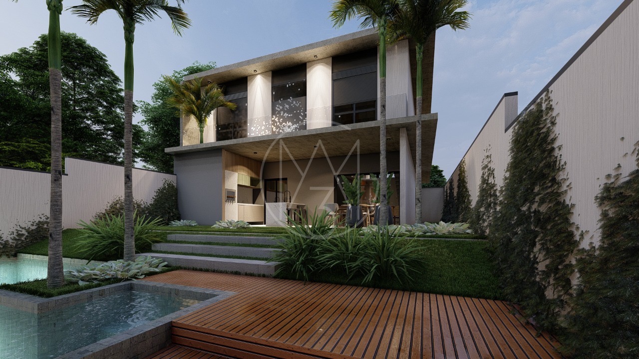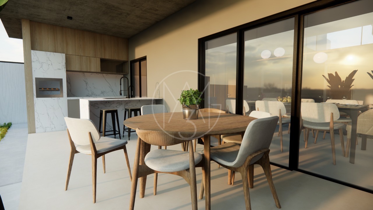 Linda área gourmet com churrasqueira, integrada junto ao quintal com piscina.