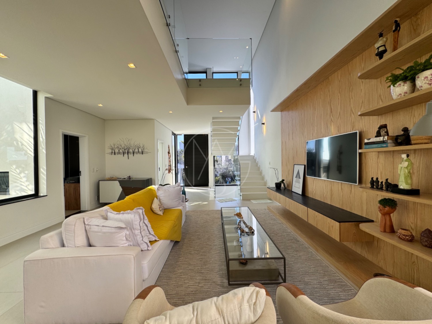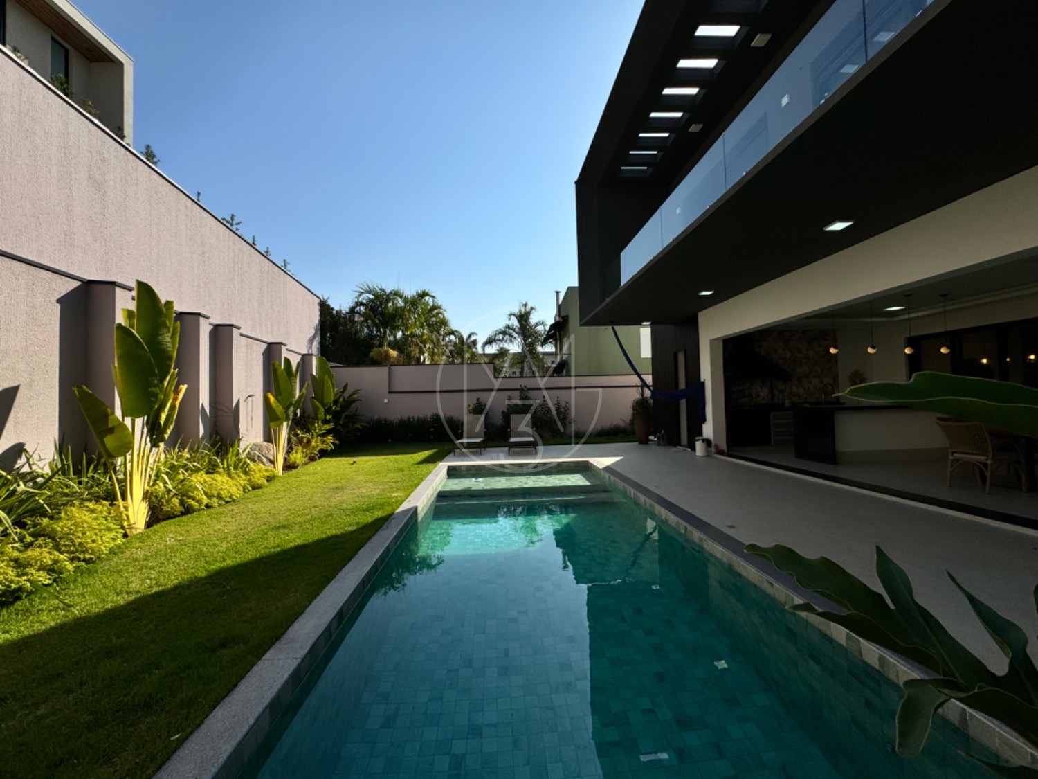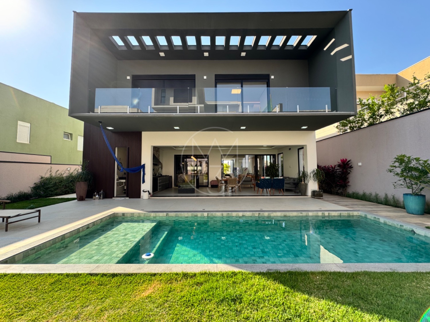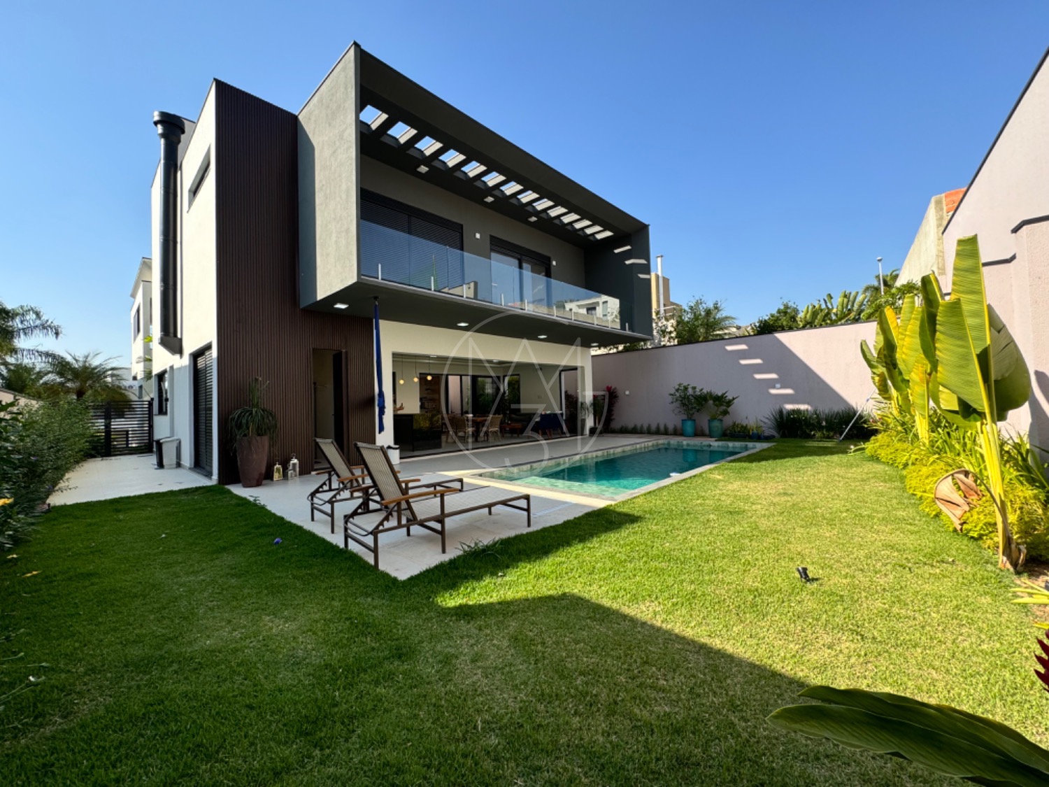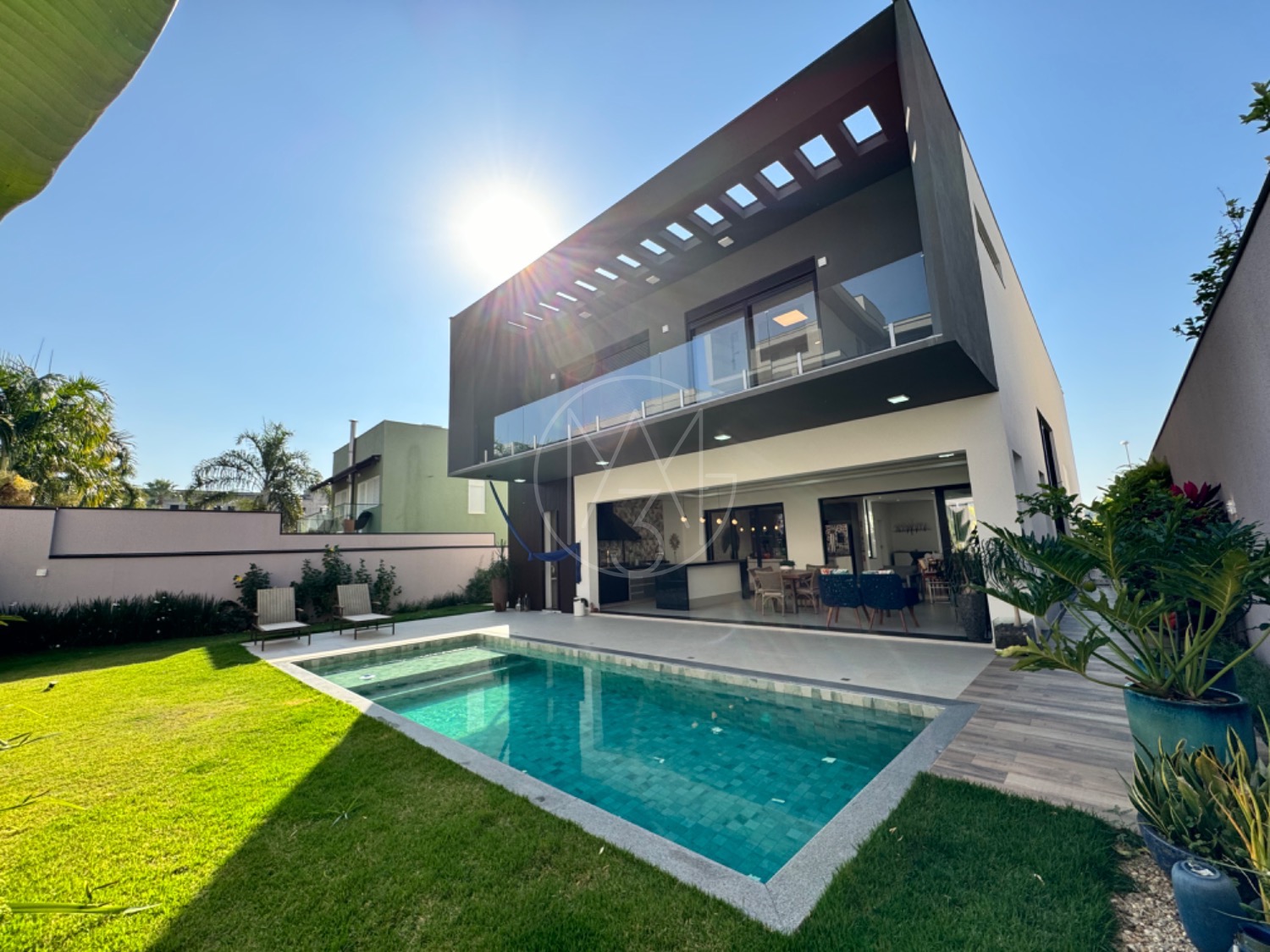 Sobrado de 440m², 4 suítes (1 no andar térreo), suíte máster com closet e banheira de imersão, sala de estar ampla, com pé direito alto, cozinha integrada, escritório, área de lazer com espaço gourmet e piscina aquecida.