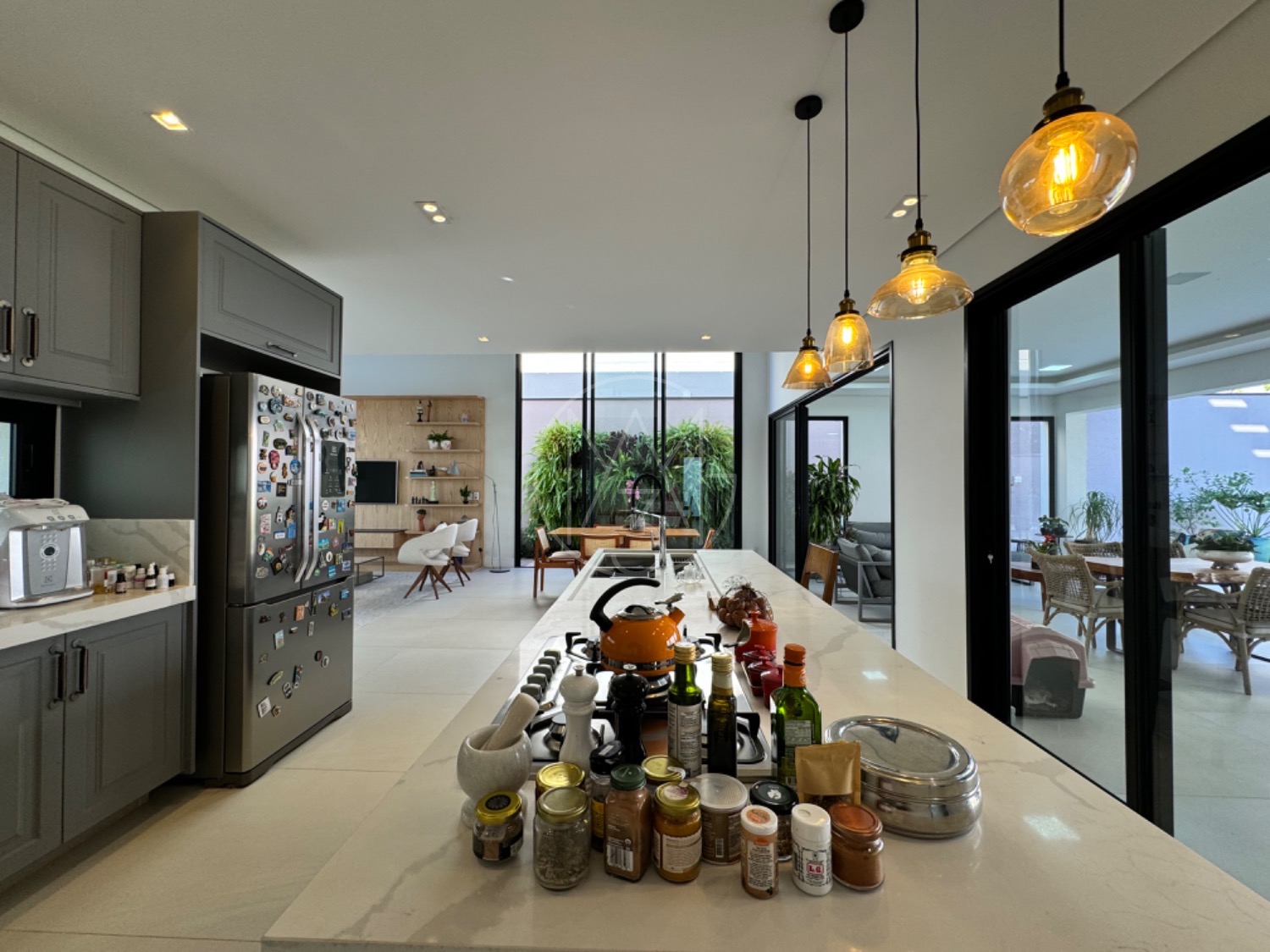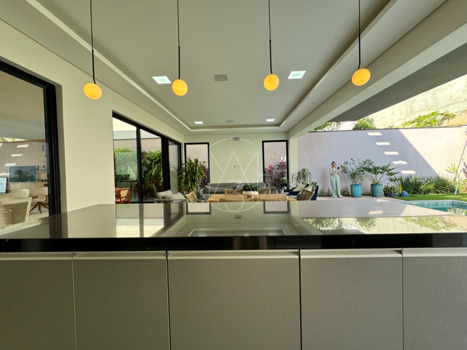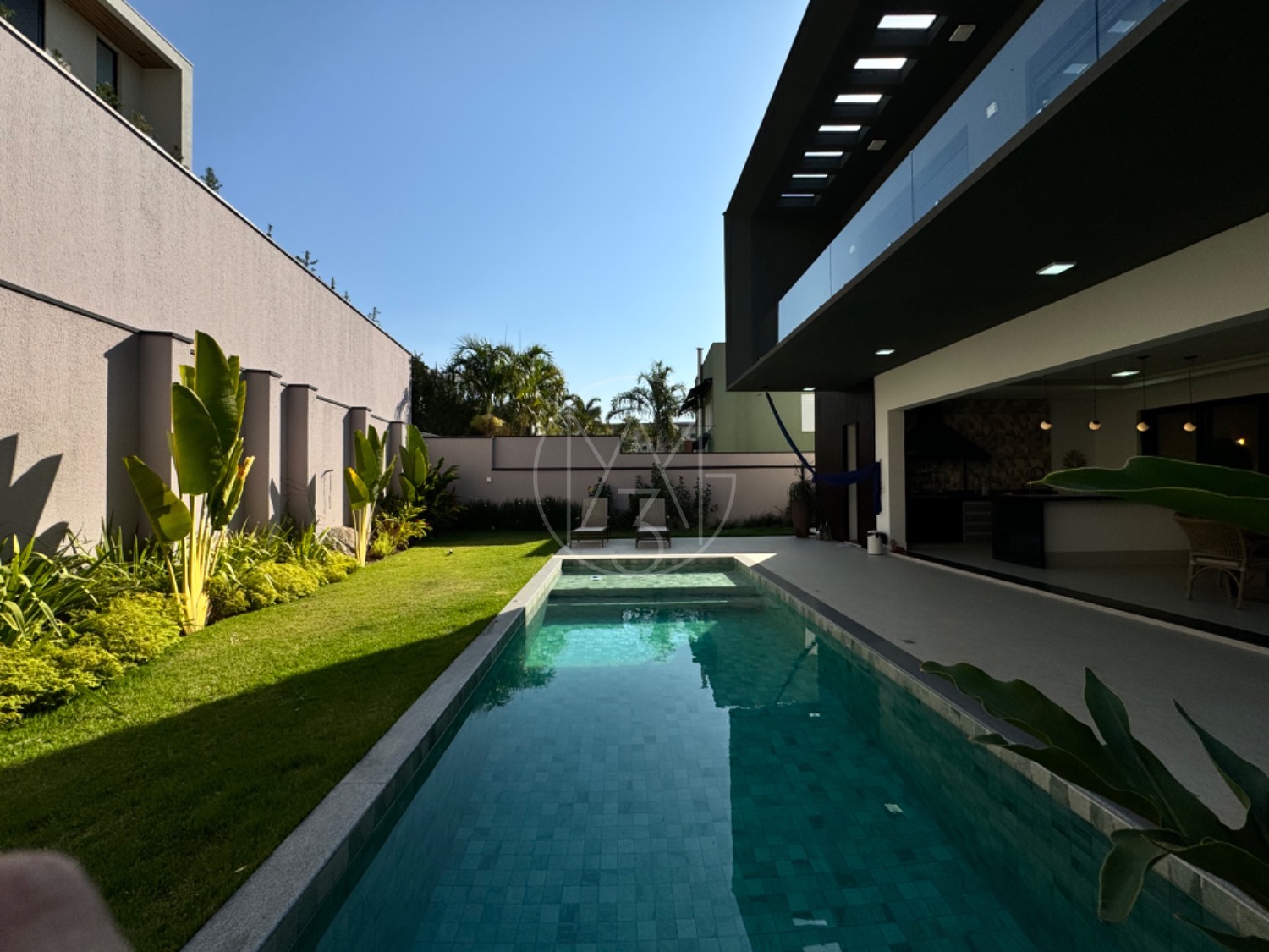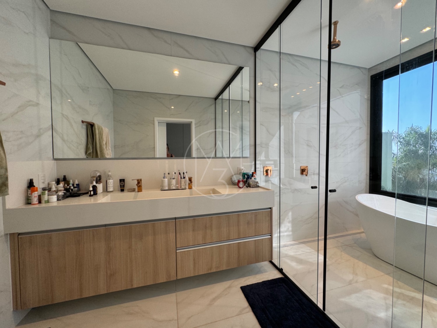 Sobrado de 440m², 4 suítes (1 no andar térreo), suíte máster com closet e banheira de imersão, sala de estar ampla, com pé direito alto, cozinha integrada, escritório, área de lazer com espaço gourmet e piscina aquecida.