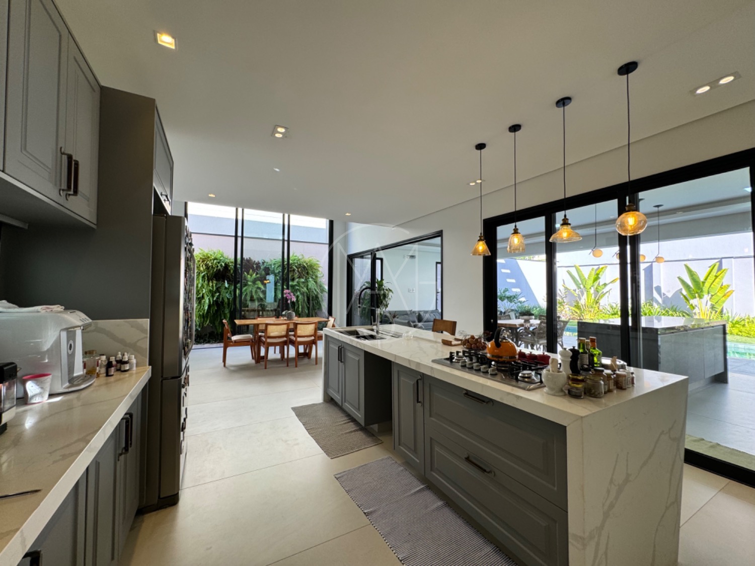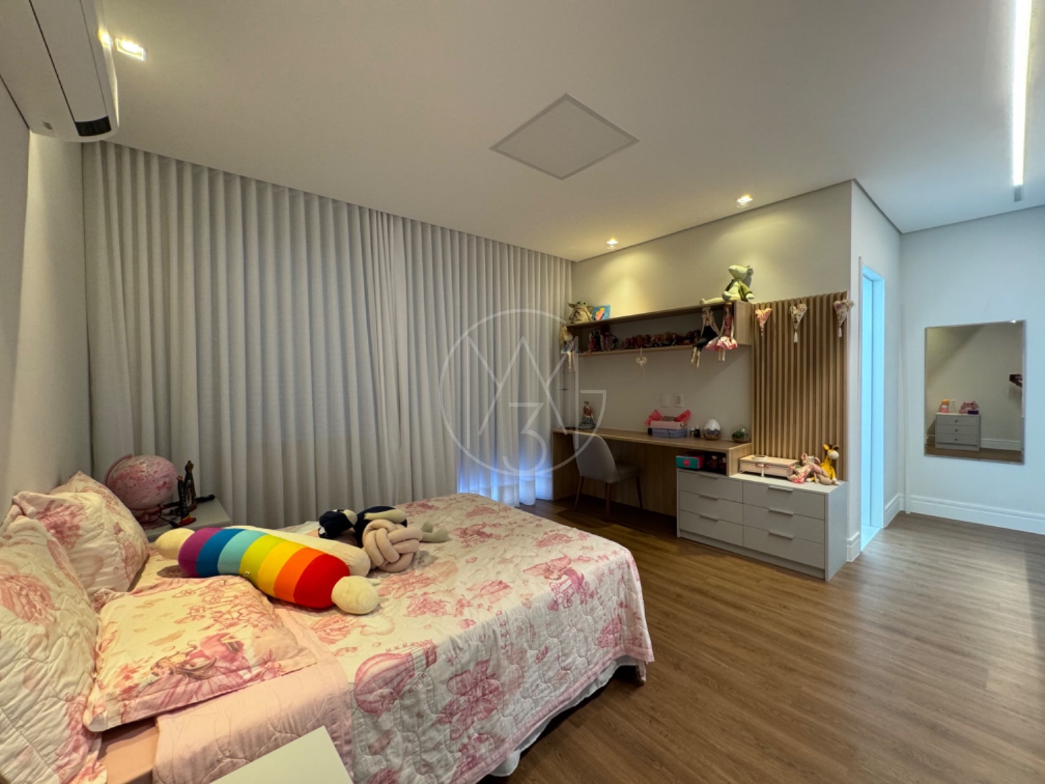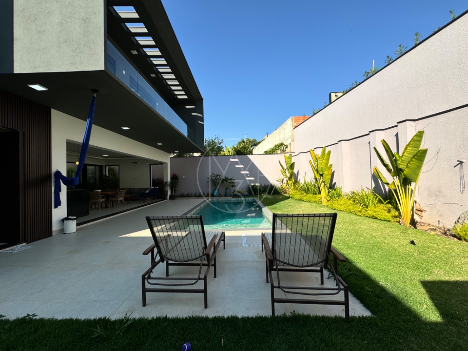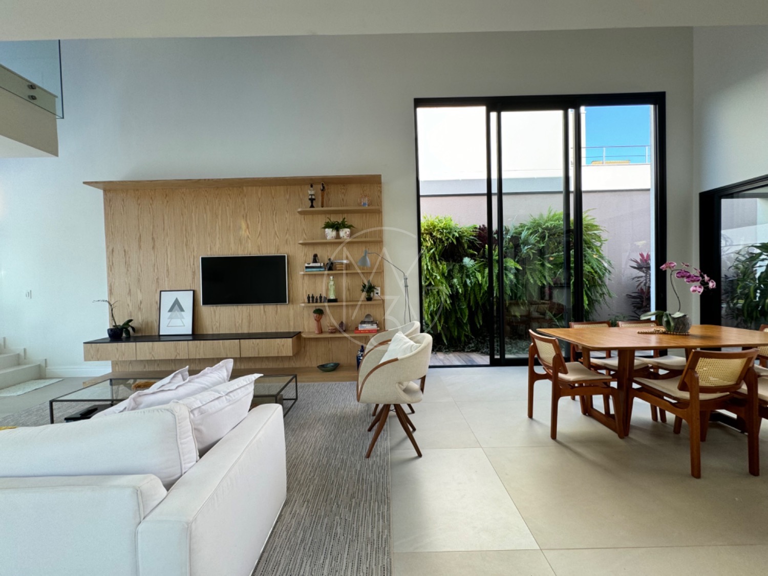 Sobrado de 440m², 4 suítes (1 no andar térreo), suíte máster com closet e banheira de imersão, sala de estar ampla, com pé direito alto, cozinha integrada, escritório, área de lazer com espaço gourmet e piscina aquecida.