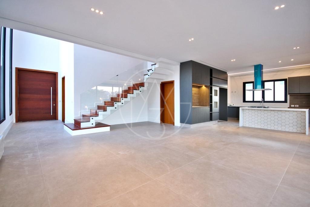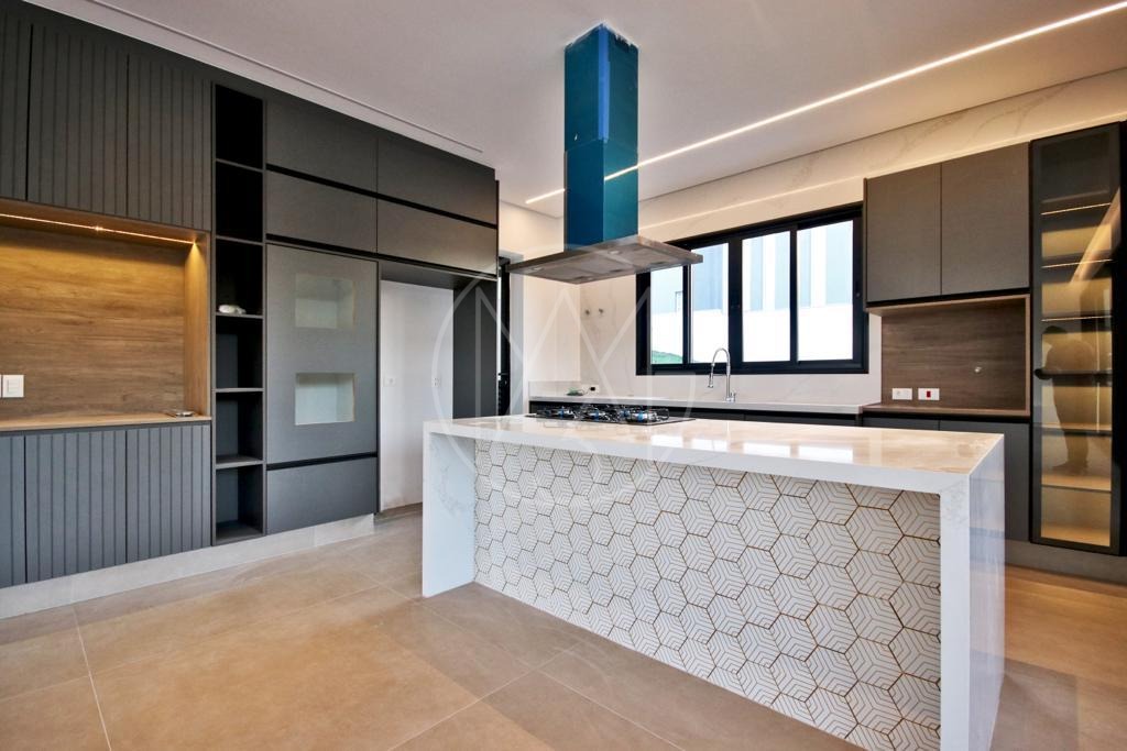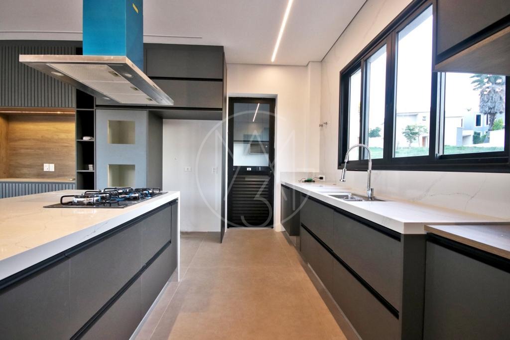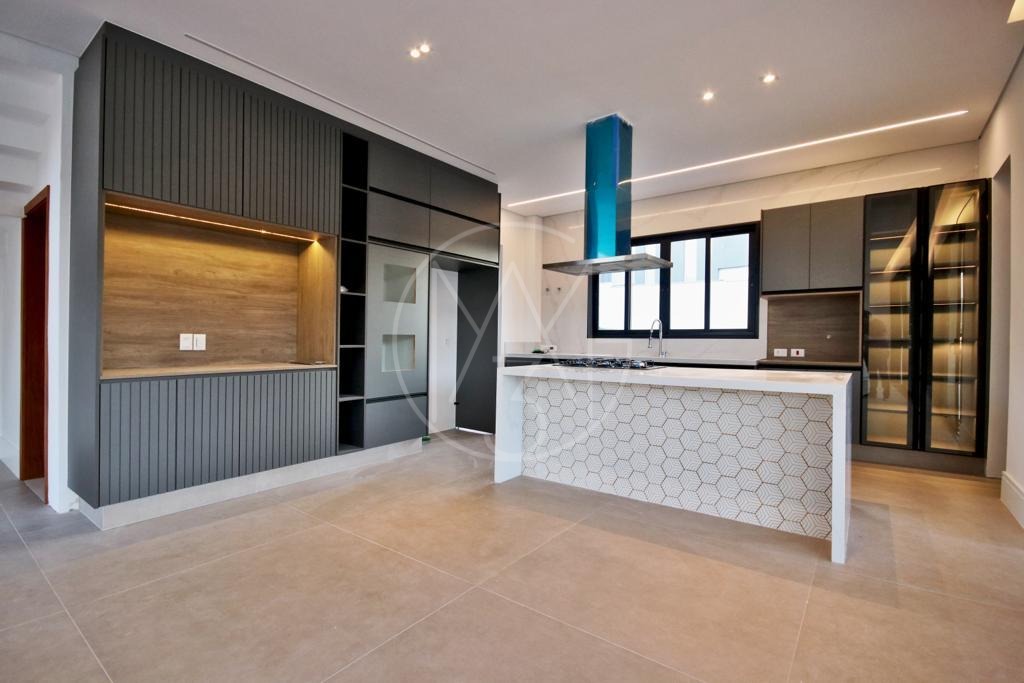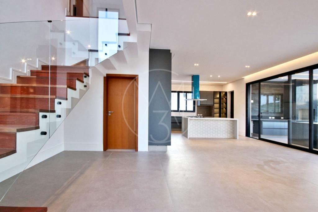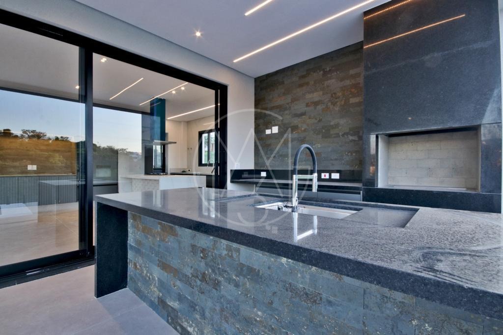 1 suíte no andar térreo , que pode ser utilizado como escritório, living de 2 ambientes , com lareira, cozinha americana , com dispensa , armários , cook-top e coifa, espaço gourmet ( churrasqueira ) com armários na bancada,
