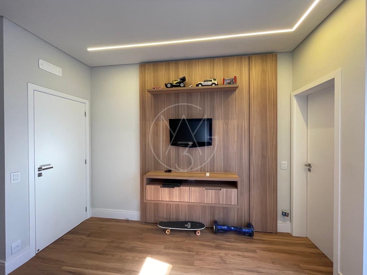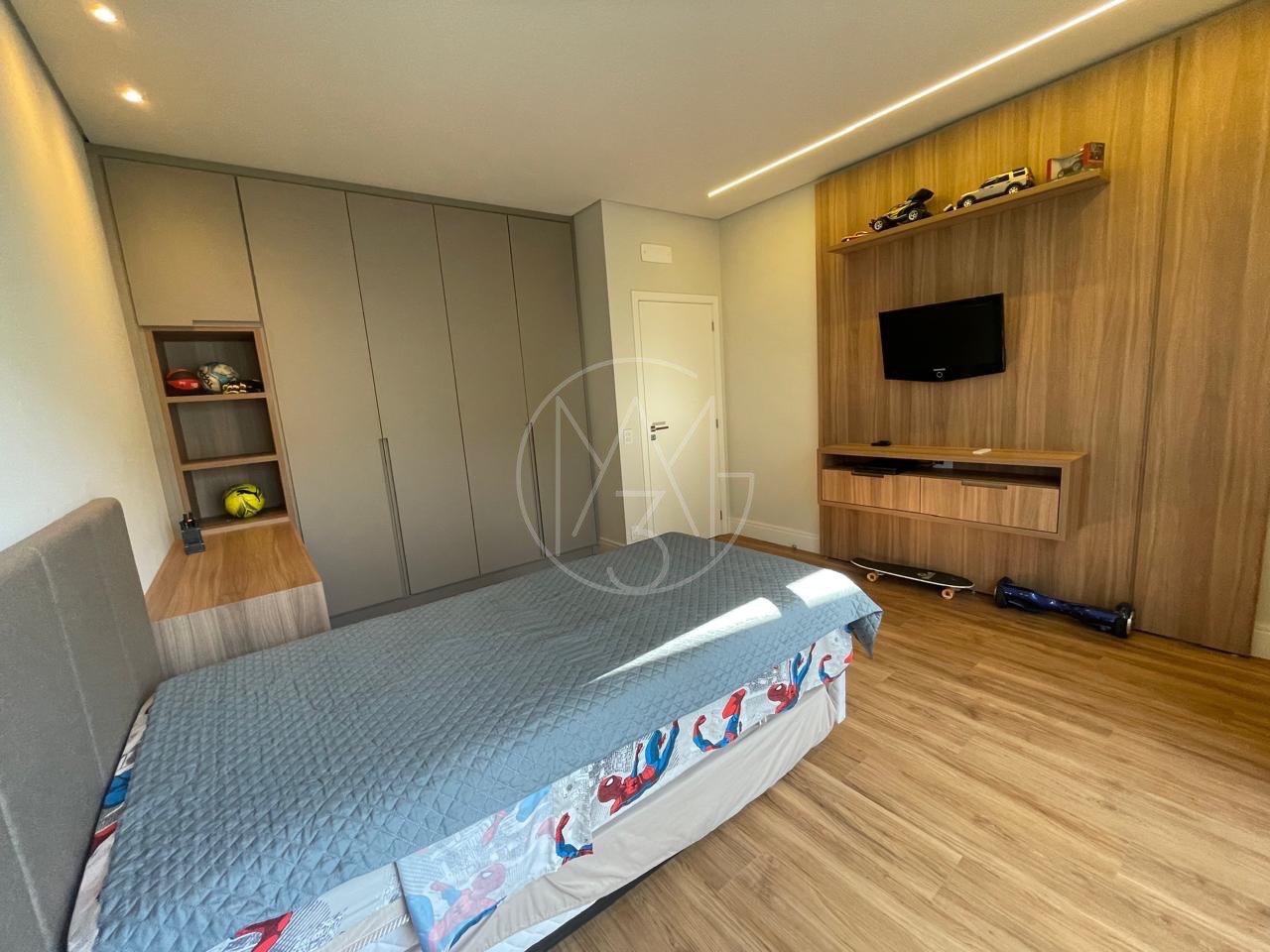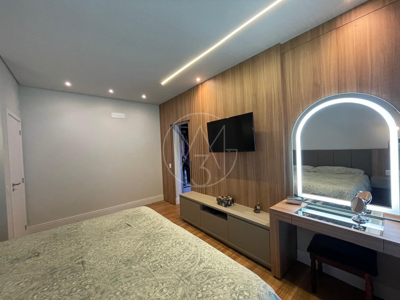 São 5 quartos no total, todas suítes sendo 3 no pavimento superior e 2 no inferior e total de 7 banheiros.
