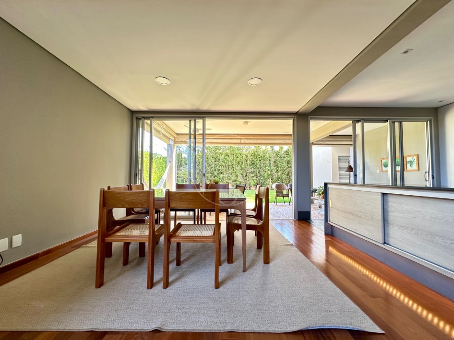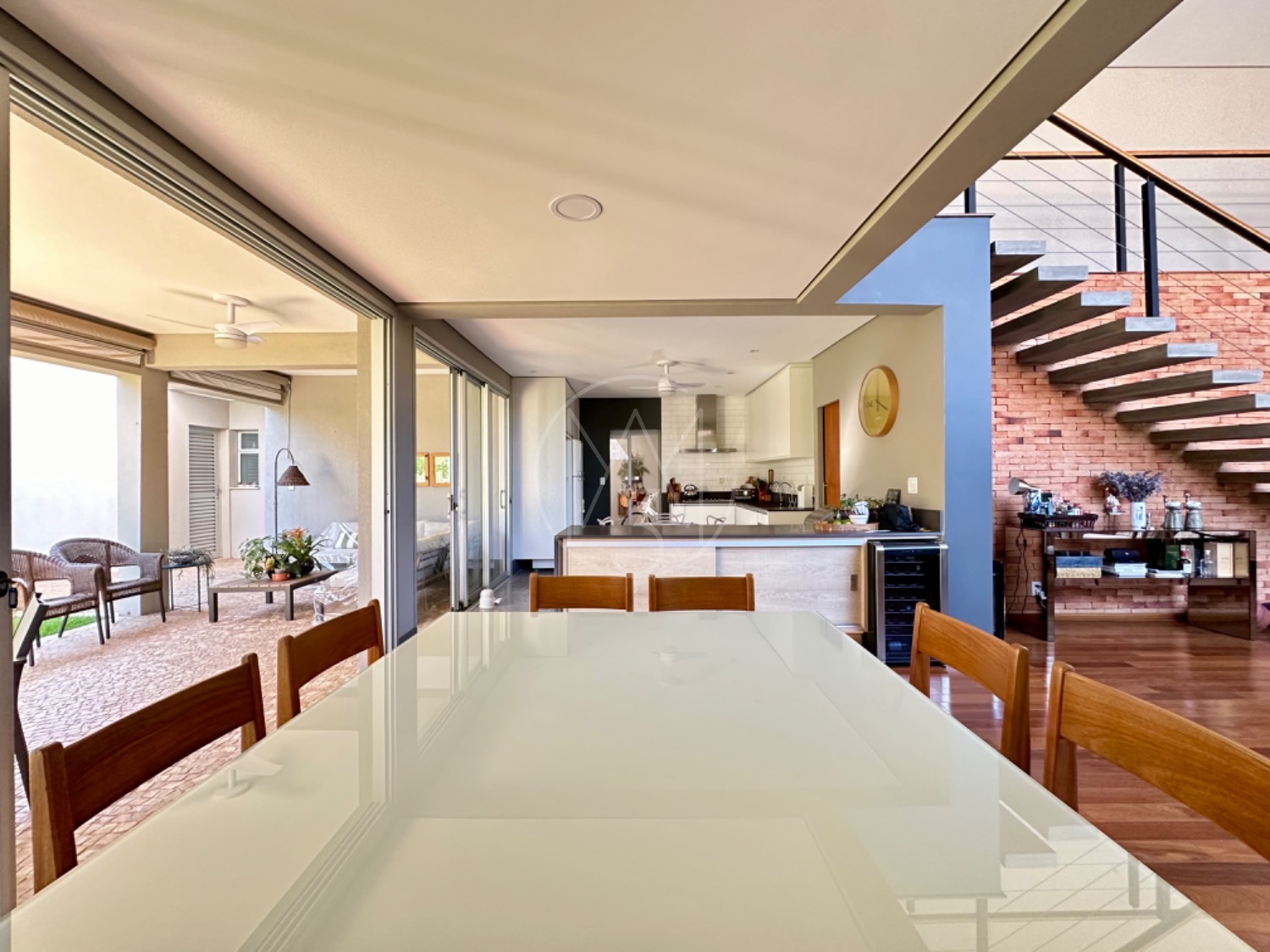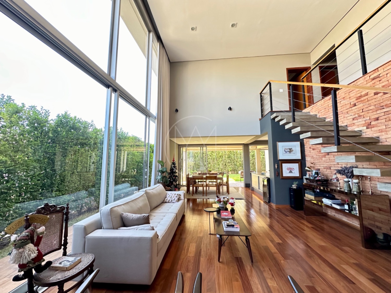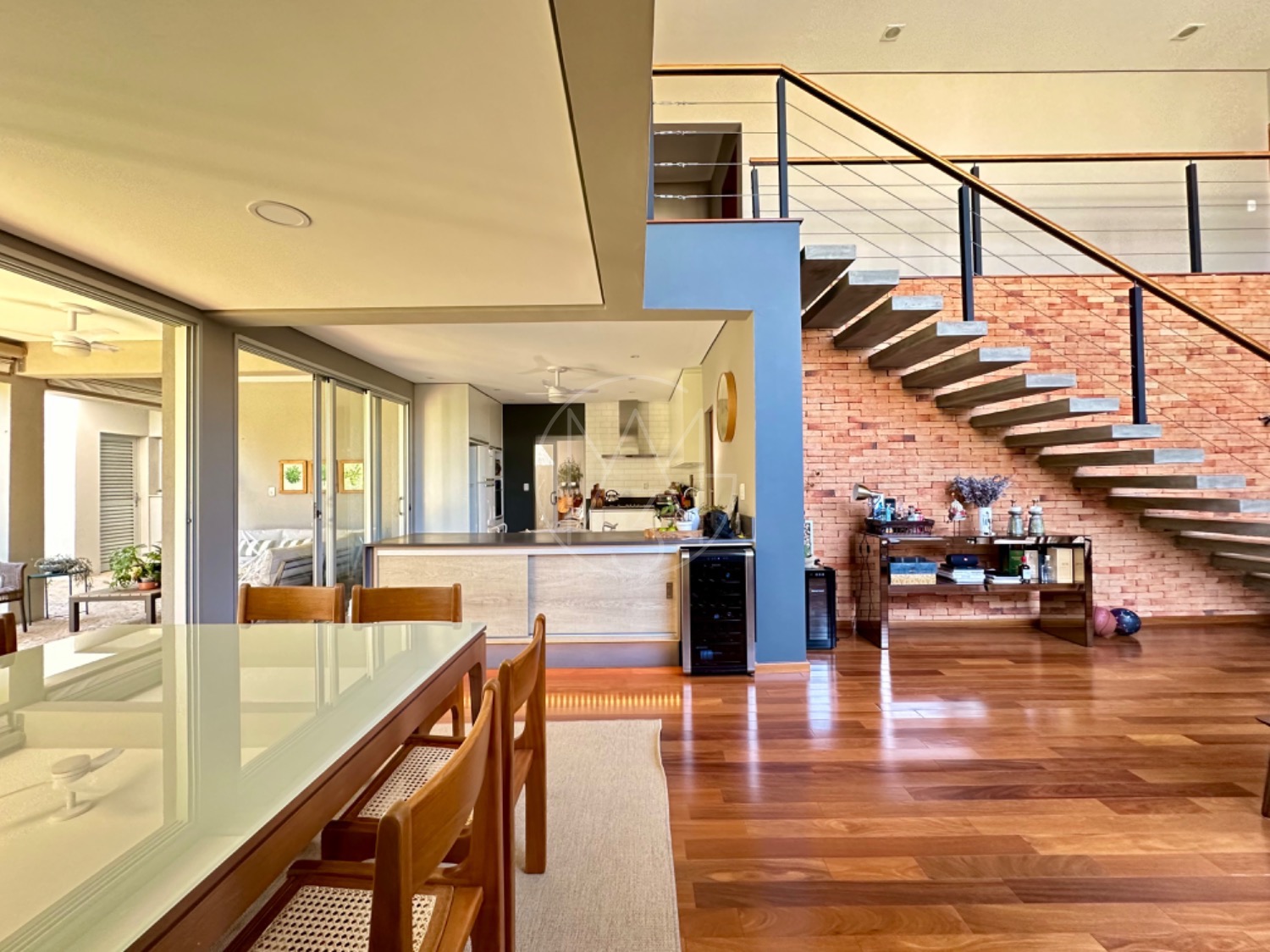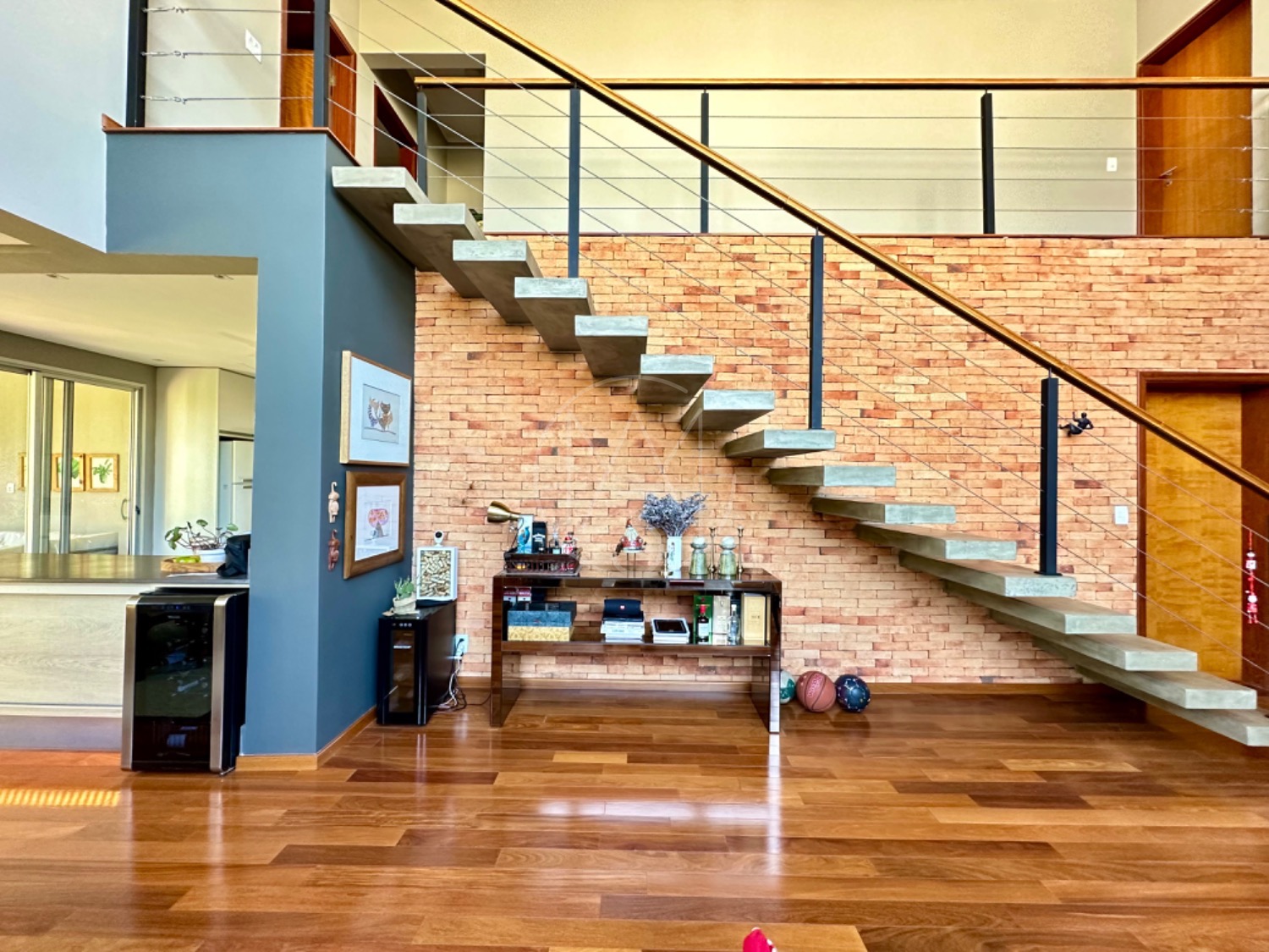 Ao adentrar nesta casa, é impossível não se impressionar com a sala espaçosa e bem iluminada, com um pé direito duplo que traz uma sensação de grandiosidade. Destaque para a parede de tijolinhos que traz conforto e um um charme especial ao ambiente. O piso Indusparquet e as esquadrias de alta qualidade, evidenciam a preocupação da proprietária em oferecer uma construção de alto padrão.