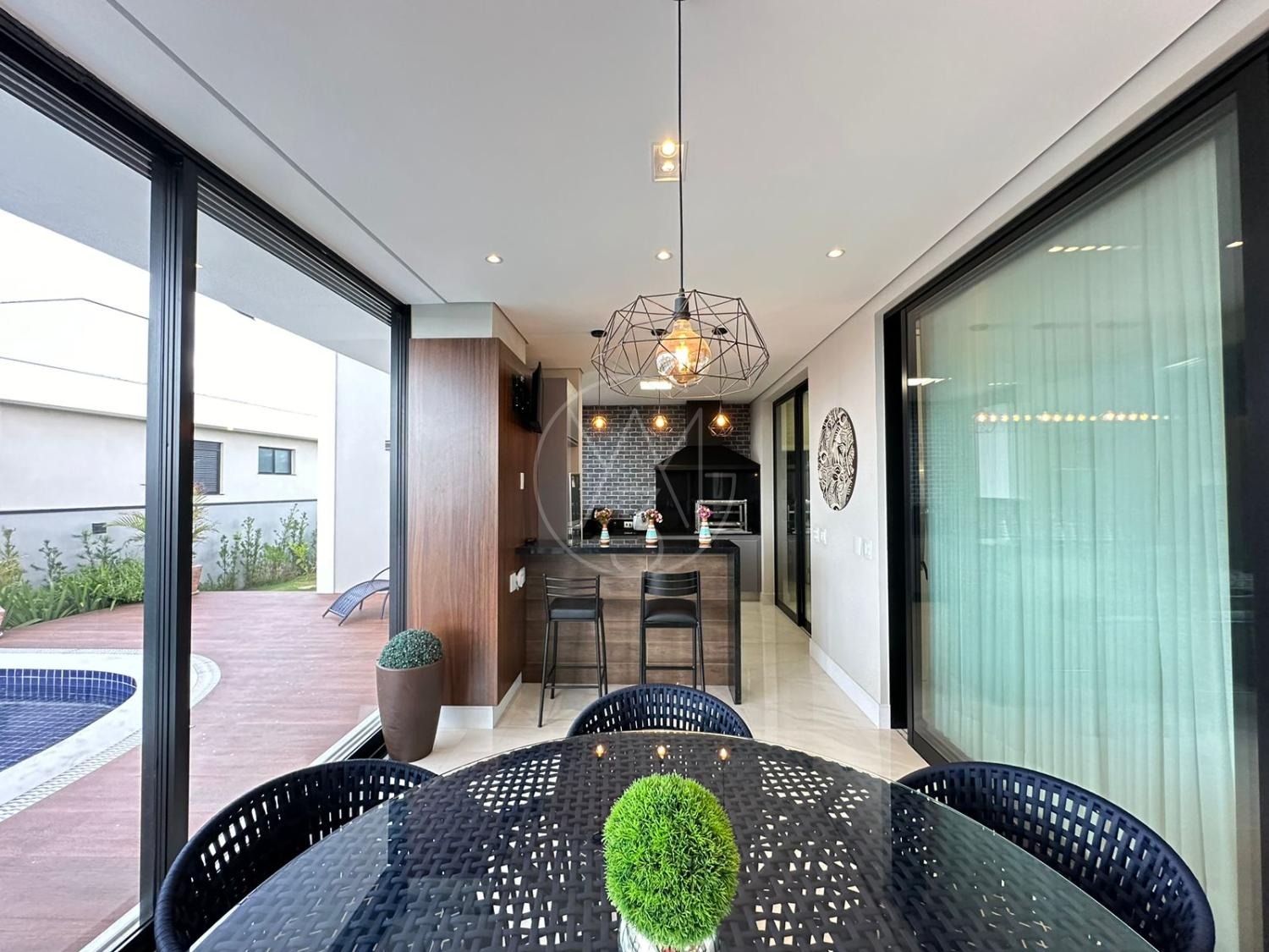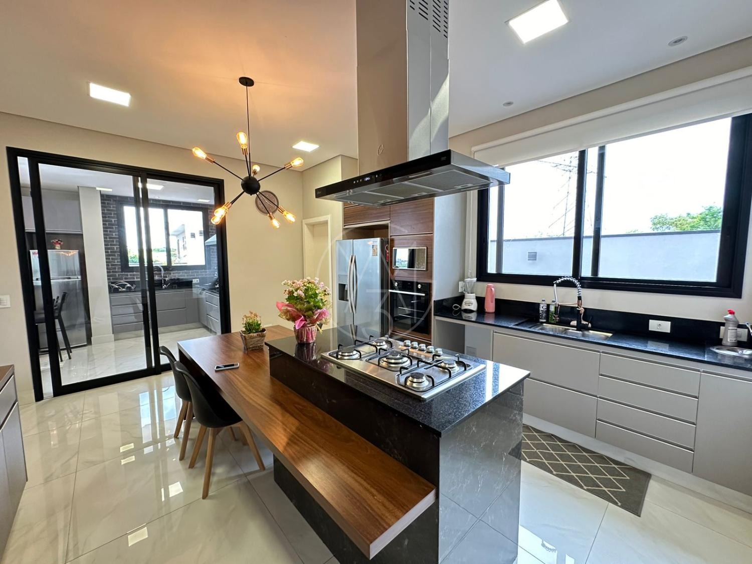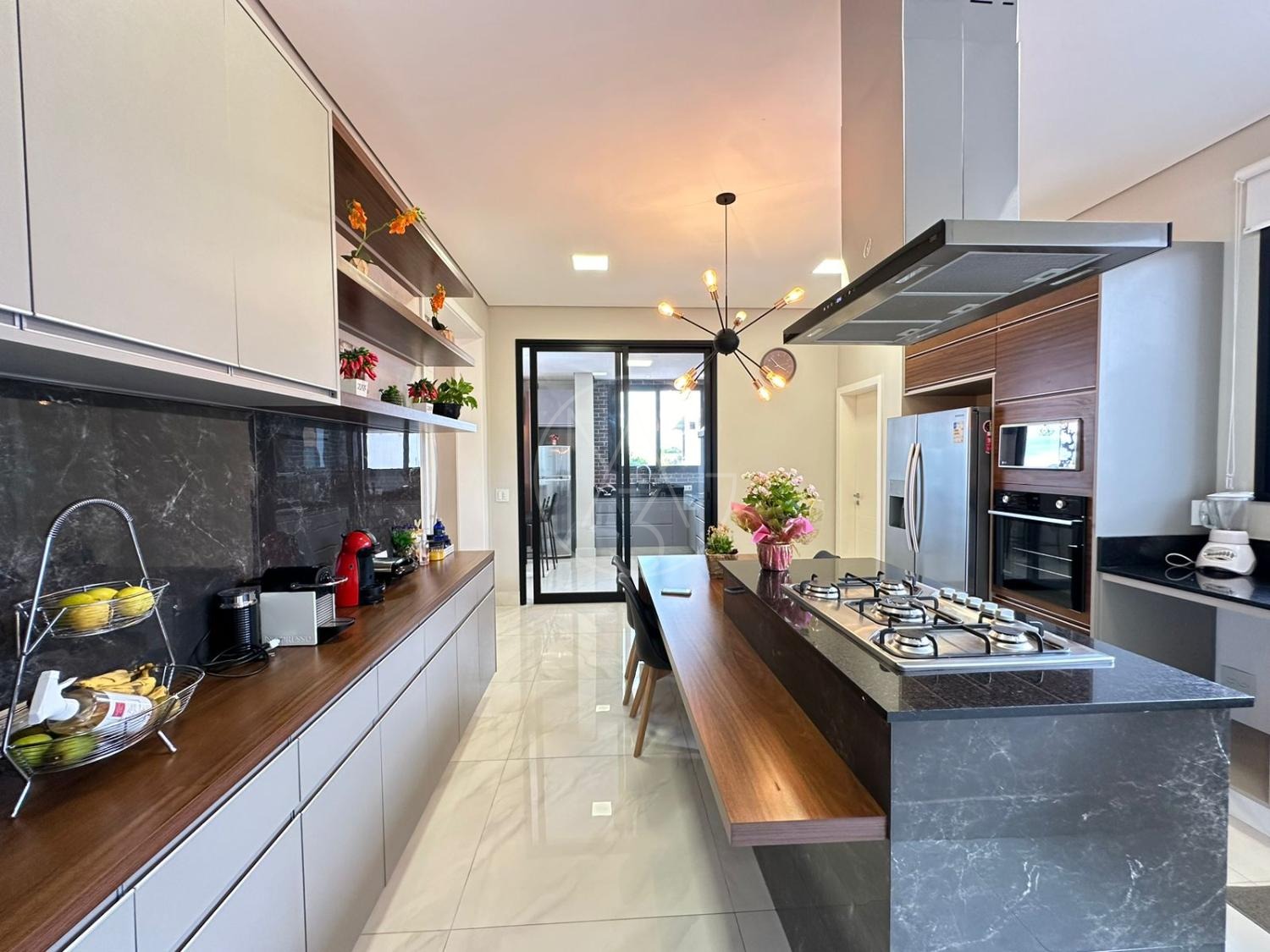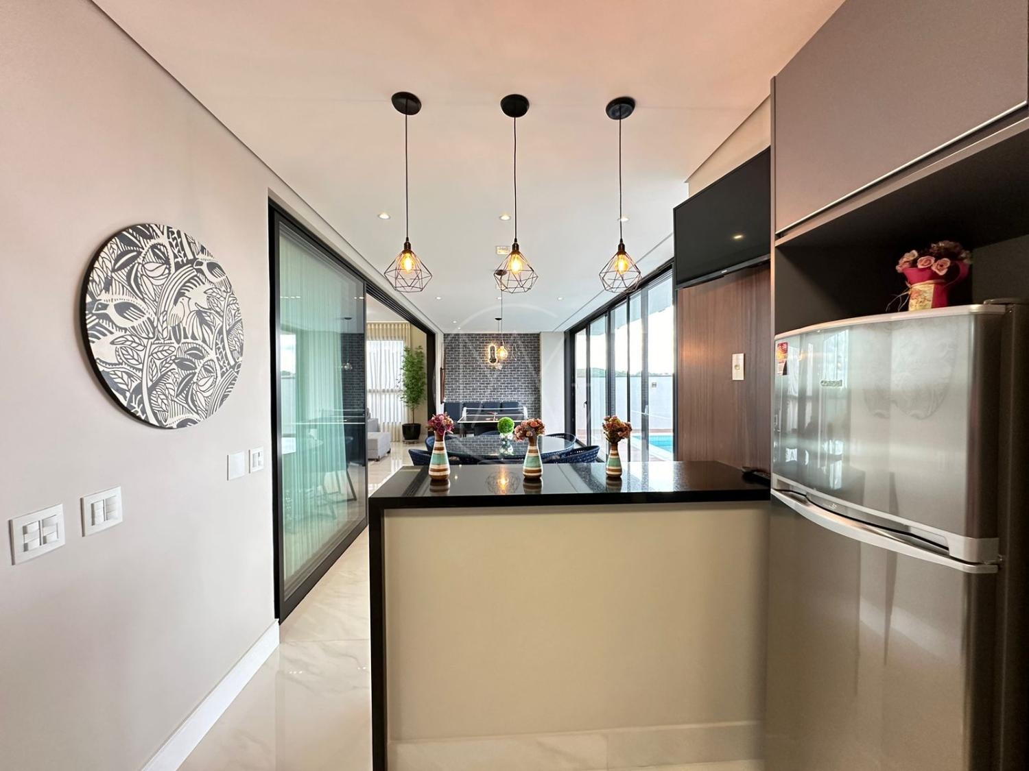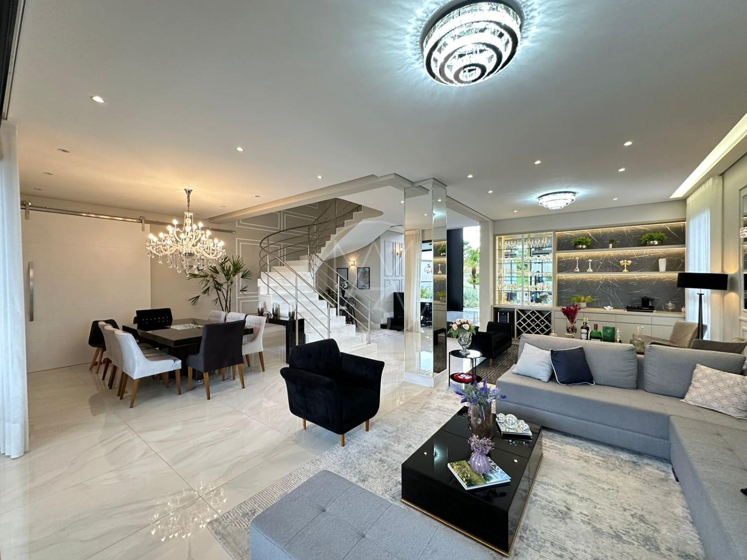 Pavimento inferior com sala de estar/jantar integradas com área gourmet e área externa, totalmente flexível com ambientes mantidos abertos ou fechados.