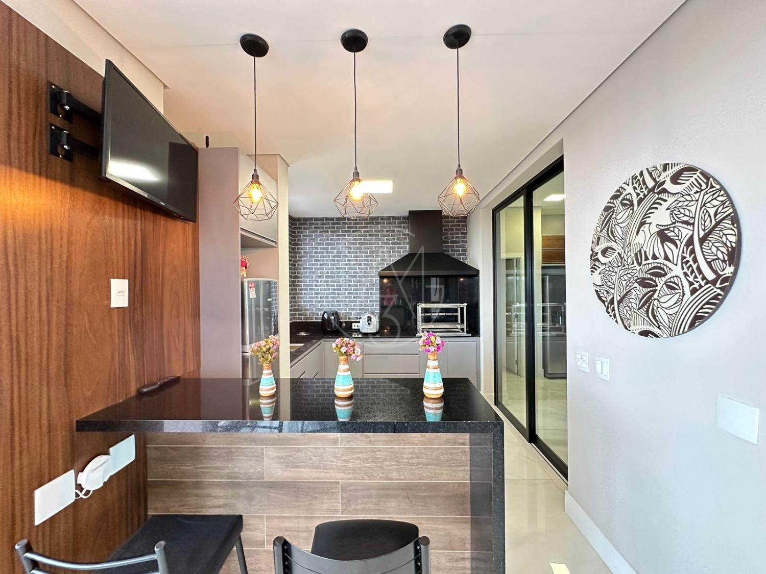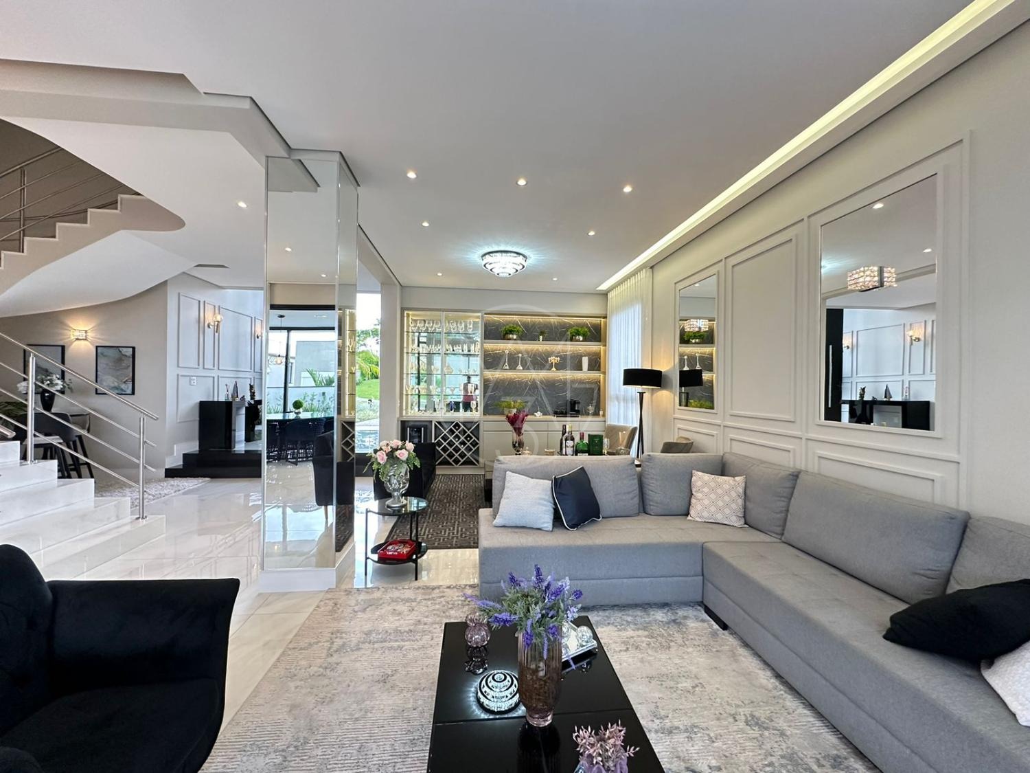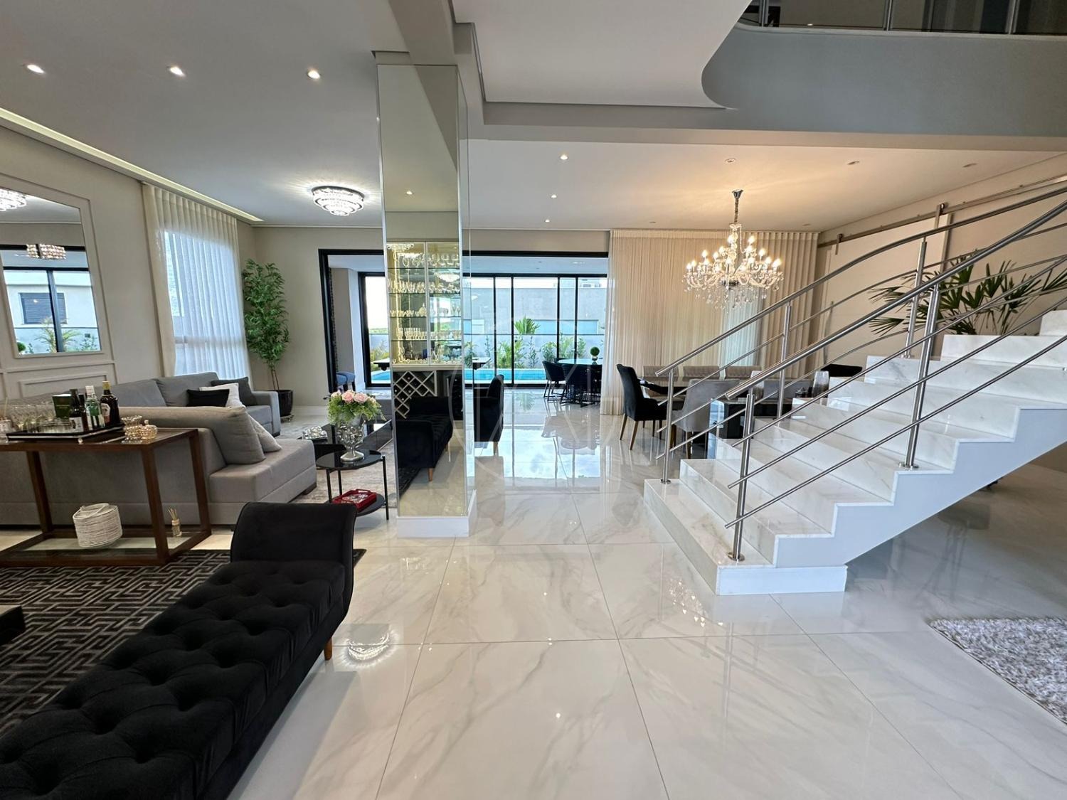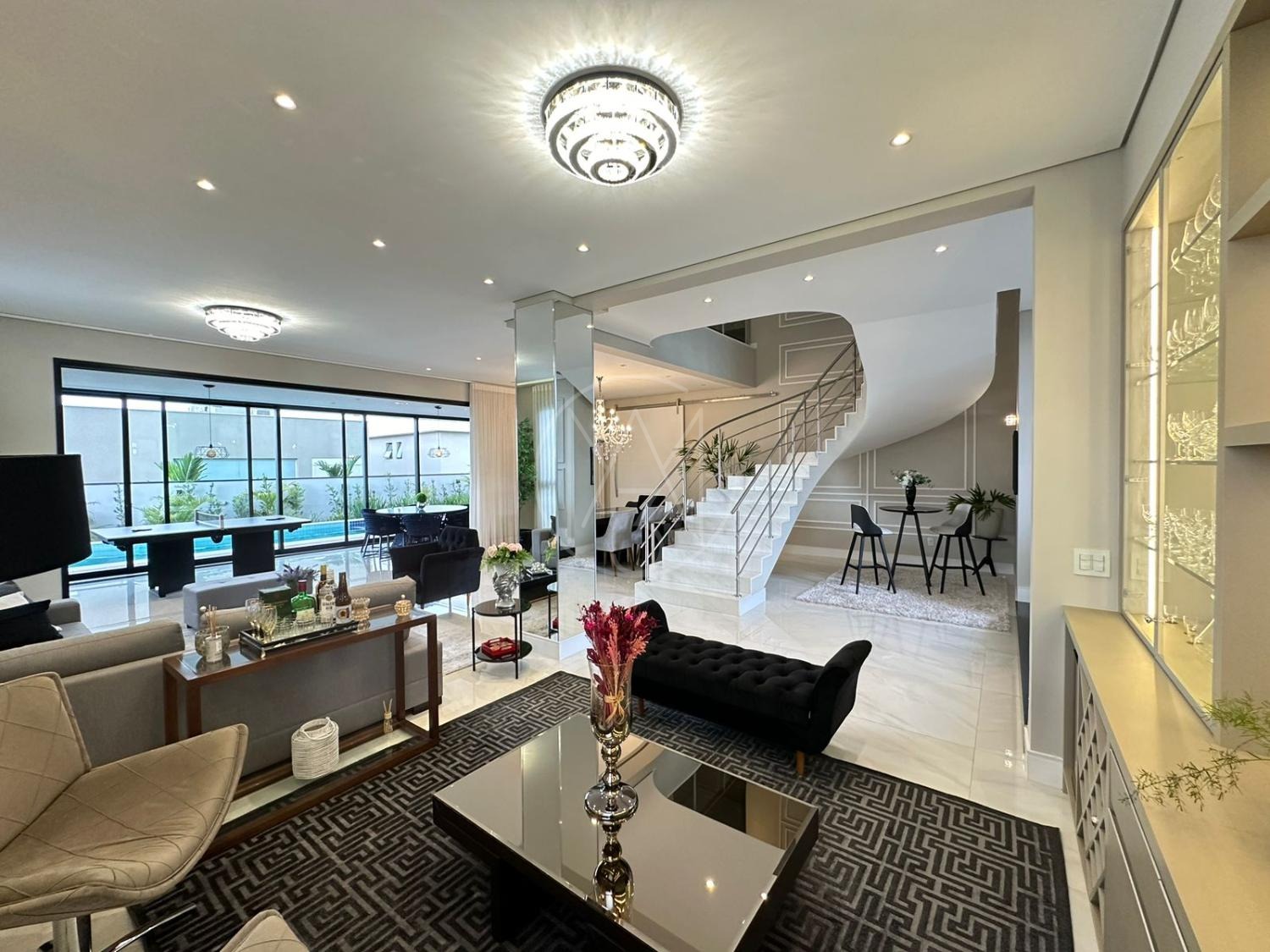 Pavimento inferior com sala de estar/jantar integradas com área gourmet e área externa, totalmente flexível com ambientes mantidos abertos ou fechados.