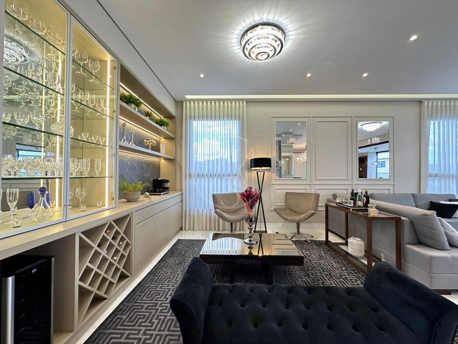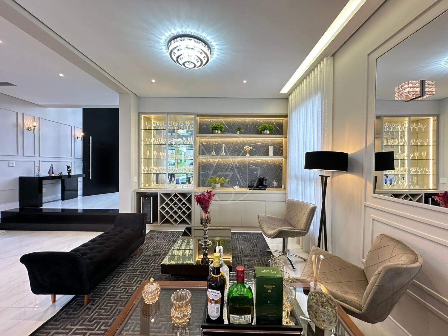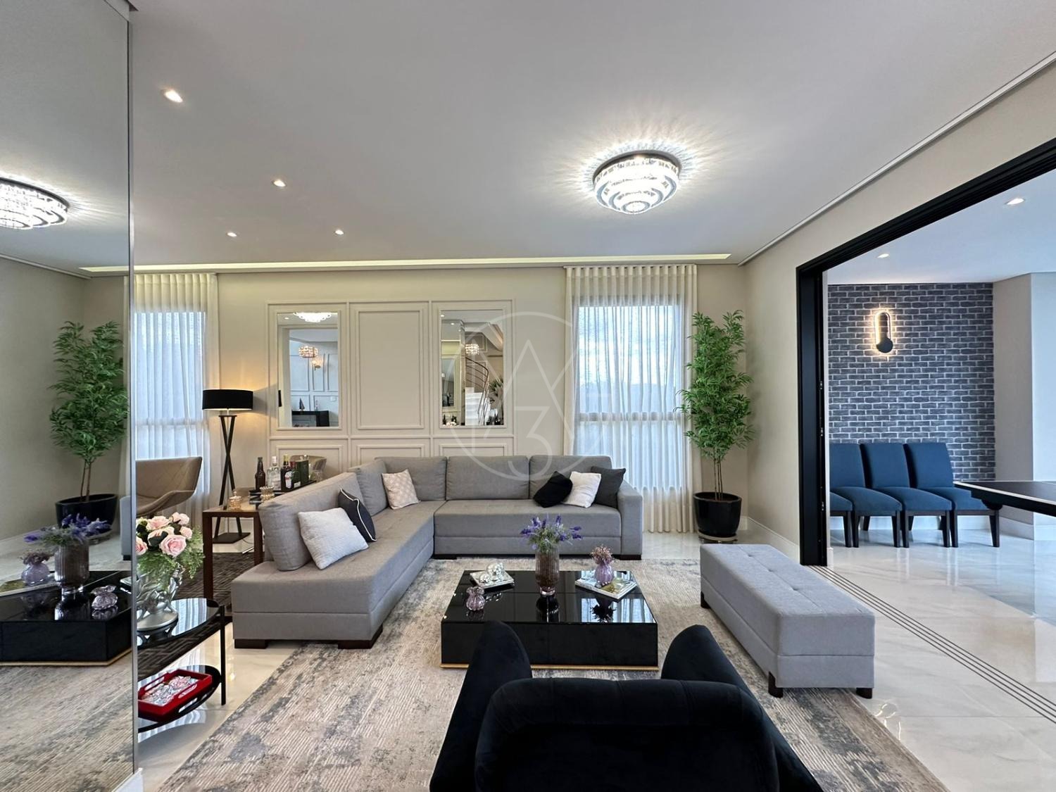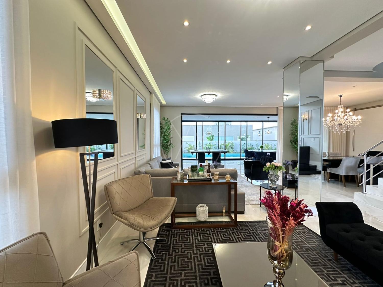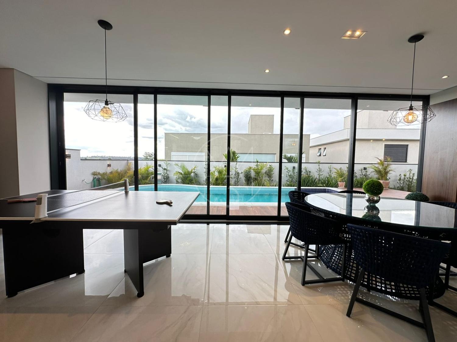 Pavimento inferior com sala de estar/jantar integradas com área gourmet e área externa, totalmente flexível com ambientes mantidos abertos ou fechados.