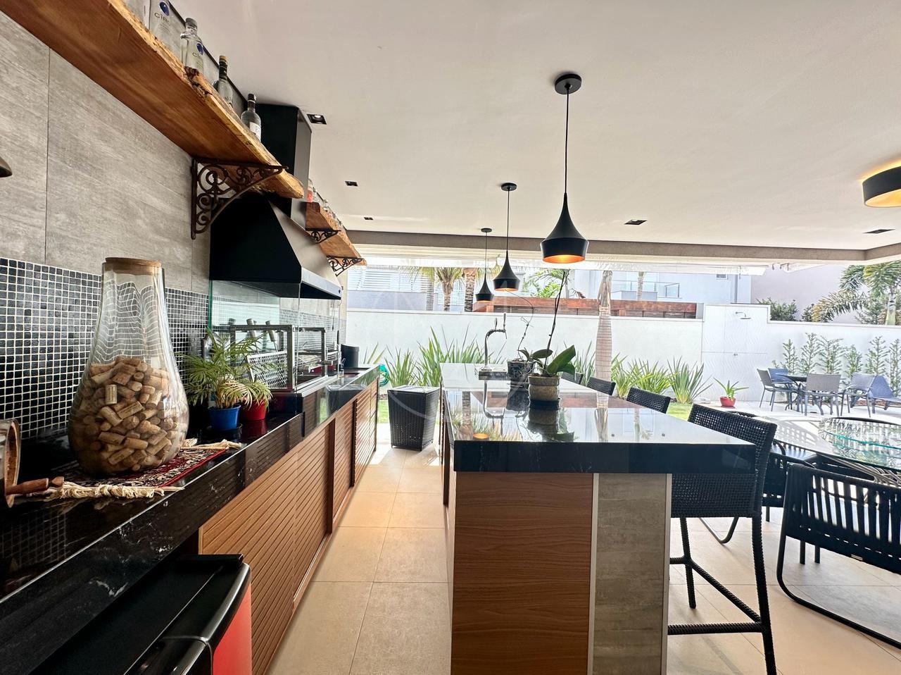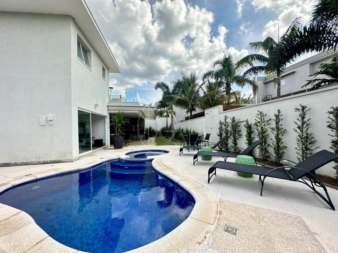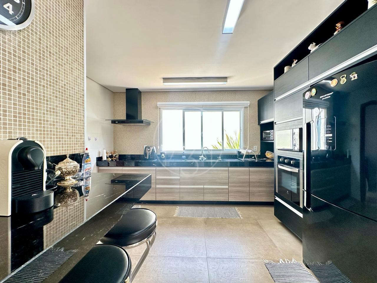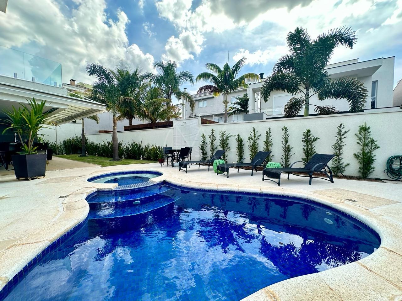 Sobrado mobiliado, imponente, projeto contemporâneo, espaçoso e integrado, e está situado em rua plana, sem saída, ótima localização dentro do condomínio. Com 3 suítes, sendo a master com closet, ampla sala para 3 ambientes, cozinha e despensa. Espaço gourmet com churrasqueira e piscina e com 4 vagas de garagem, sendo 2 cobertas. Estuda permuta.