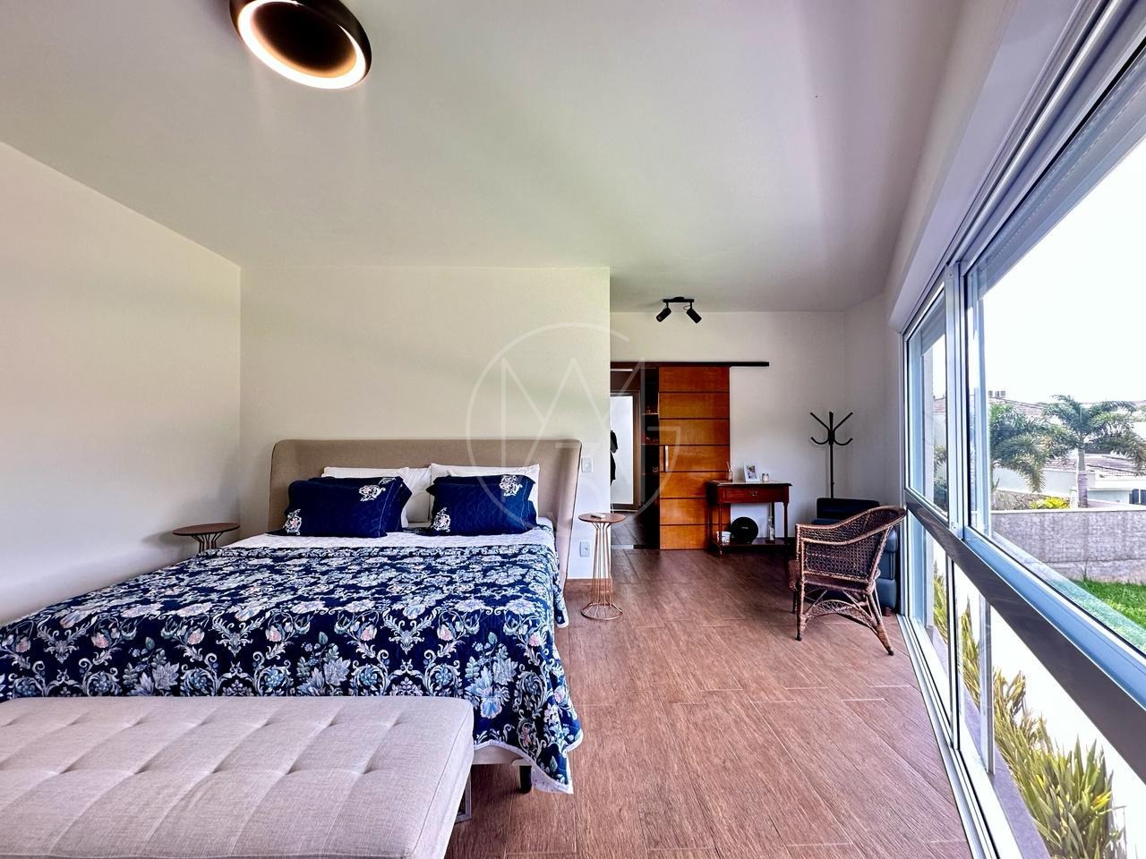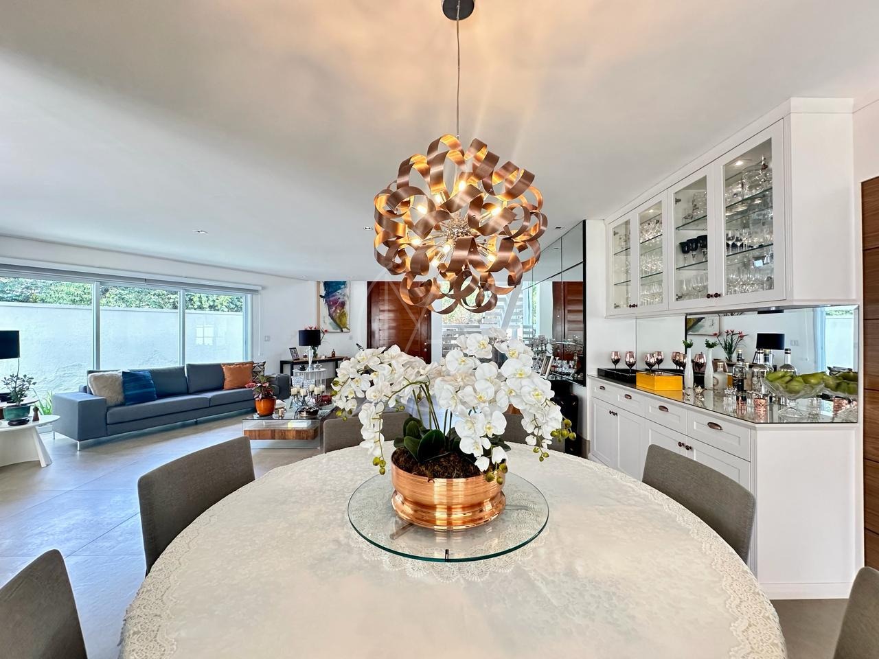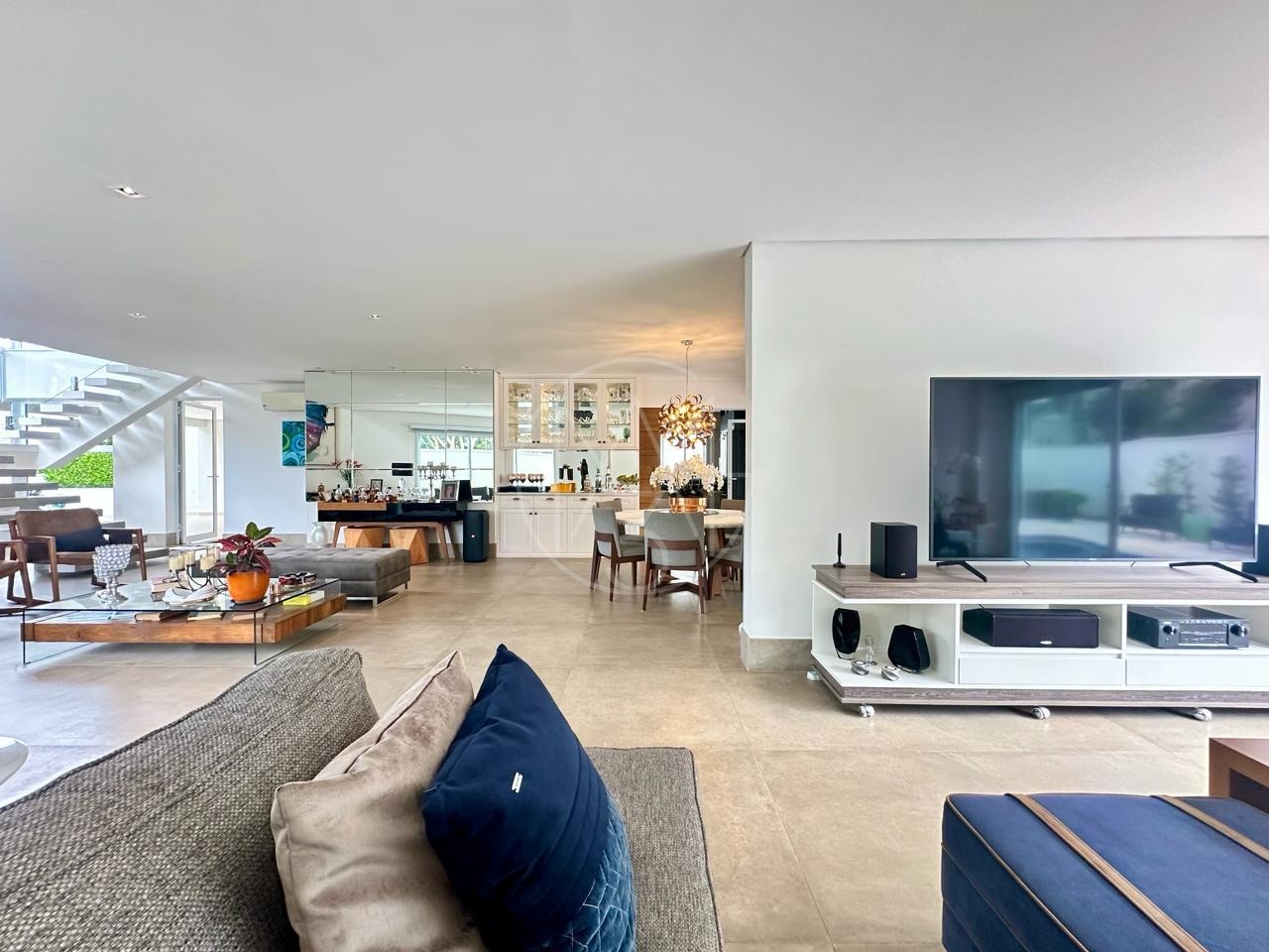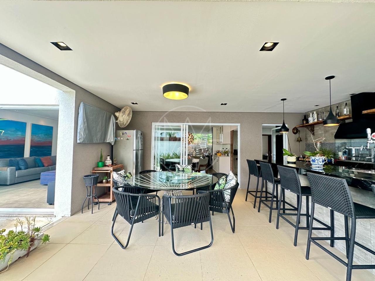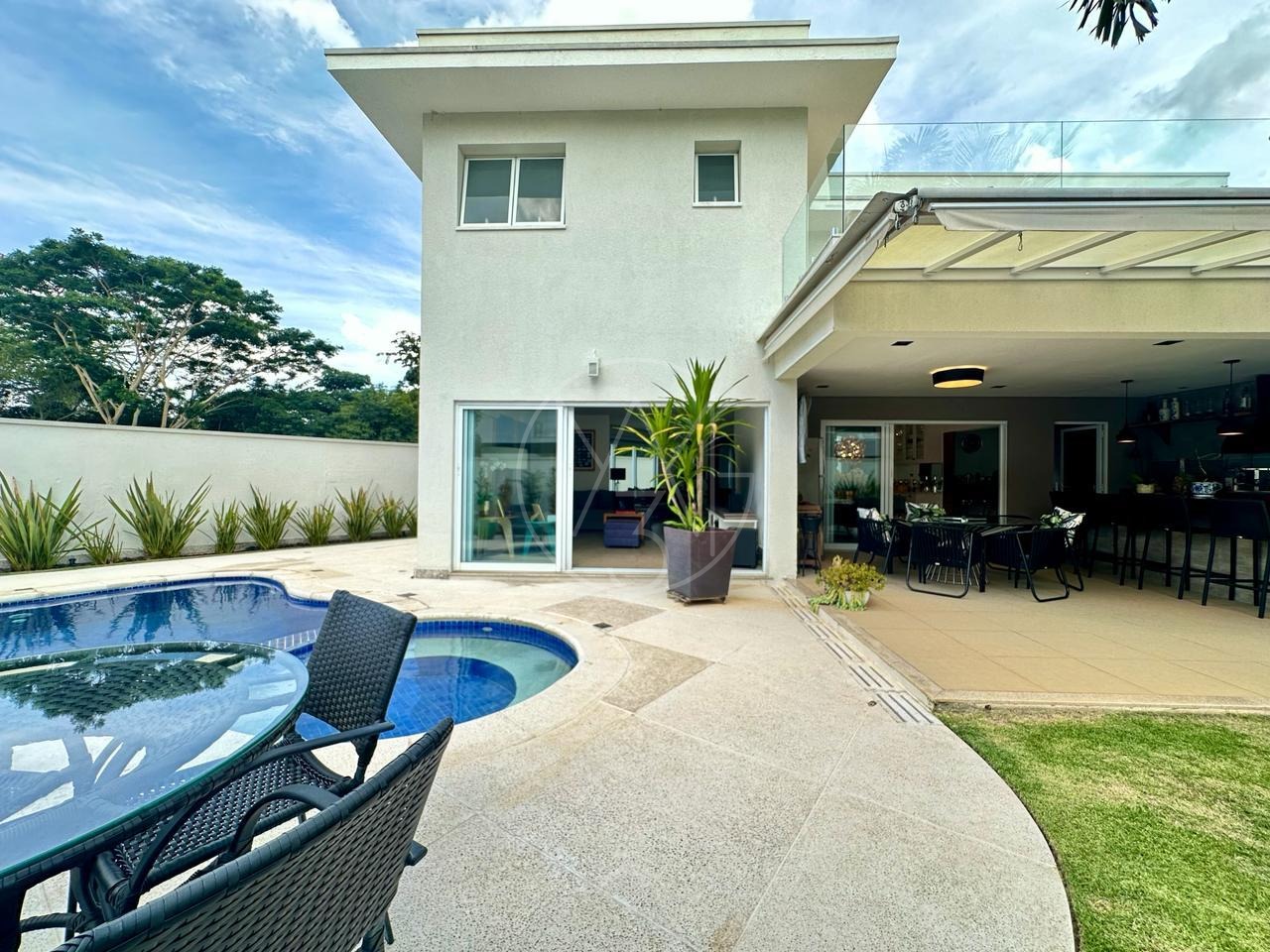 Sobrado mobiliado, imponente, projeto contemporâneo, espaçoso e integrado, e está situado em rua plana, sem saída, ótima localização dentro do condomínio. Com 3 suítes, sendo a master com closet, ampla sala para 3 ambientes, cozinha e despensa. Espaço gourmet com churrasqueira e piscina e com 4 vagas de garagem, sendo 2 cobertas. Estuda permuta.