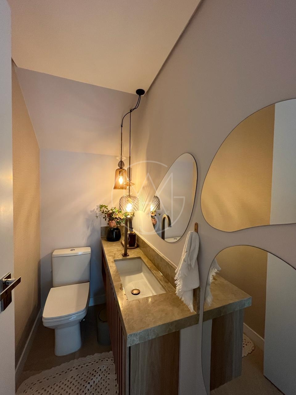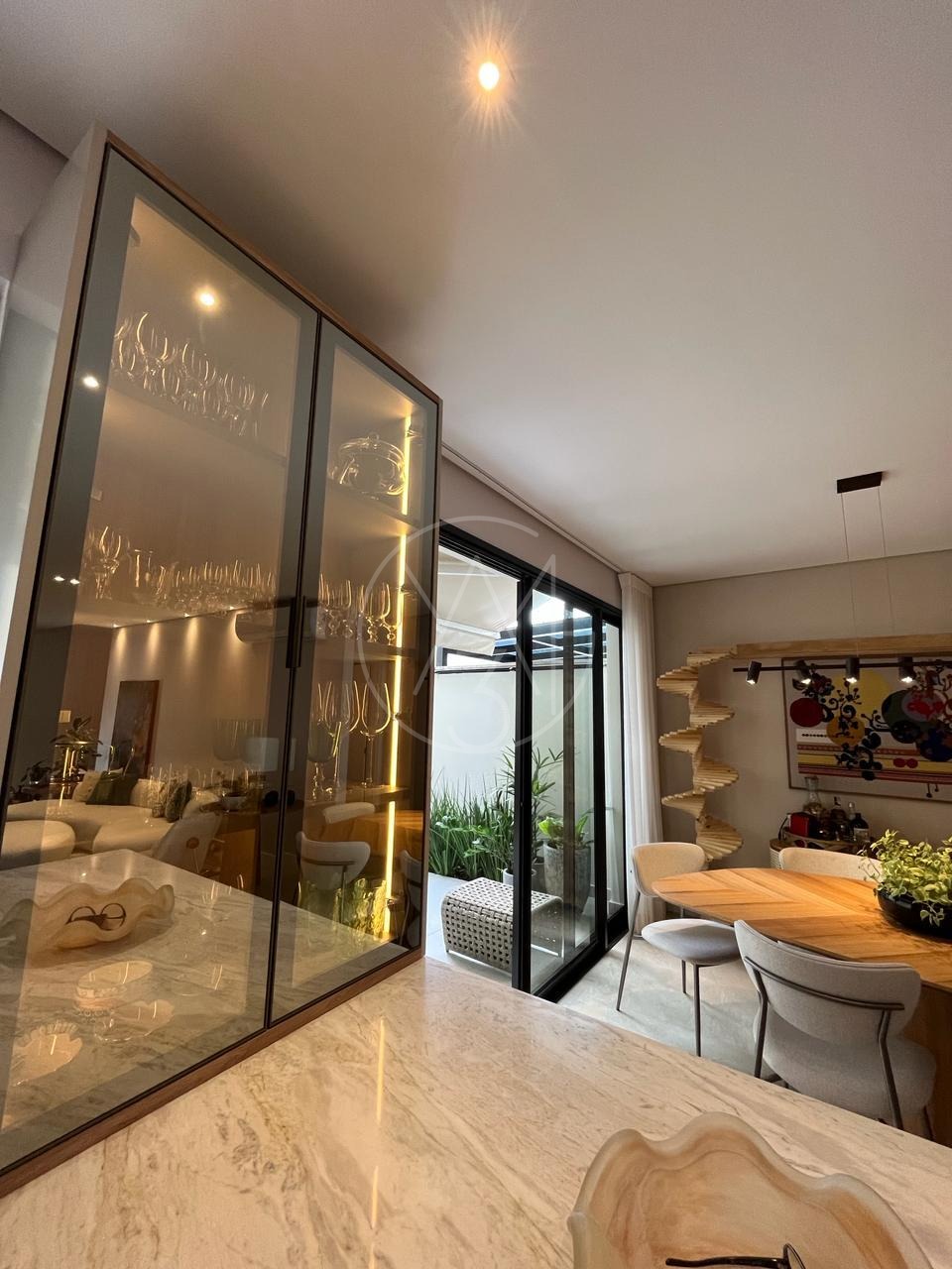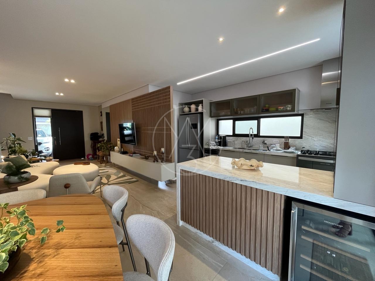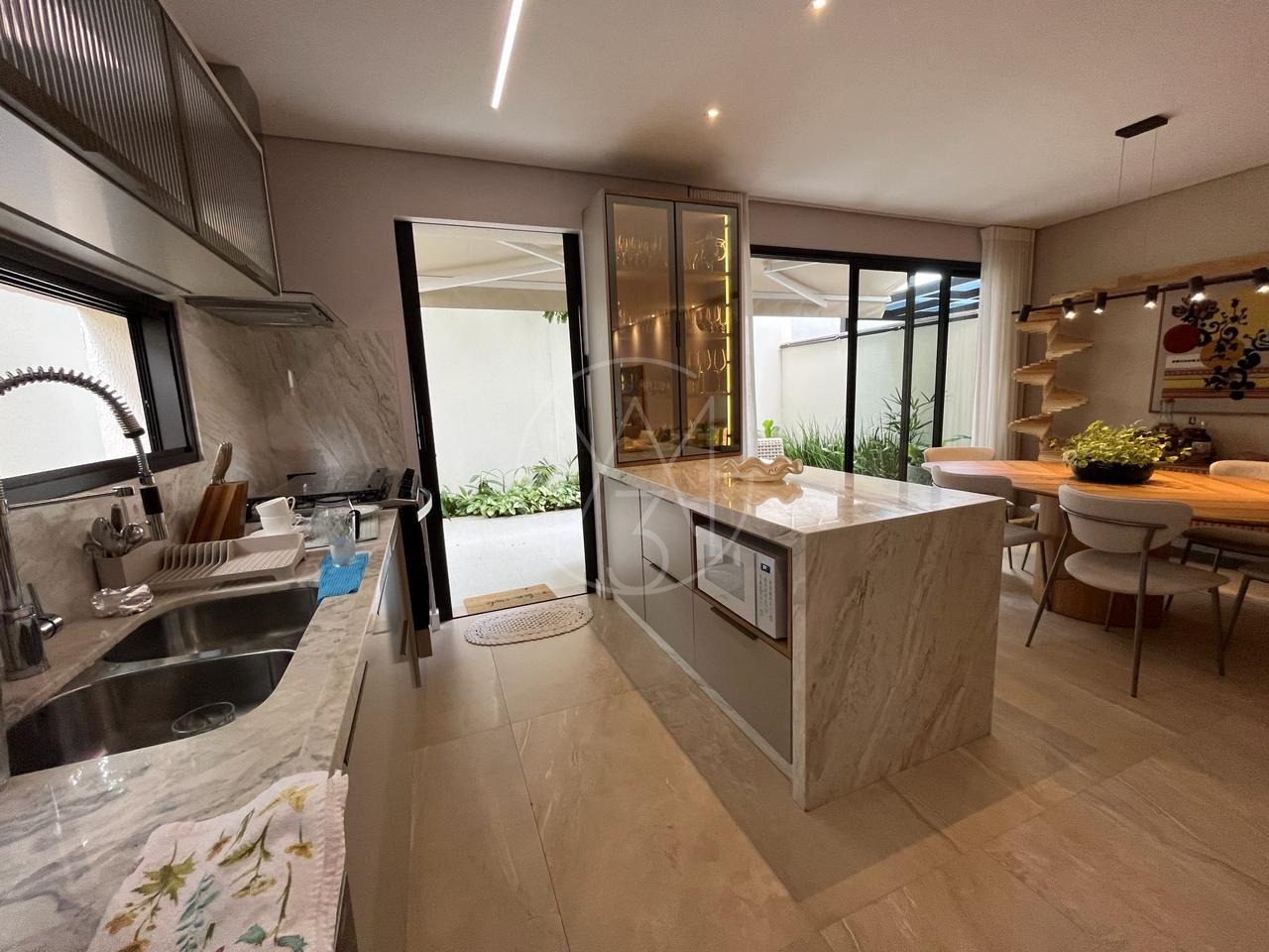 Casa em condomínio com excelente padrão de construção, com 200 m², amplo living para 2 ambientes, lavabo, 3 dormitórios suíte com sala íntima, cozinha, despensa, varanda gourmet, área de serviço com Wc, 4 vagas de garagem, infraestrutura para automação, infraestrutura para ar condicionado (sala e suítes), preparação para aquecimento a gás, suíte com dois pontos de chuveiros e duas cubas, janelas amplas com persianas de enrolar nas suítes, tomada para veículo elétrico, fechadura eletrônica, patinetes elétricos, Espaço Uber, Portaria Blindada. Lazer com piscina adulto e infantil, Deck molhado, Solarium, Espaço Gourmet com copa de apoio, Lounge, Playground, Fitness, Pomar. Em local privilegiado.