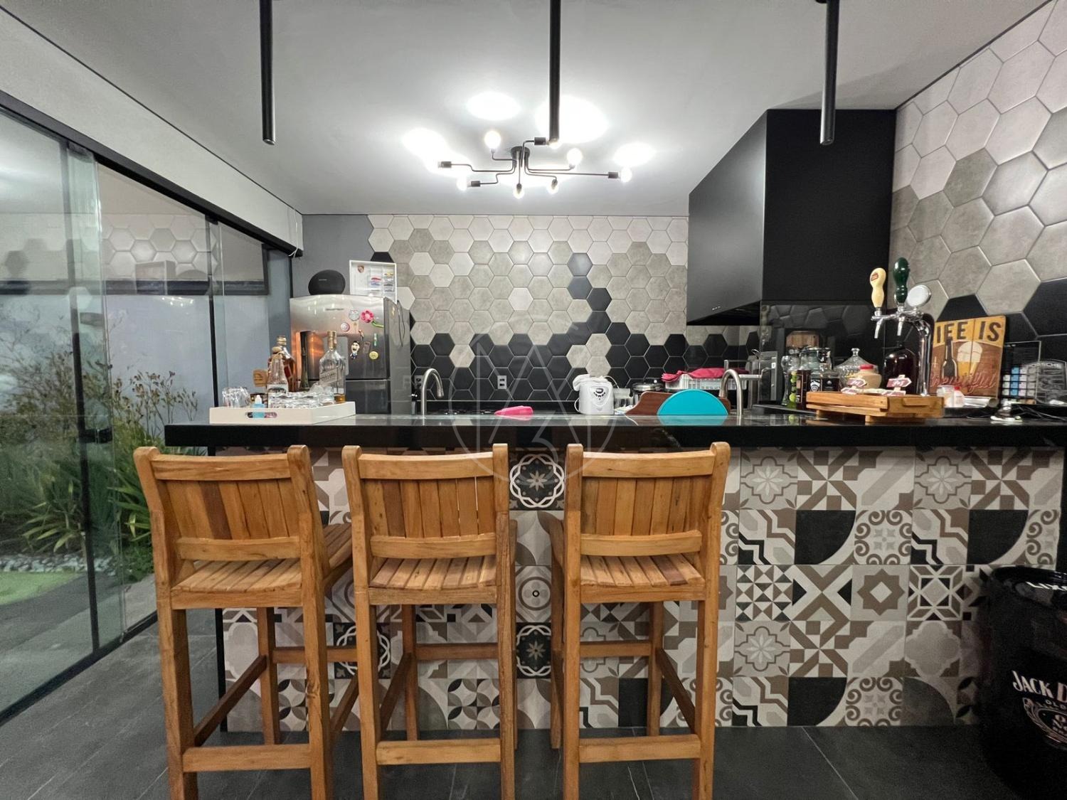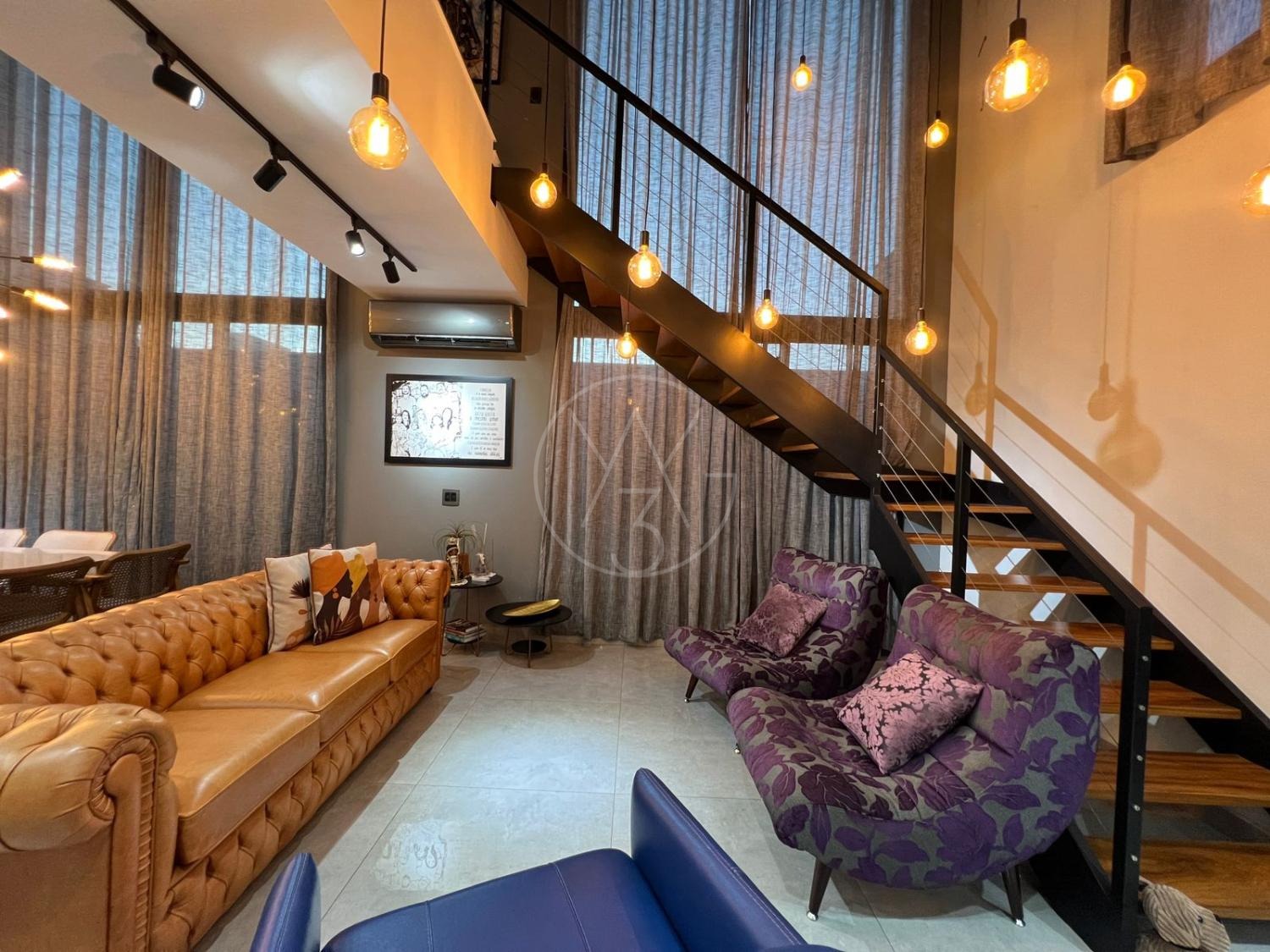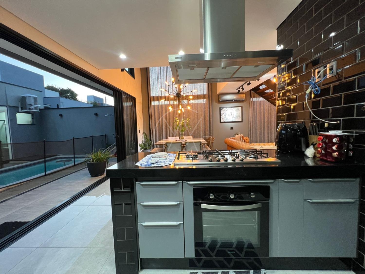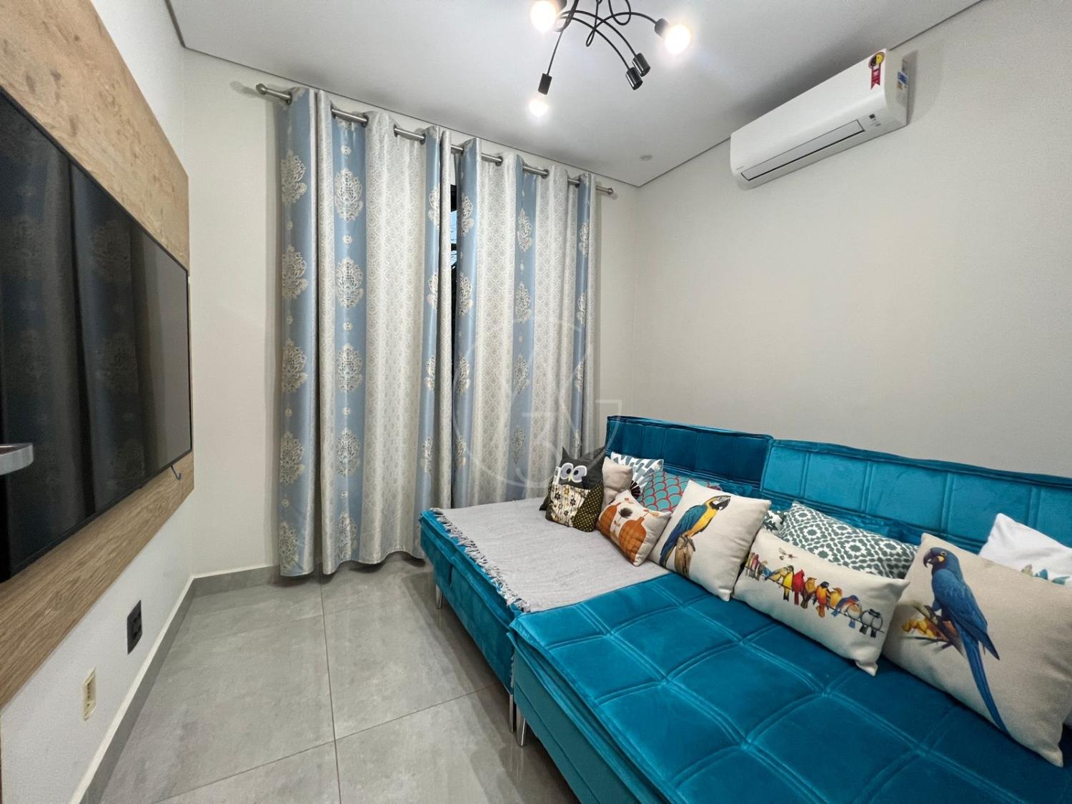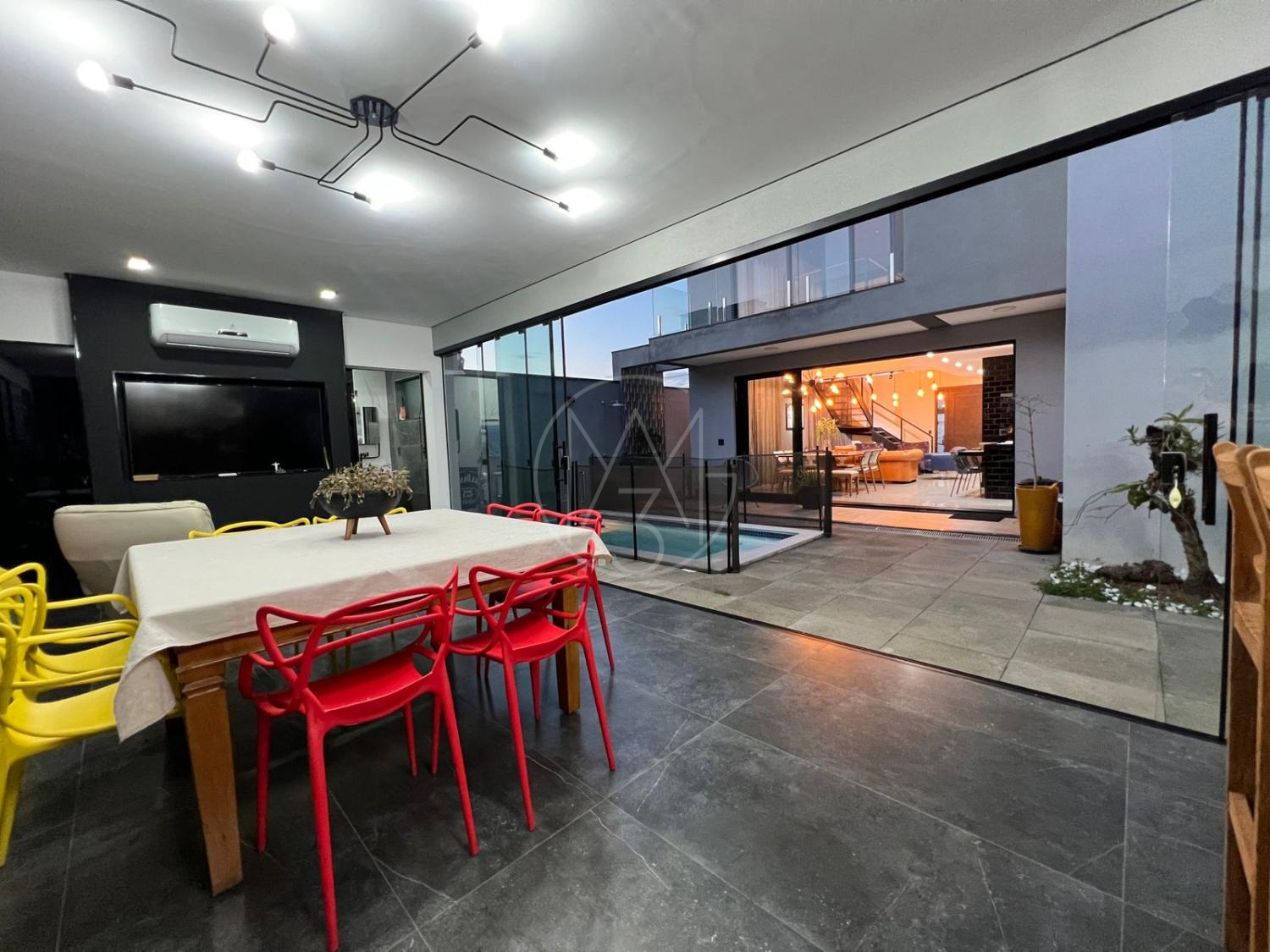 Sobrado com acabamentos diferenciado, 3 quartos, sendo 2 suites na parte superior. A suite master com closet e sacada. Na parte inferior quarto que esta sendo utilizado como sala de TV. Sala de estar e jantar com pé direito duplo, projeto de iluminação. Cozinha americana com eletrodomésticos Tramontina. Área Gourmet com piscina, equipada com churrasqueira, chopeira, cooktop, ar condicionado. Todos os ambientes da casa são climatizados. Possui Aquecimento Solar e Fotovoltaica. Casa com decoração de muito bom gosto.