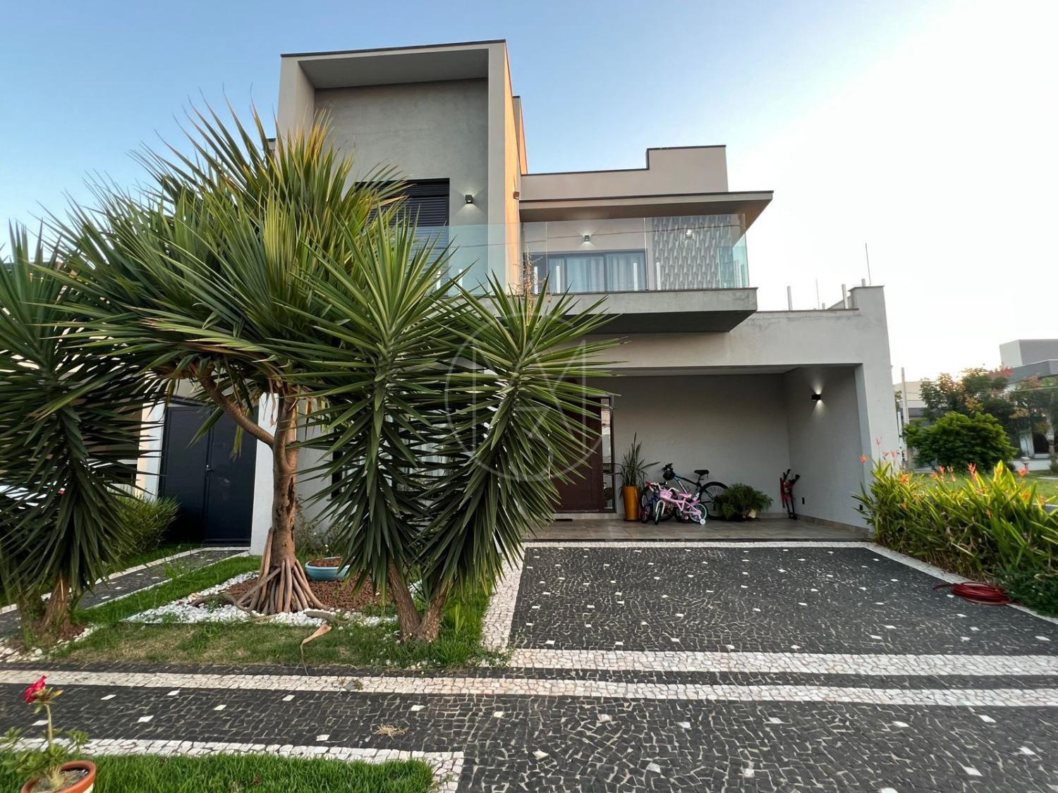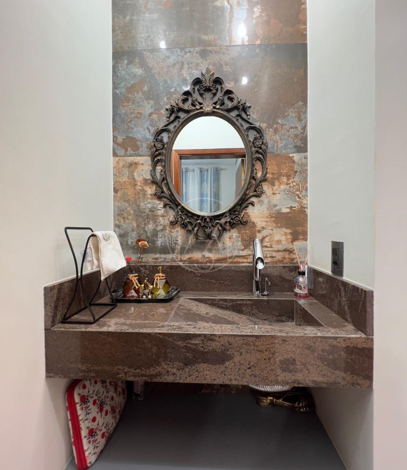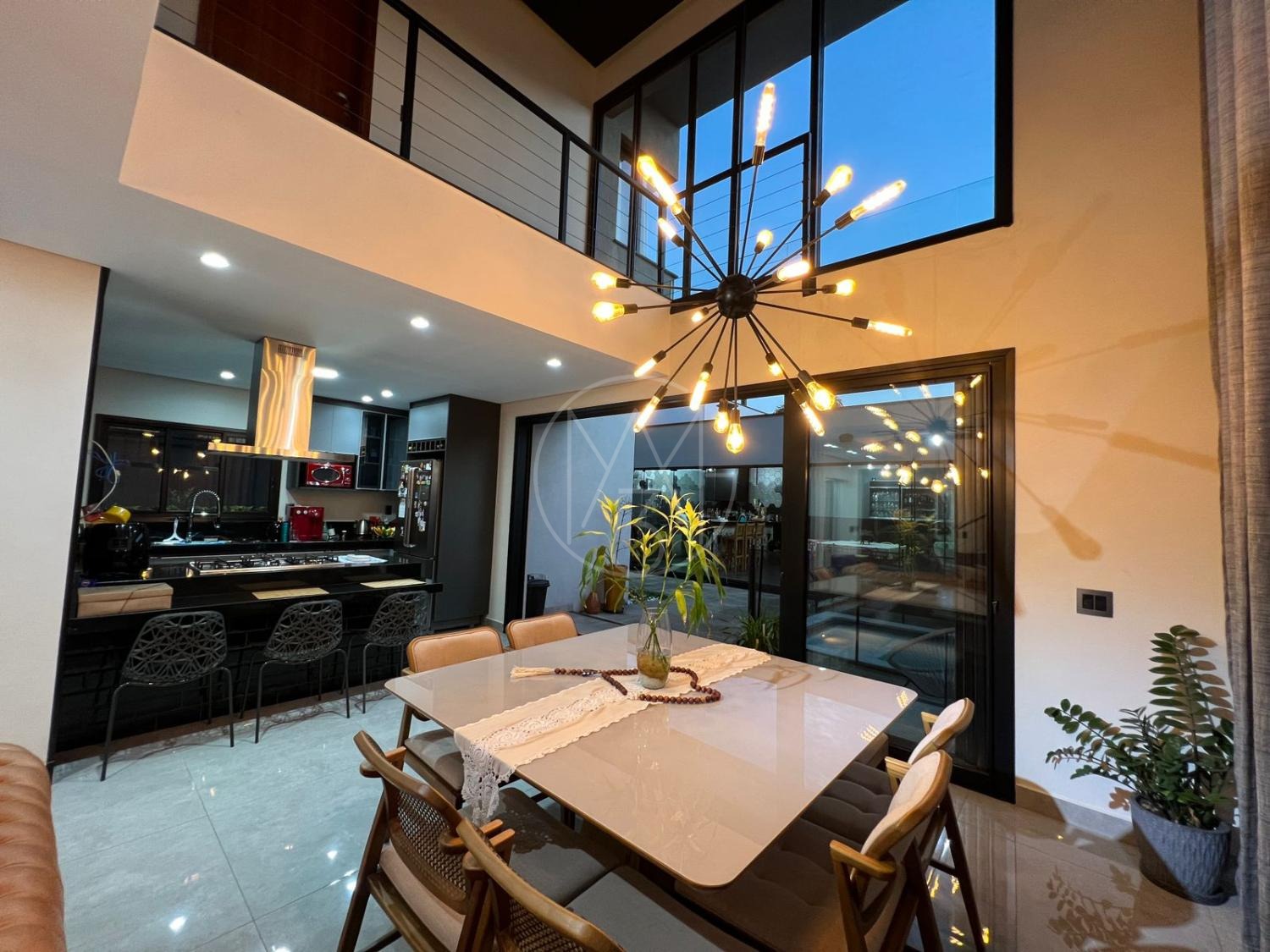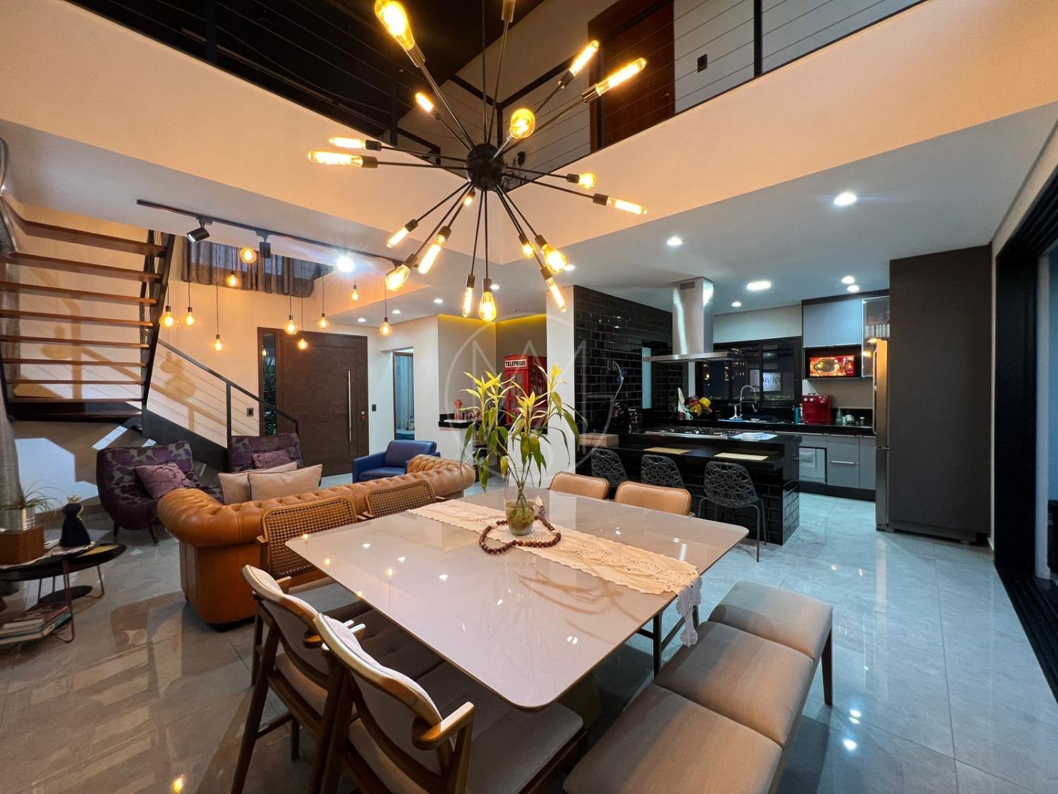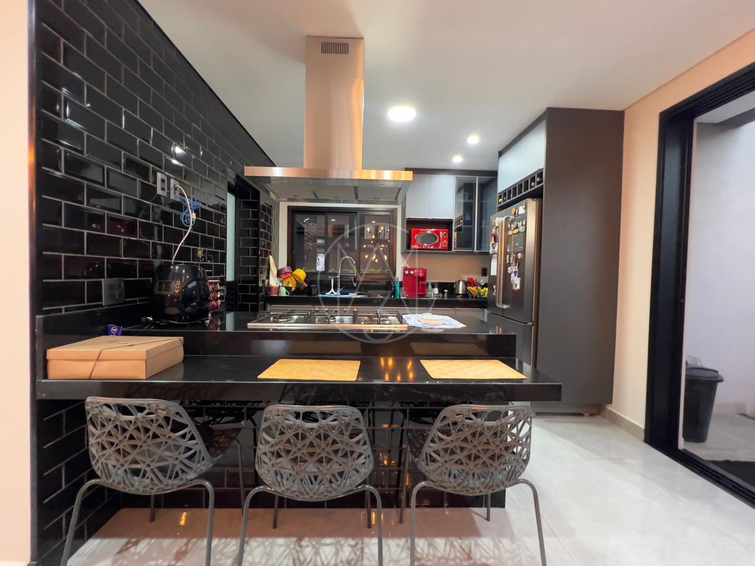 Sobrado com acabamentos diferenciado, 3 quartos, sendo 2 suites na parte superior. A suite master com closet e sacada. Na parte inferior quarto que esta sendo utilizado como sala de TV. Sala de estar e jantar com pé direito duplo, projeto de iluminação. Cozinha americana com eletrodomésticos Tramontina. Área Gourmet com piscina, equipada com churrasqueira, chopeira, cooktop, ar condicionado. Todos os ambientes da casa são climatizados. Possui Aquecimento Solar e Fotovoltaica. Casa com decoração de muito bom gosto.