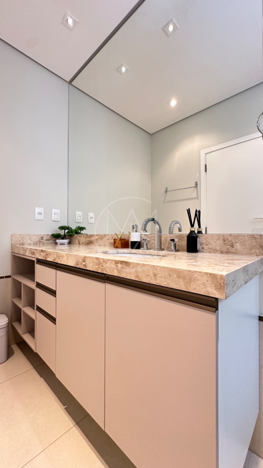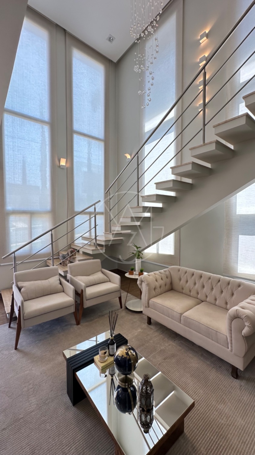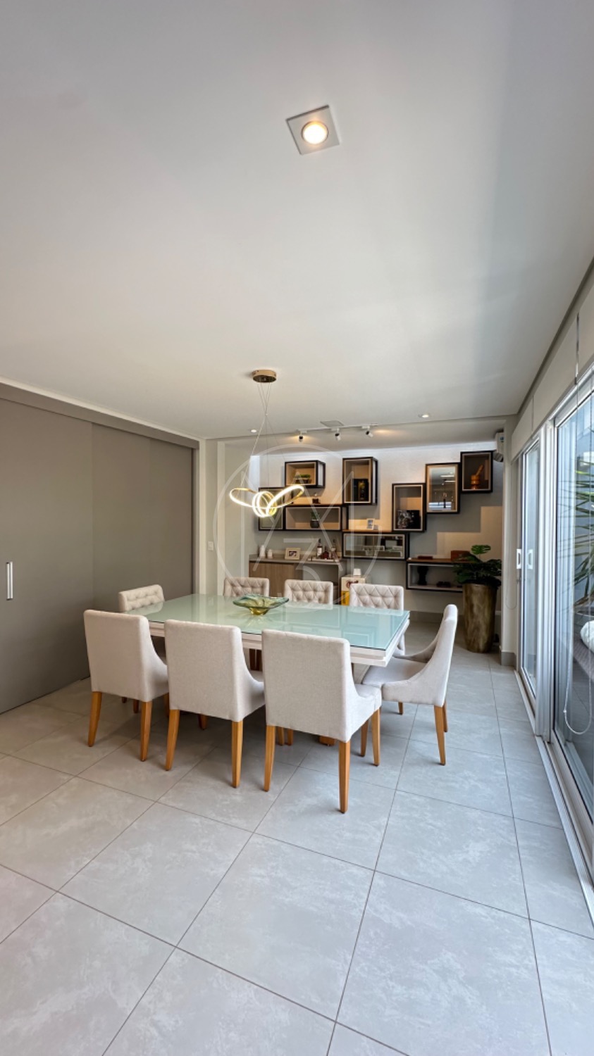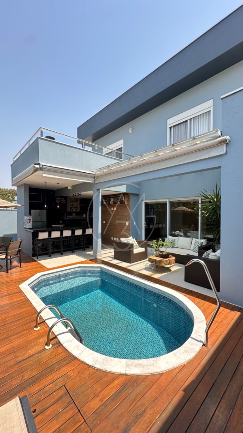 No piso térreo, o living possui pé-direito duplo, escada em mármore, sala de TV com portas de marcenaria, sala de jantar e cozinha americana equipada com armários no estilo provençal e eletrodomésticos completos. A área de serviço inclui lavanderia, despensa e um espaço gourmet integrado à piscina, ideal para momentos de lazer.