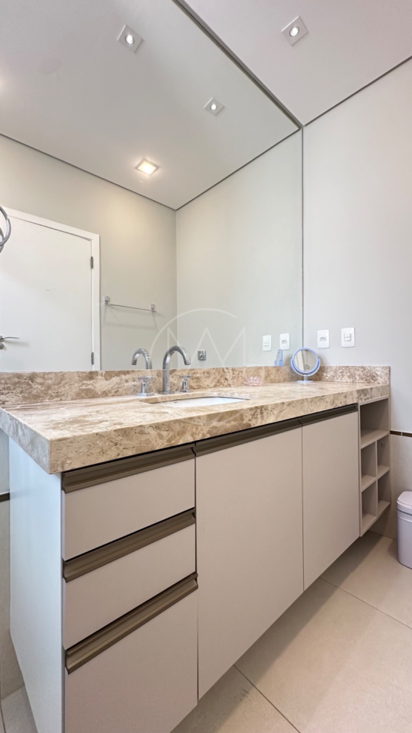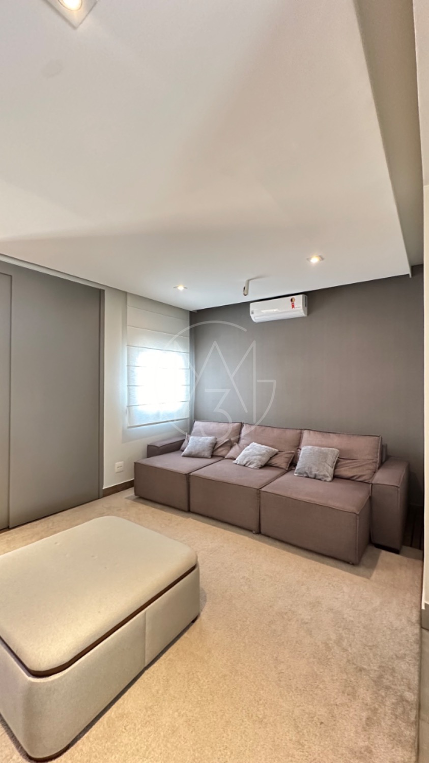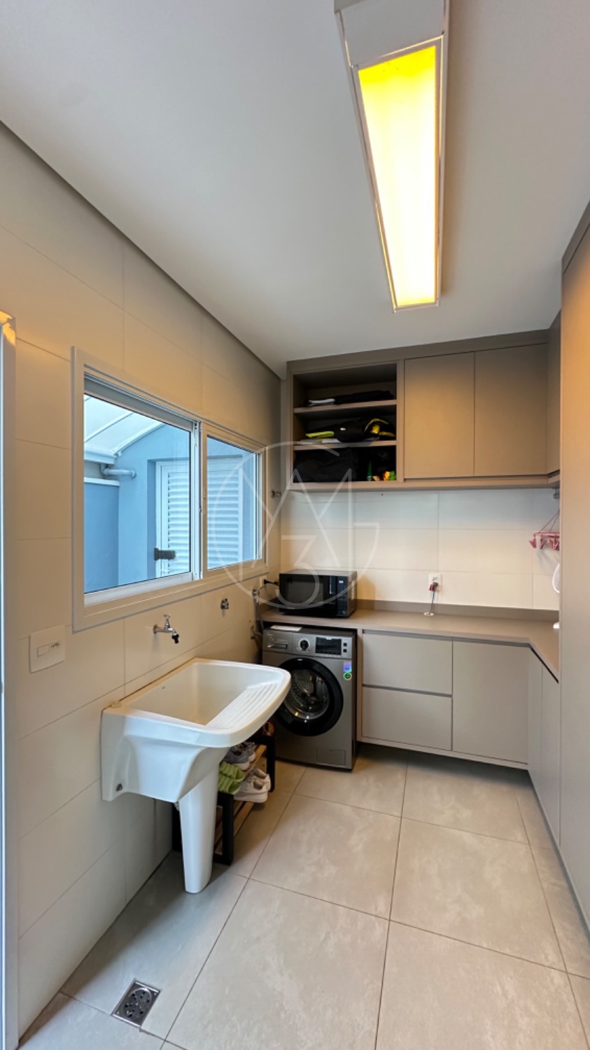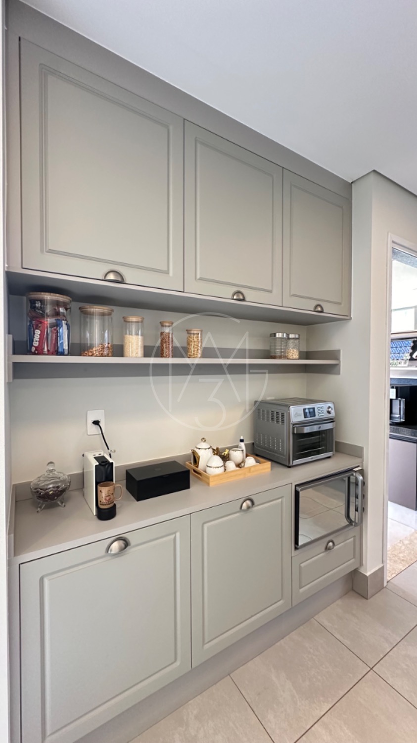 No piso térreo, o living possui pé-direito duplo, escada em mármore, sala de TV com portas de marcenaria, sala de jantar e cozinha americana equipada com armários no estilo provençal e eletrodomésticos completos. A área de serviço inclui lavanderia, despensa e um espaço gourmet integrado à piscina, ideal para momentos de lazer.