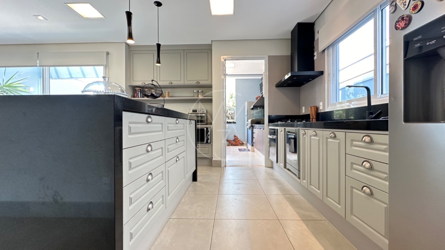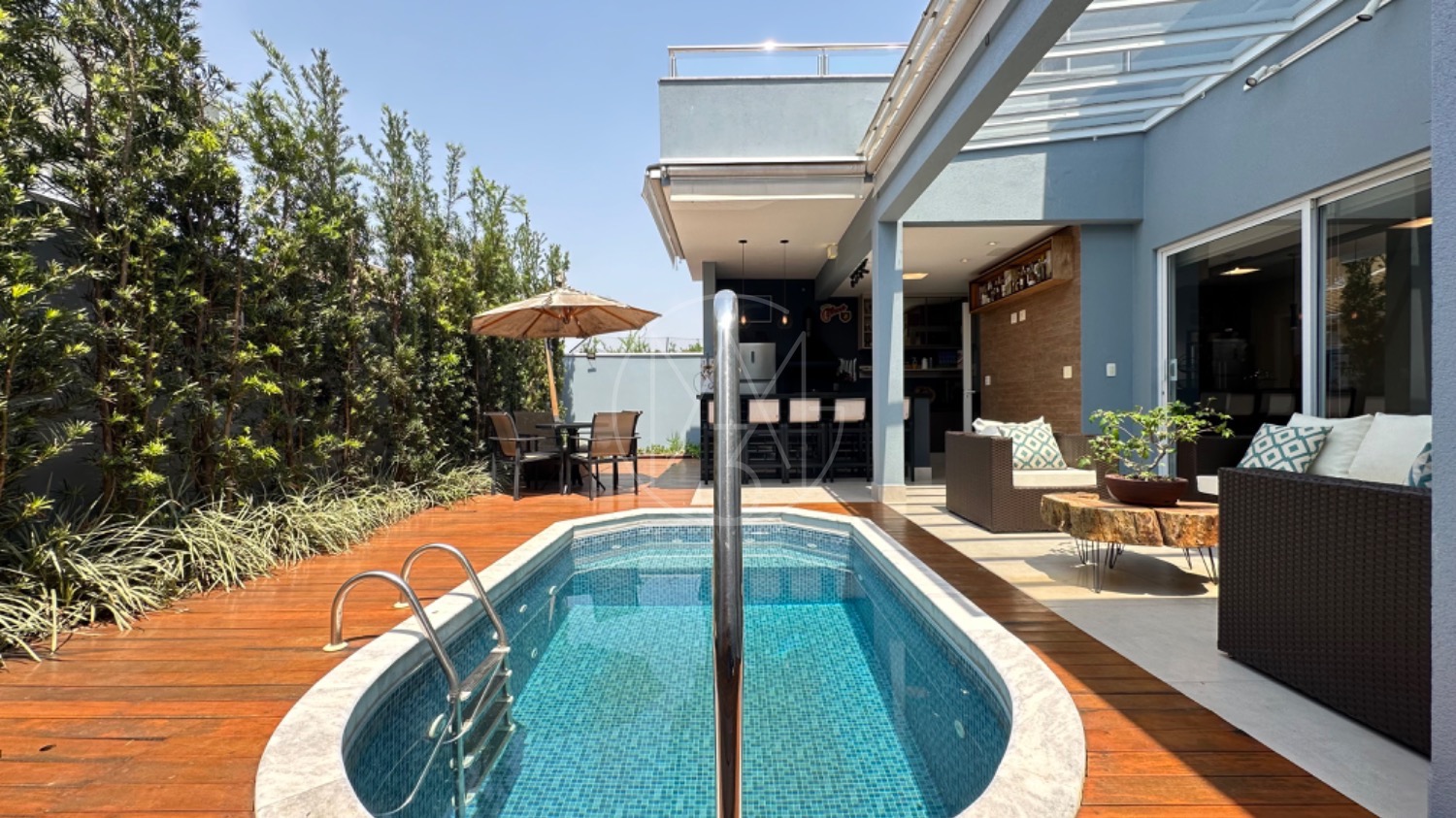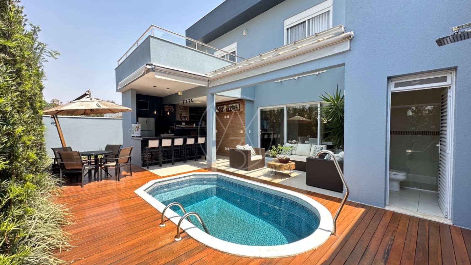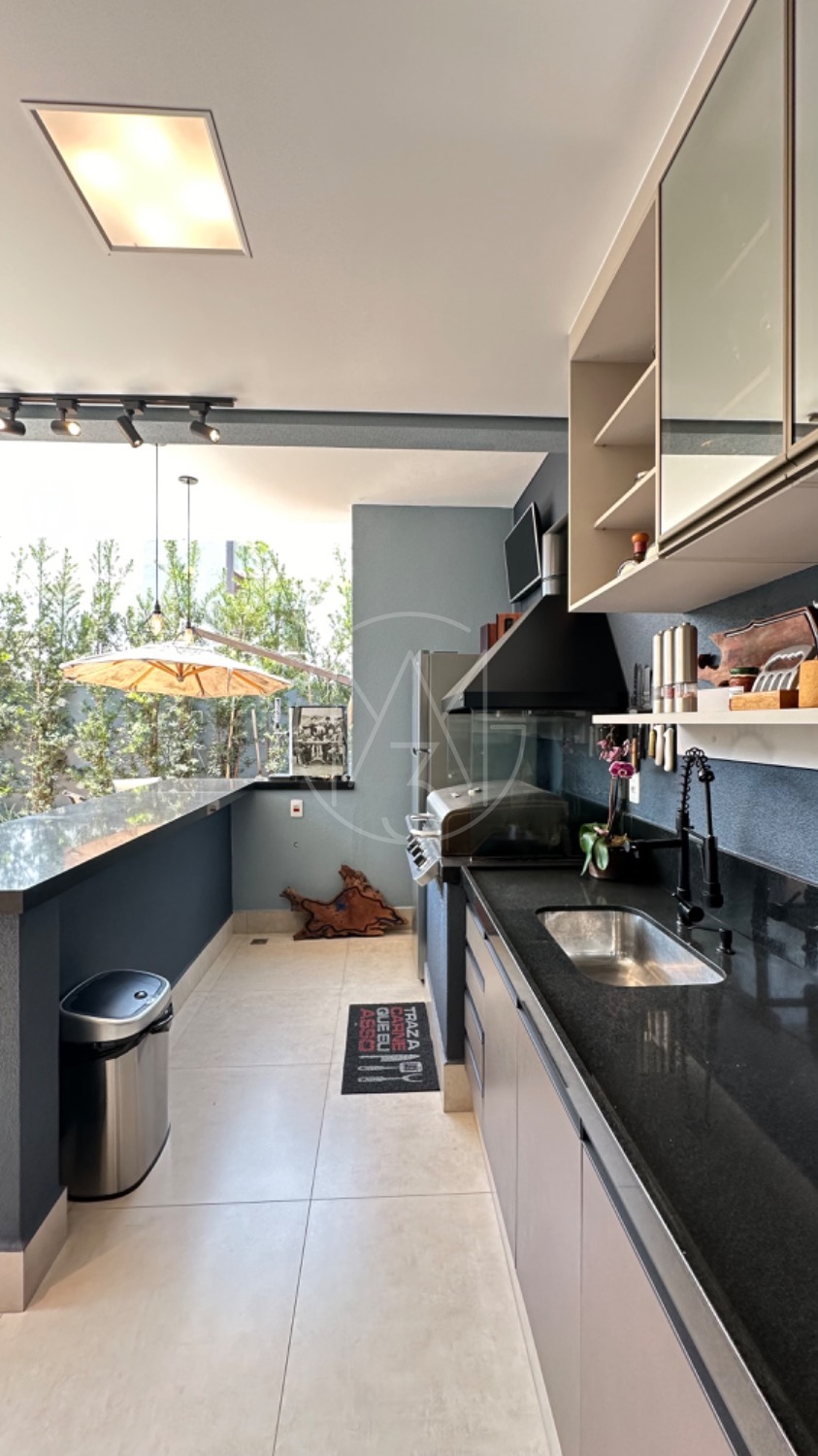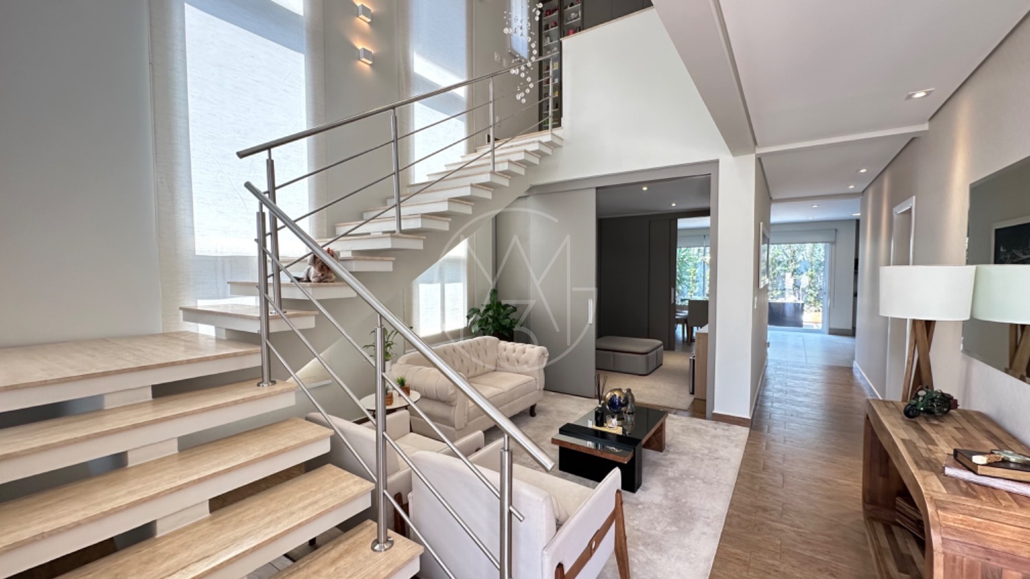 No piso térreo, o living possui pé-direito duplo, escada em mármore, sala de TV com portas de marcenaria, sala de jantar e cozinha americana equipada com armários no estilo provençal e eletrodomésticos completos. A área de serviço inclui lavanderia, despensa e um espaço gourmet integrado à piscina, ideal para momentos de lazer.