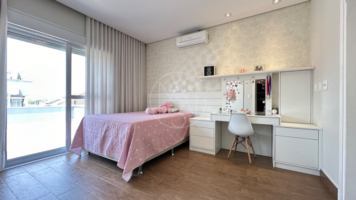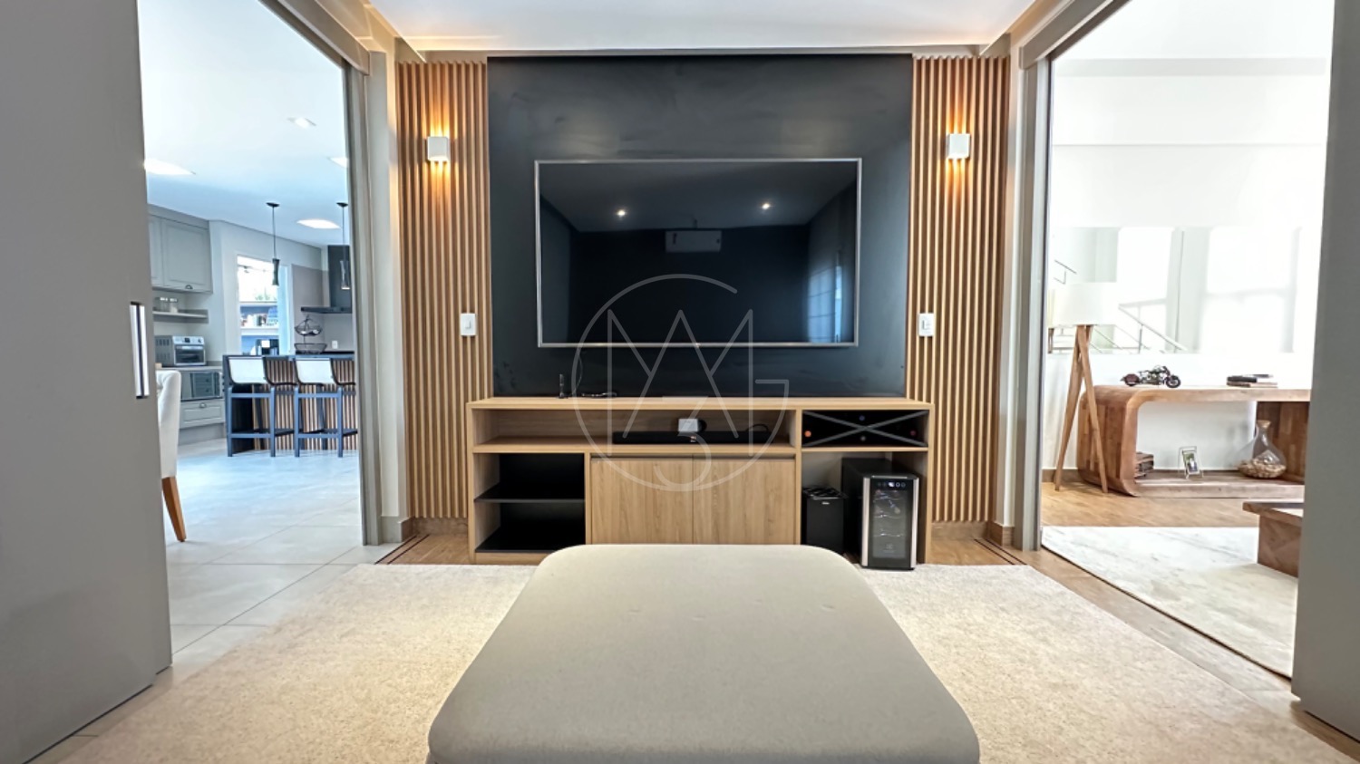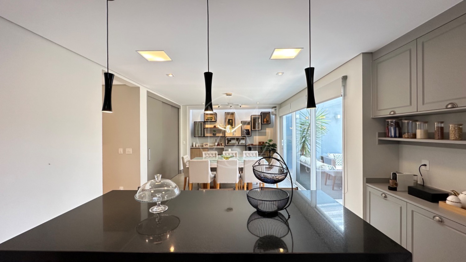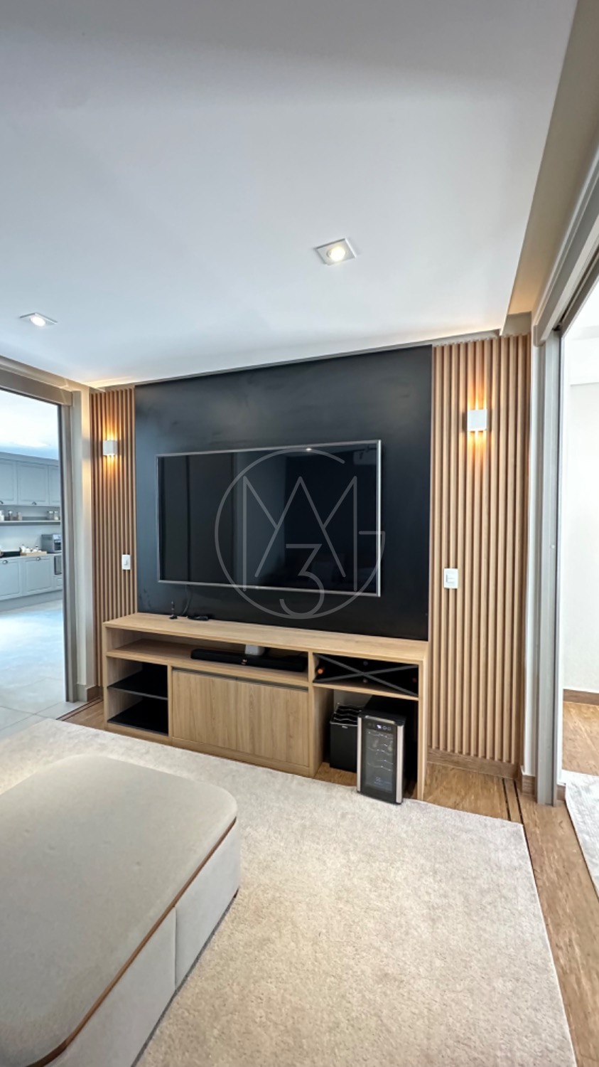 No piso térreo, o living possui pé-direito duplo, escada em mármore, sala de TV com portas de marcenaria, sala de jantar e cozinha americana equipada com armários no estilo provençal e eletrodomésticos completos. A área de serviço inclui lavanderia, despensa e um espaço gourmet integrado à piscina, ideal para momentos de lazer.