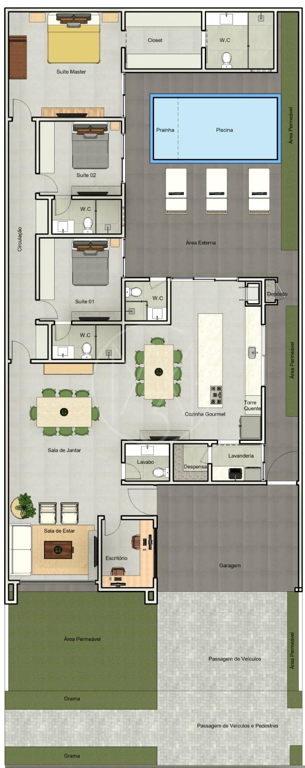 3 Suítes, 1 Lavabo, casa com Piscina, 1 Banheiro Externo, Ar Condicionado em todos ambientes, persianas automatizadas.