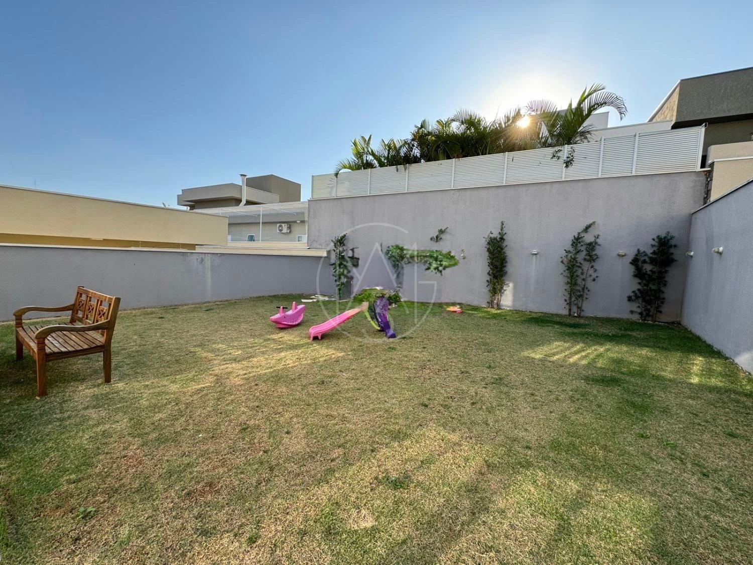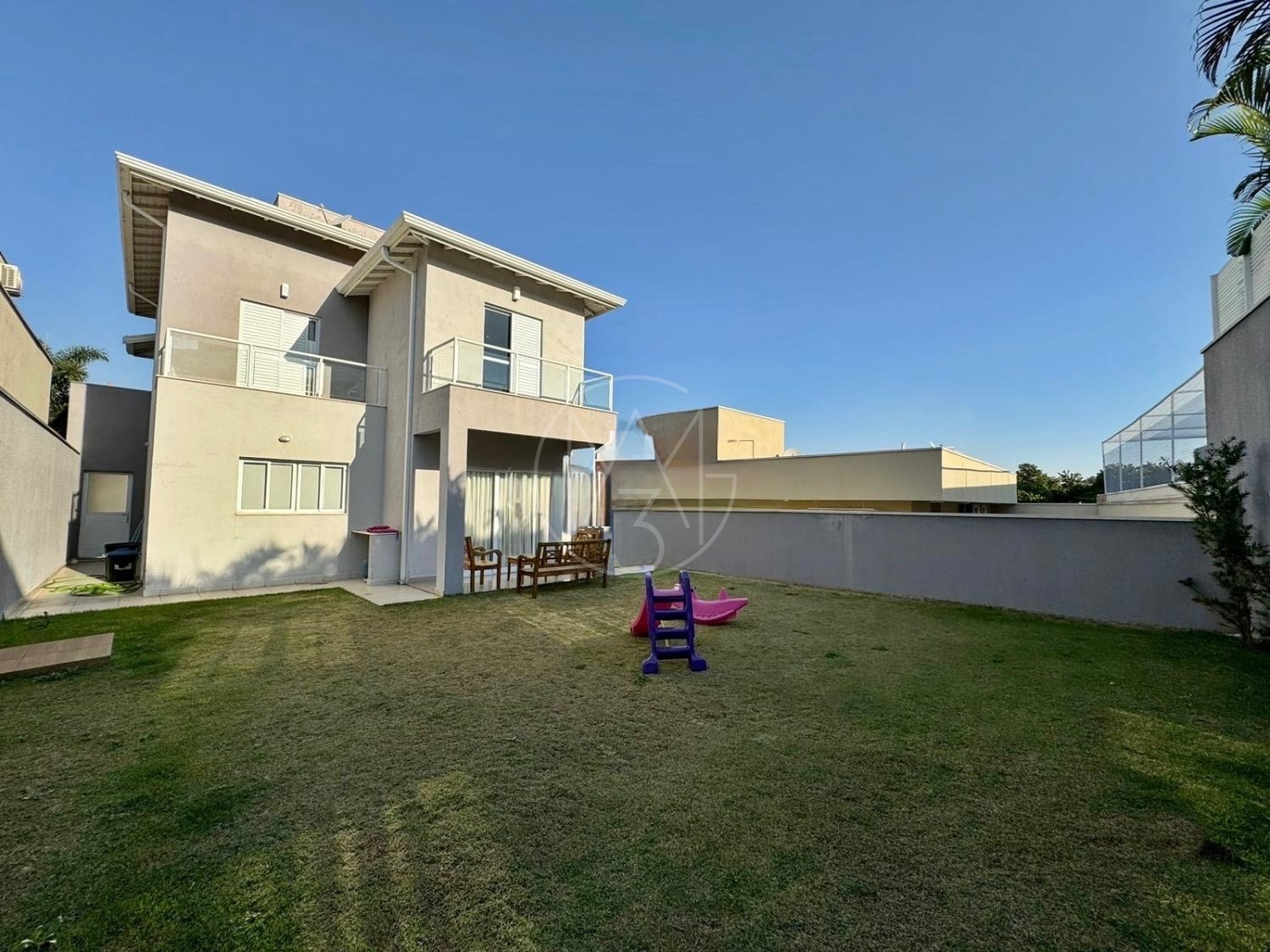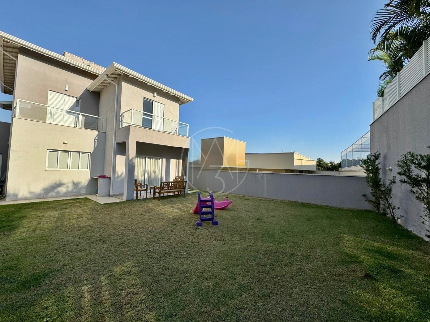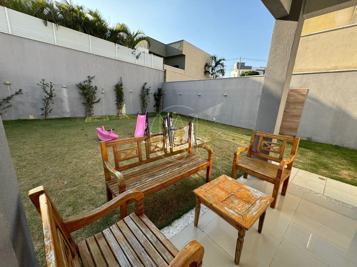 O quintal amplo, com jardim, proporciona um espaço agradável para lazer e convivência. A casa dispõe ainda de 4 vagas de garagem, sendo 2 cobertas.