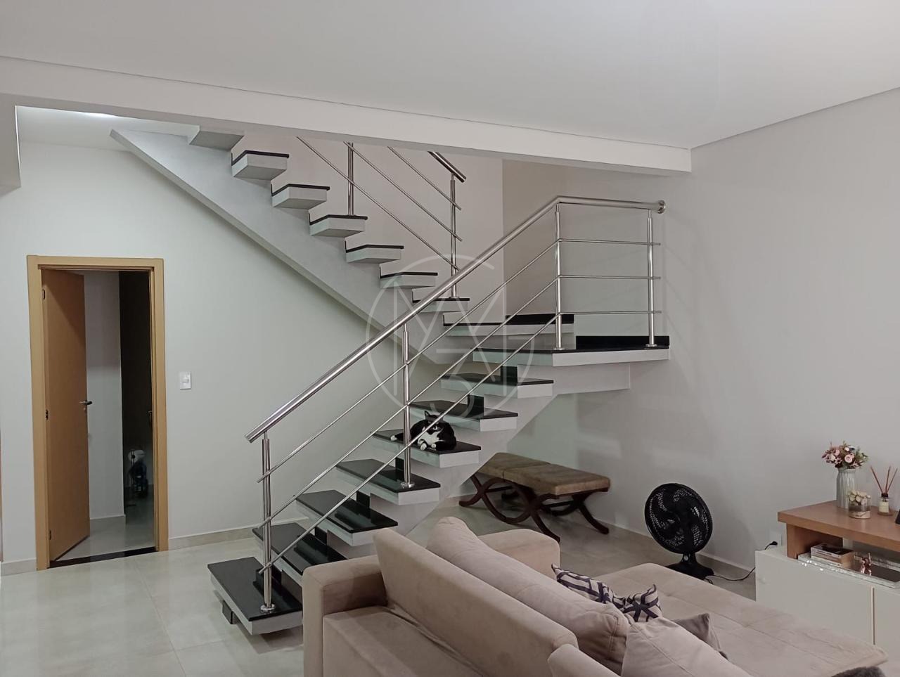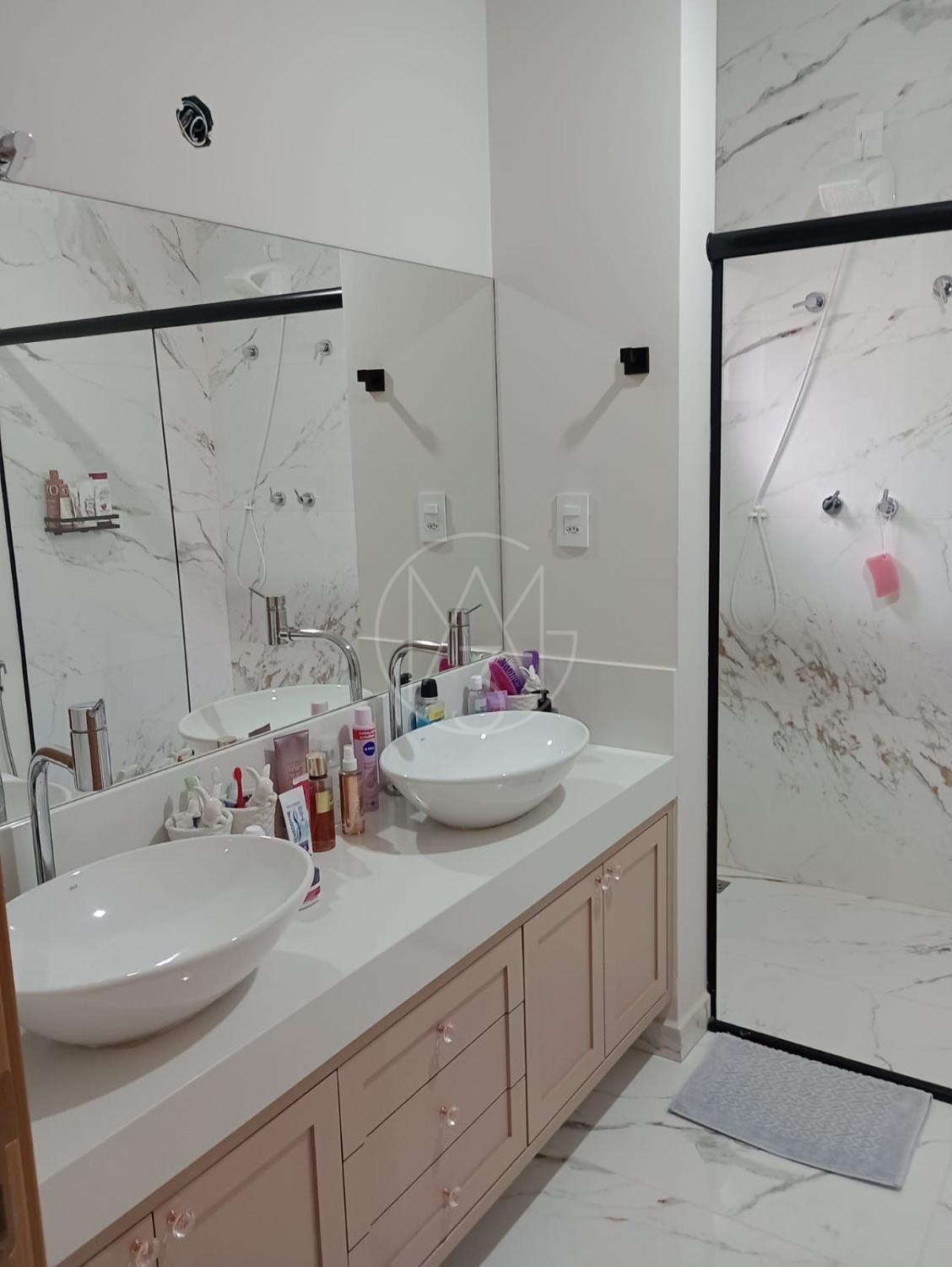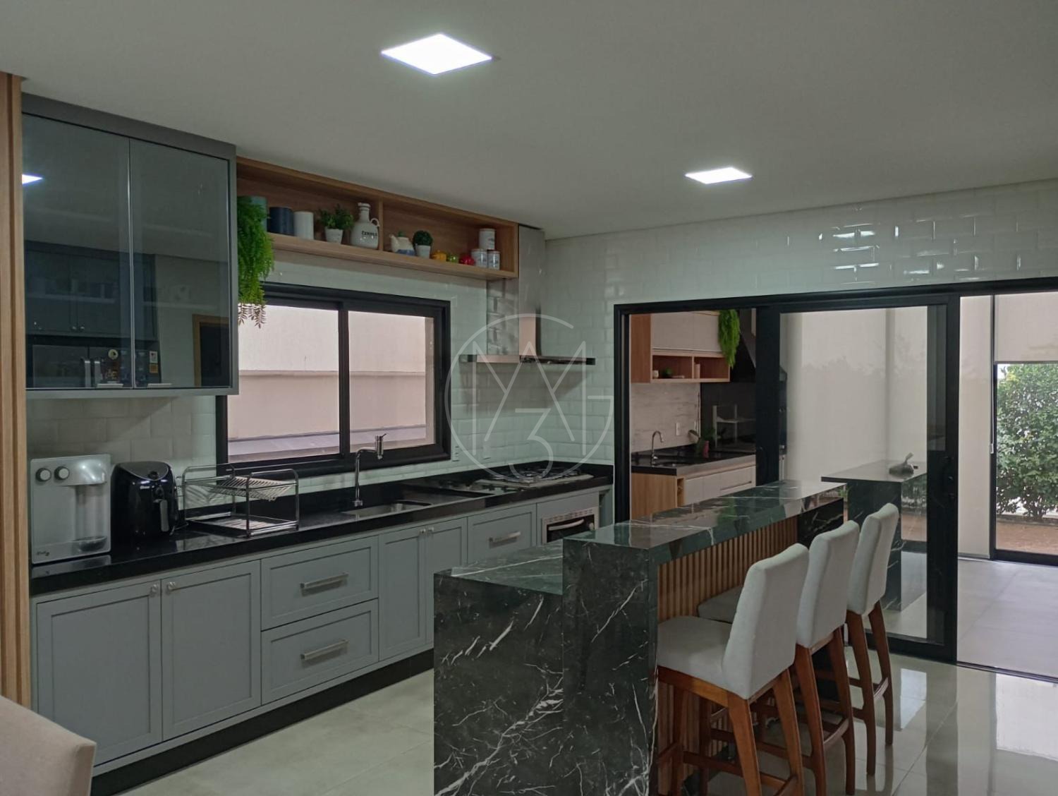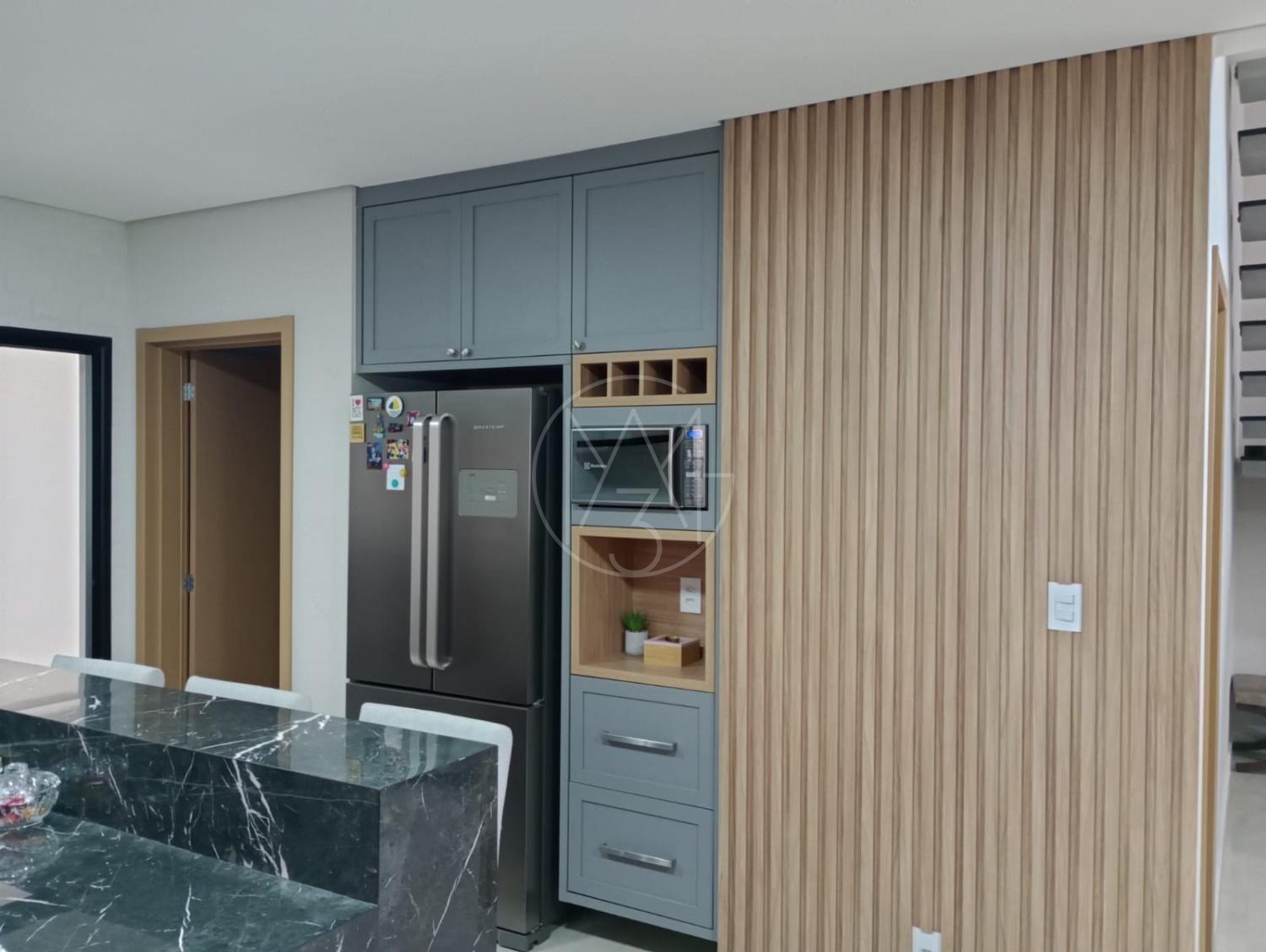 Casa à venda com projeto moderno e funcional, distribuída em dois pavimentos. No térreo, conta com sala de TV/estar, lavabo, sala de jantar, cozinha com ilha e planejados, despensa, área de churrasqueira integrada à cozinha e quintal com persianas e ar-condicionado, banheiro na área externa, lavanderia com planejados e bancada de porcelanato, quintal com canil e pomar de aproximadamente 60 m² e corredor lateral com armário, cobertura e varal.