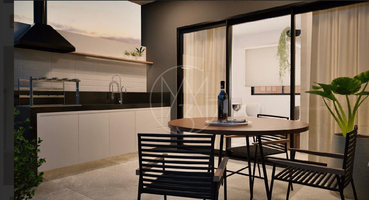 O lavabo foi personalizado com bancada em pedra composta, e as áreas sociais contam com piso em porcelanato de grande formato, que traz elegância e amplitude aos ambientes. As cozinhas e banheiros possuem bancadas em quartzo composto, incluindo bancada dupla na suíte master, além de metais monocomando de linha premium.