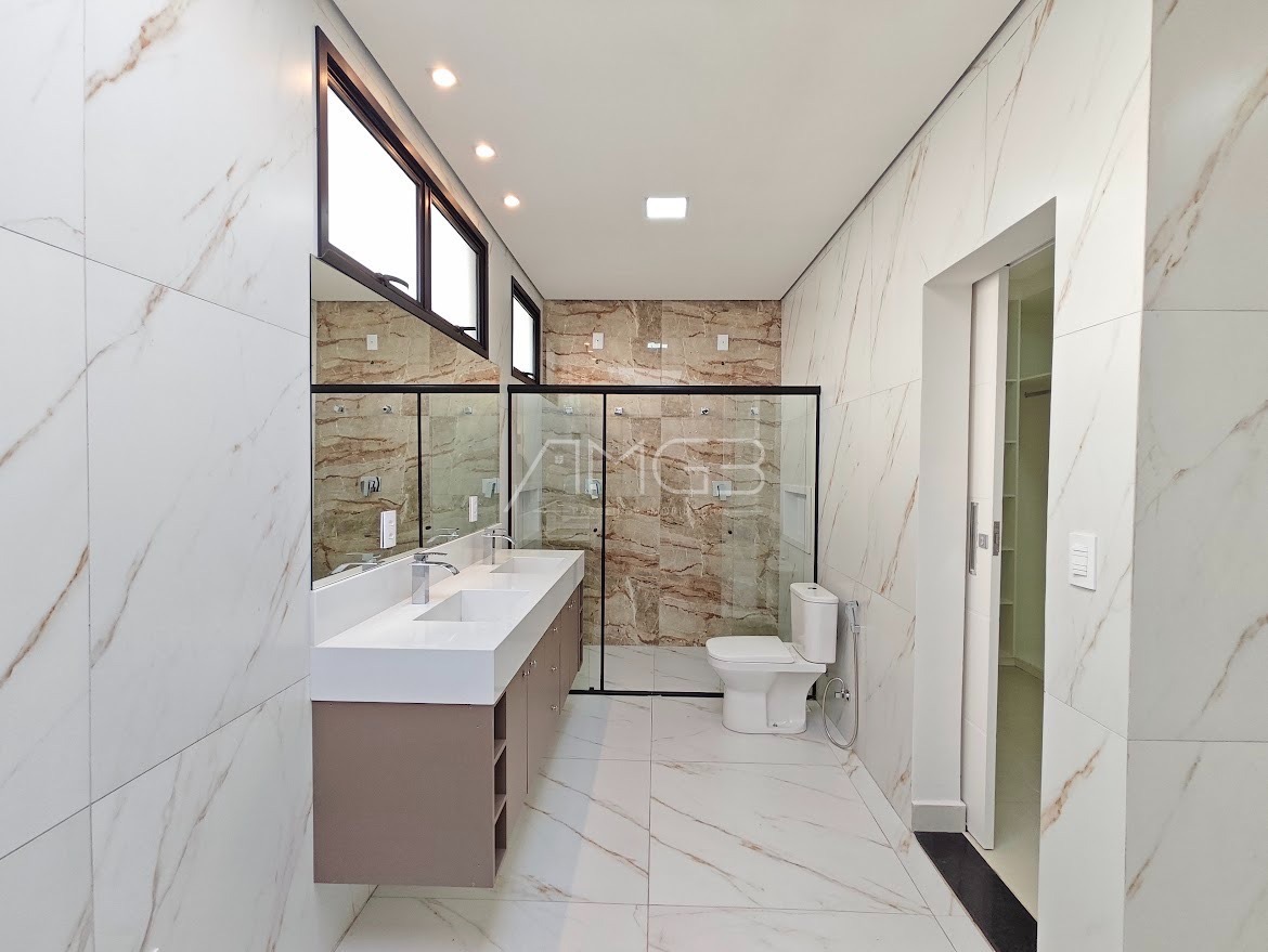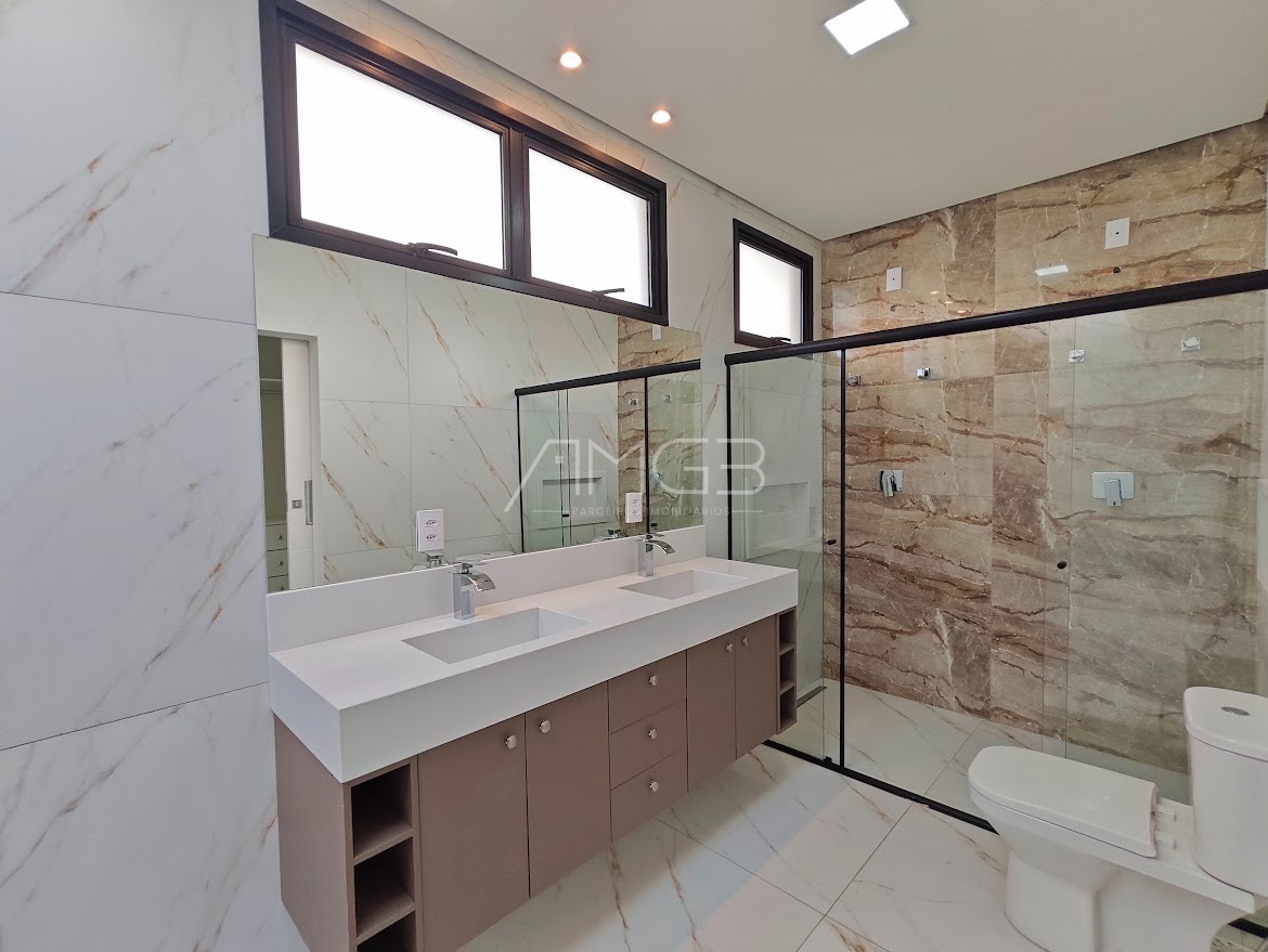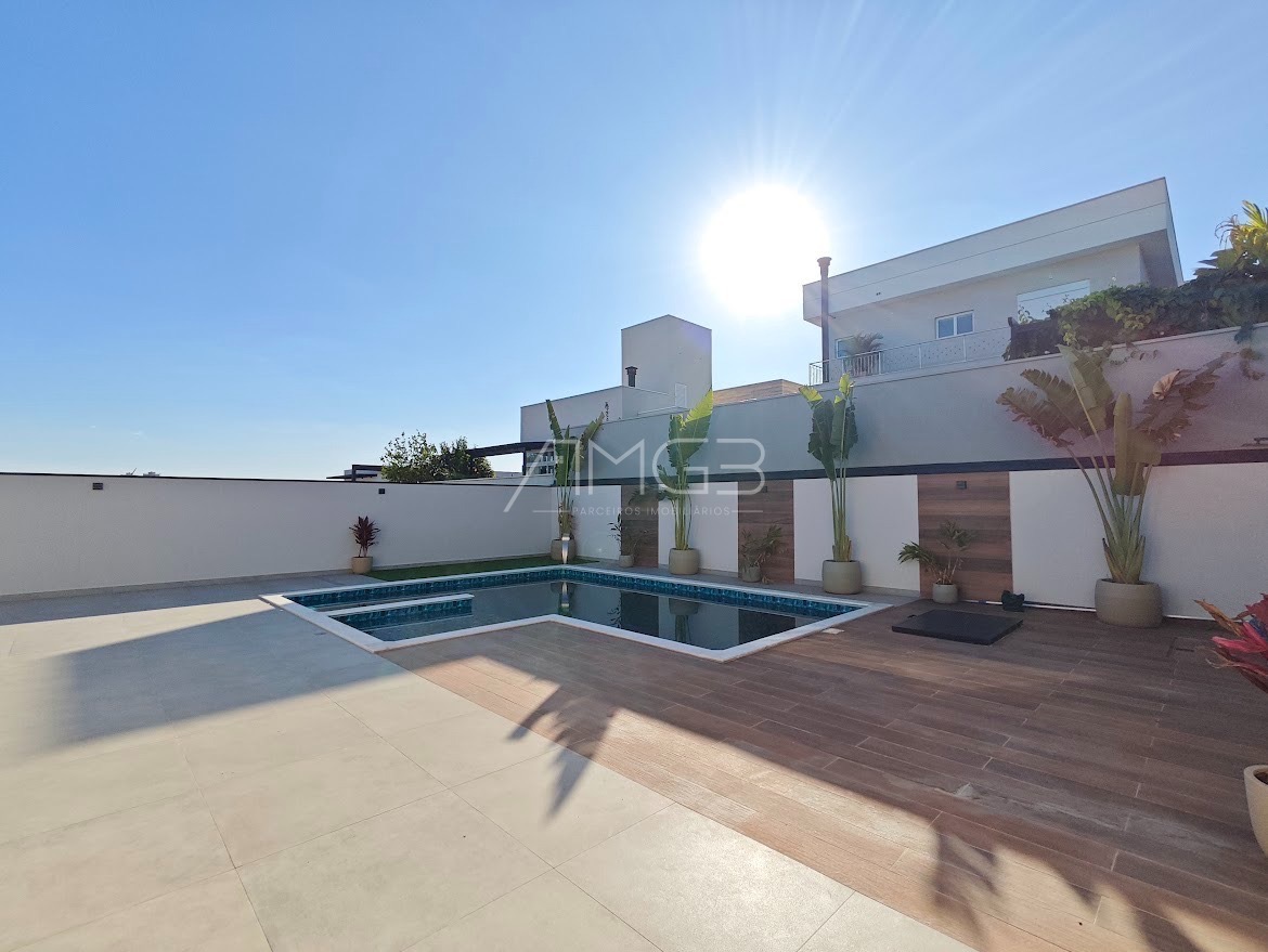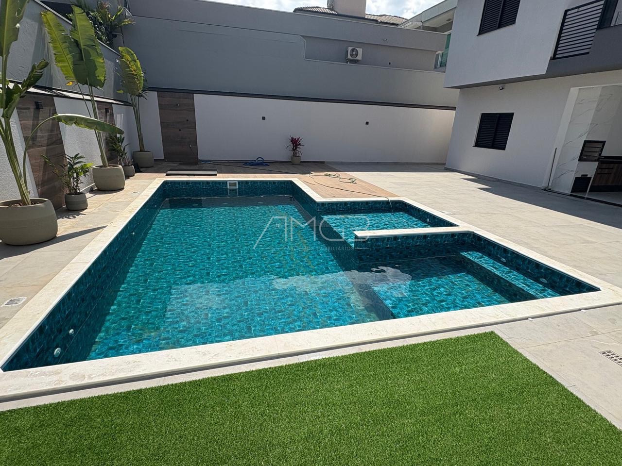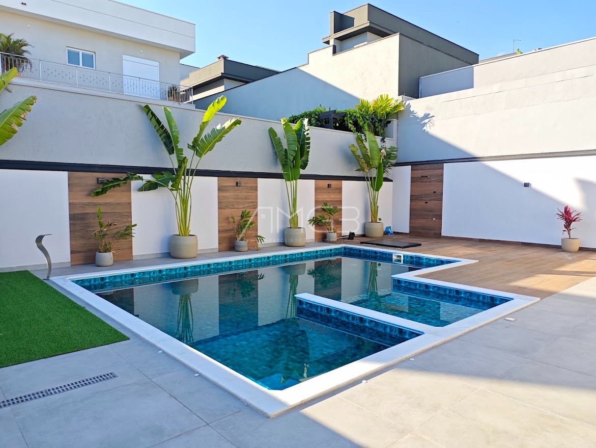 Belíssimo sobrado alto padrão, com 4 suítes completas, com armários no closet e ar condicionado split, suíte master ampla, com spa, projetor no vidro refletivo, varanda privativa com linda vista, living amplo com pé direito duplo e piso italiano, lareira em mármore, lavabo, escritório com opção de 5 suíte, sala jantar com adega, sala de cinema com projetor e som profissional, cozinha planejada com pastilhas importadas e equipamentos Elettromec, despensa, dependência de empregada, amplo espaço gourmet com chopeira Naja profissional, churrasqueira carvão e a gás, 2 cervejeiras, máquina de gelo, wc masculino e feminino, piscina aquecida com deck e prainha, pergolado, lindo paisagismo, garagem fechada para 7 carros cobertos, toda monitorada com sistema de segurança avançado, sistema de ar condicionado diferenciado e também de aspiração.