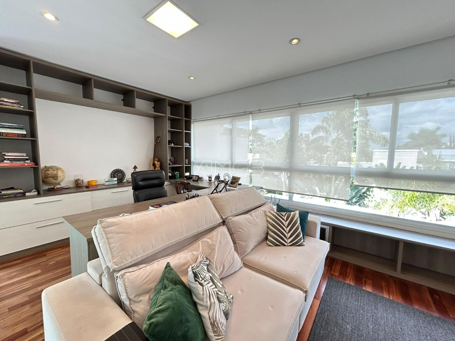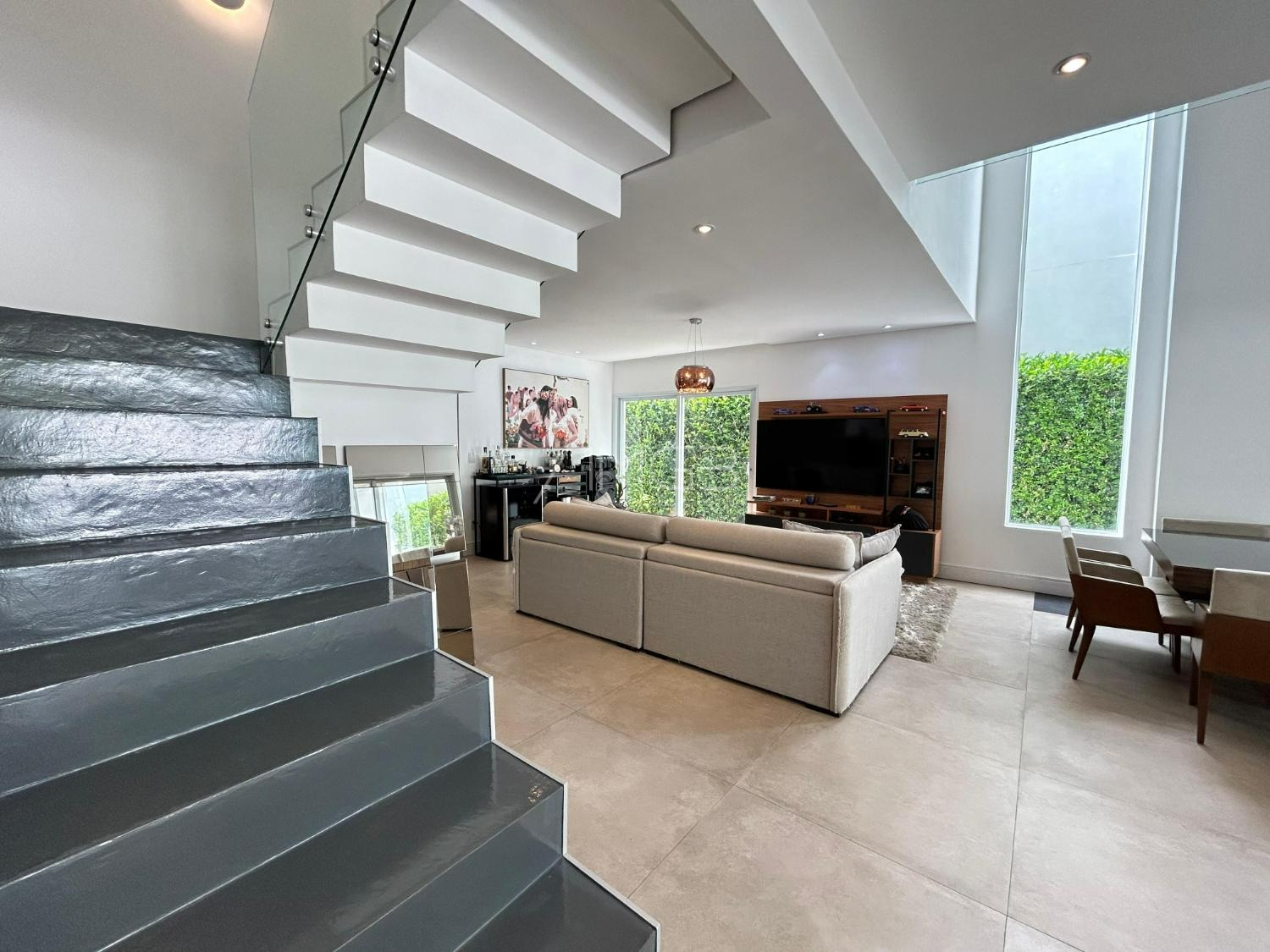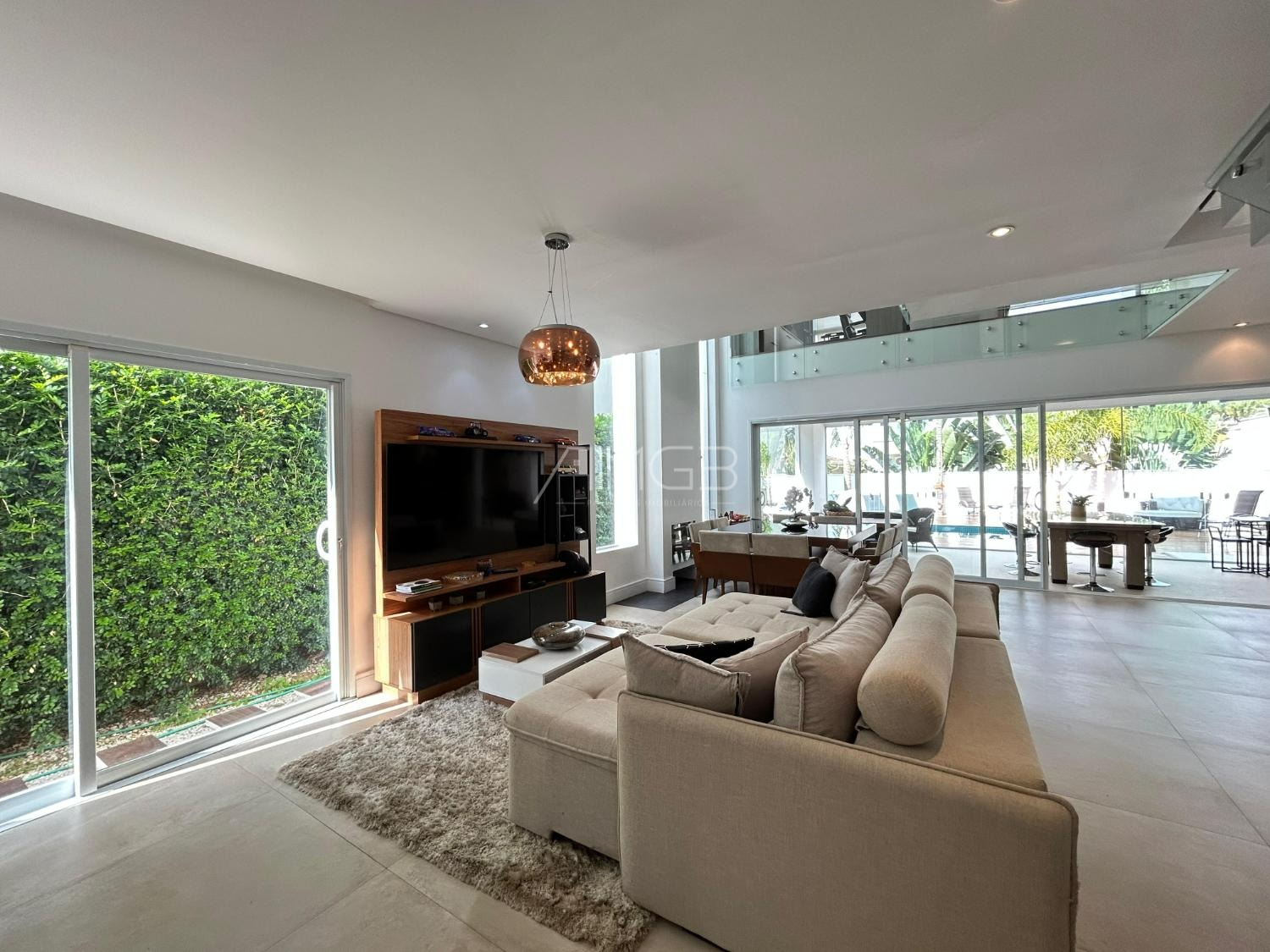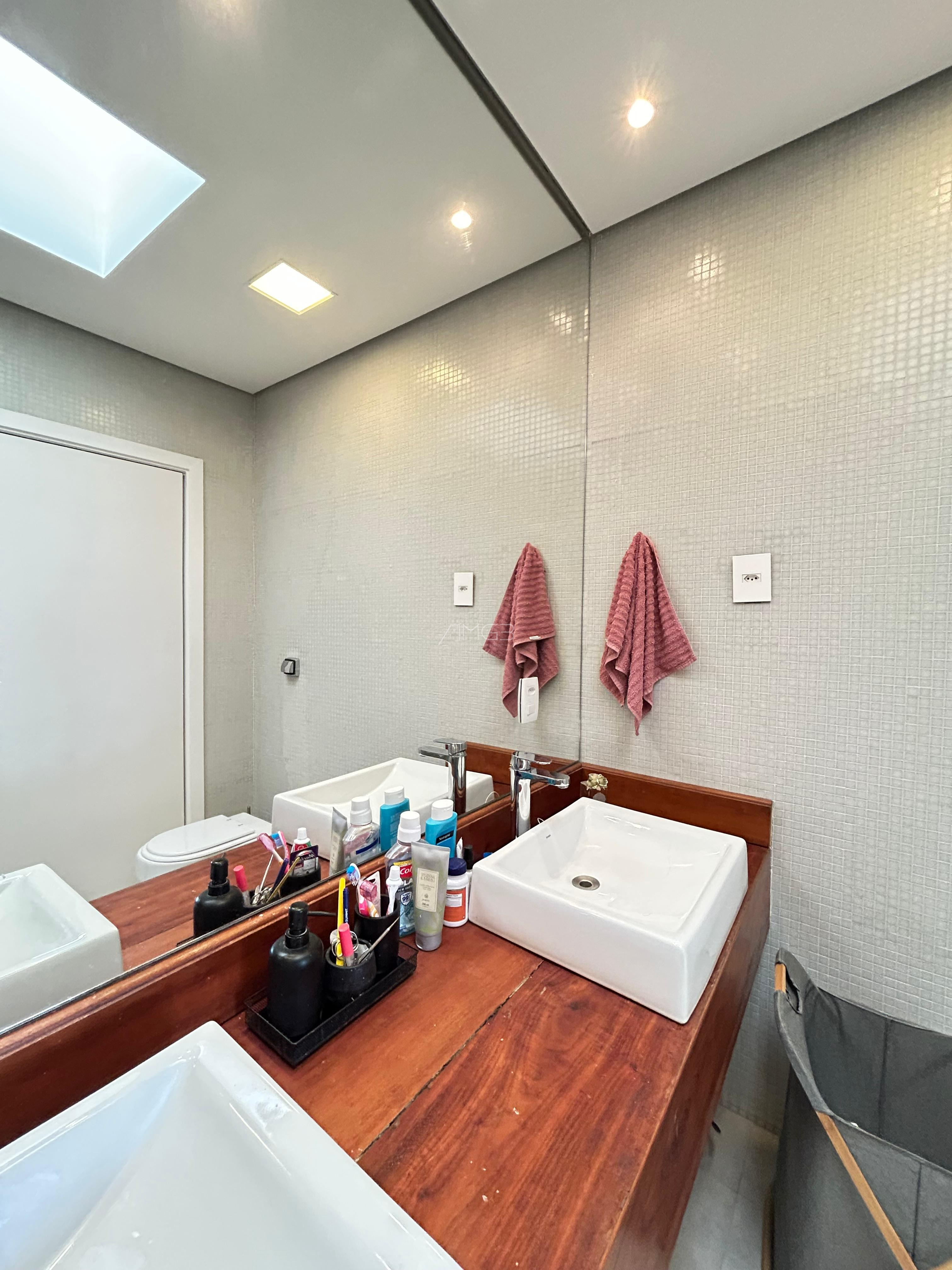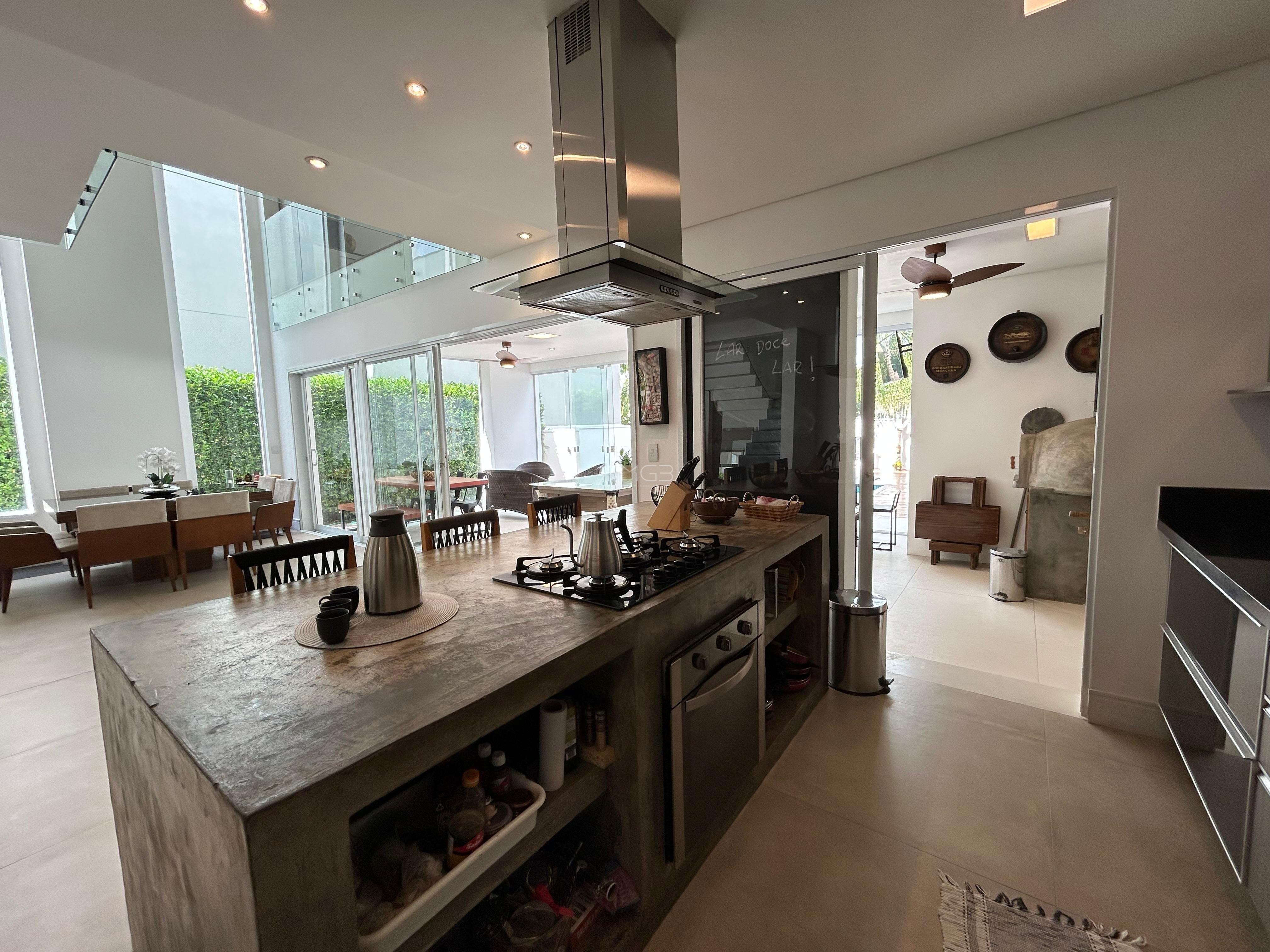O imóvel conta com 3 suites, 2 closets, 5 banheiros, além de sala de estar e sala de jantar integradas, lavabo, escritório e uma elegante cozinha americana,