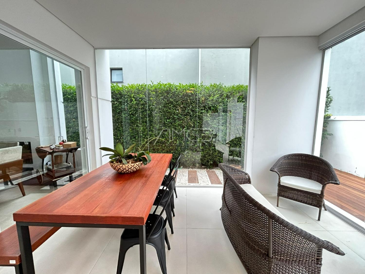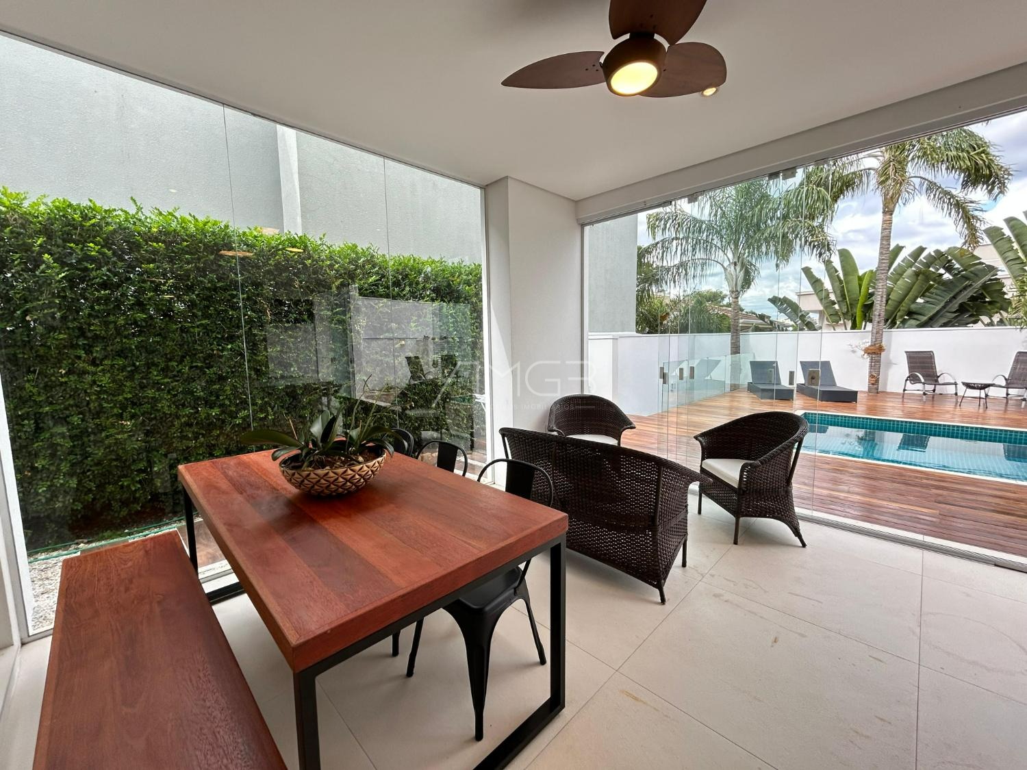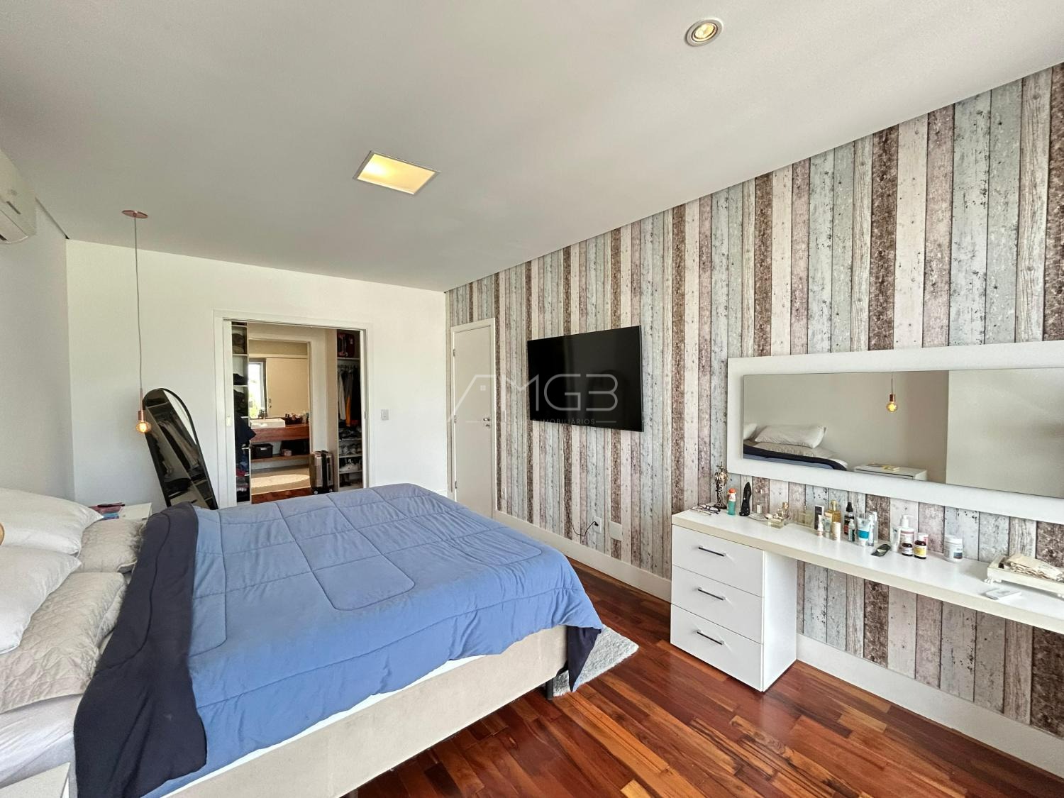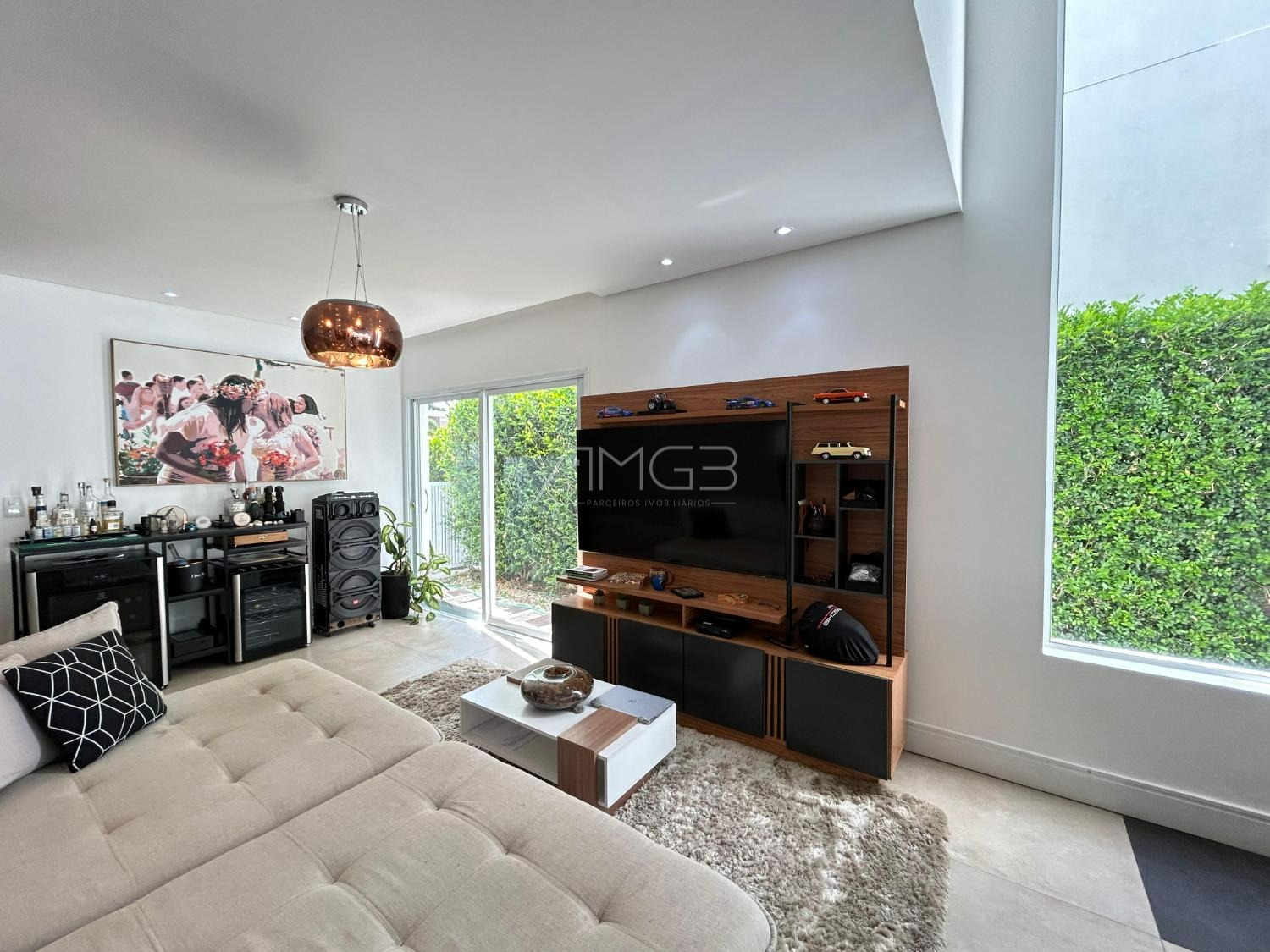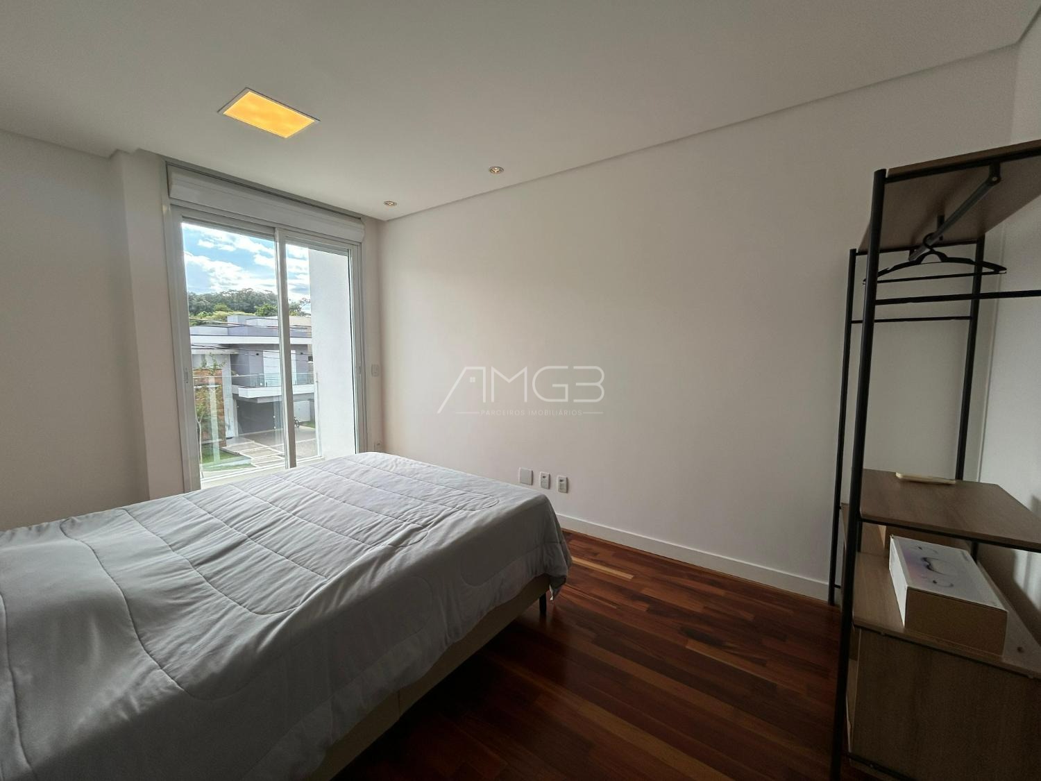 O imóvel conta com 3 suites, 2 closets, 5 banheiros, além de sala de estar e sala de jantar integradas, lavabo, escritório e uma elegante cozinha americana,