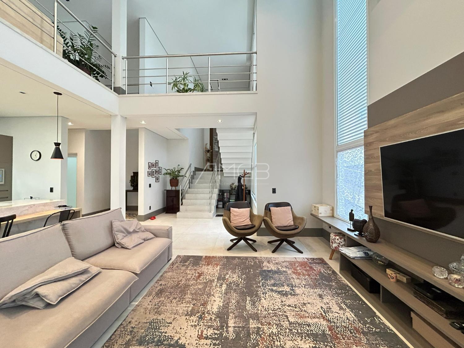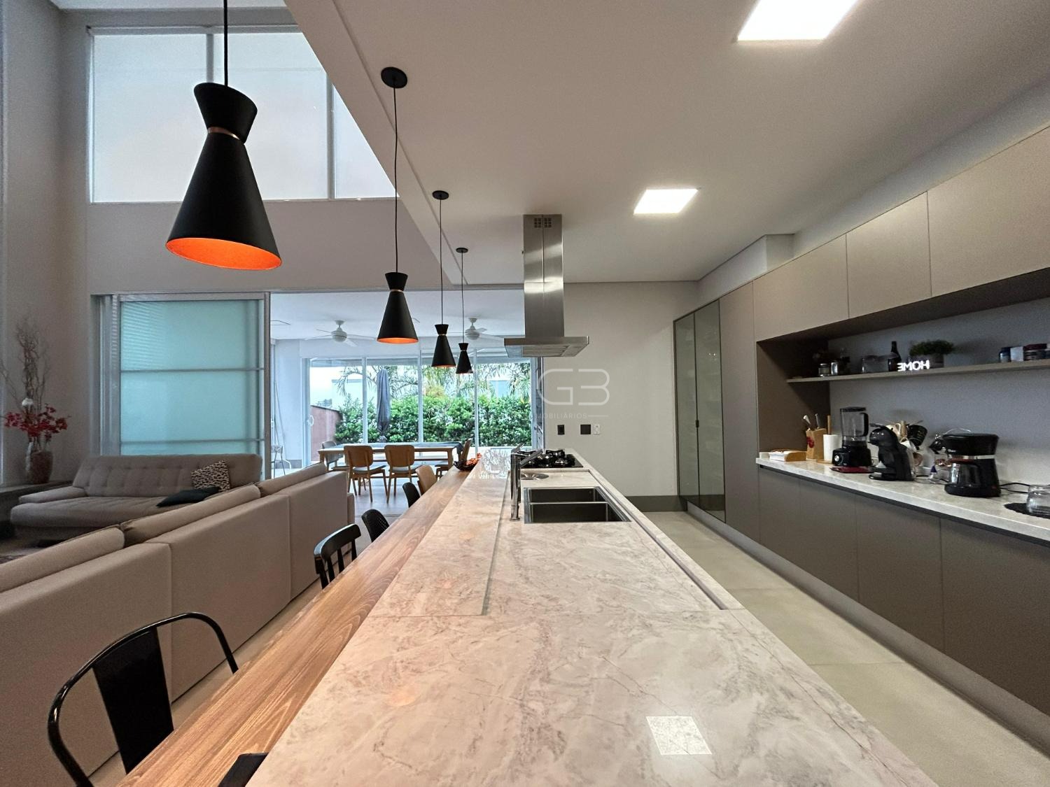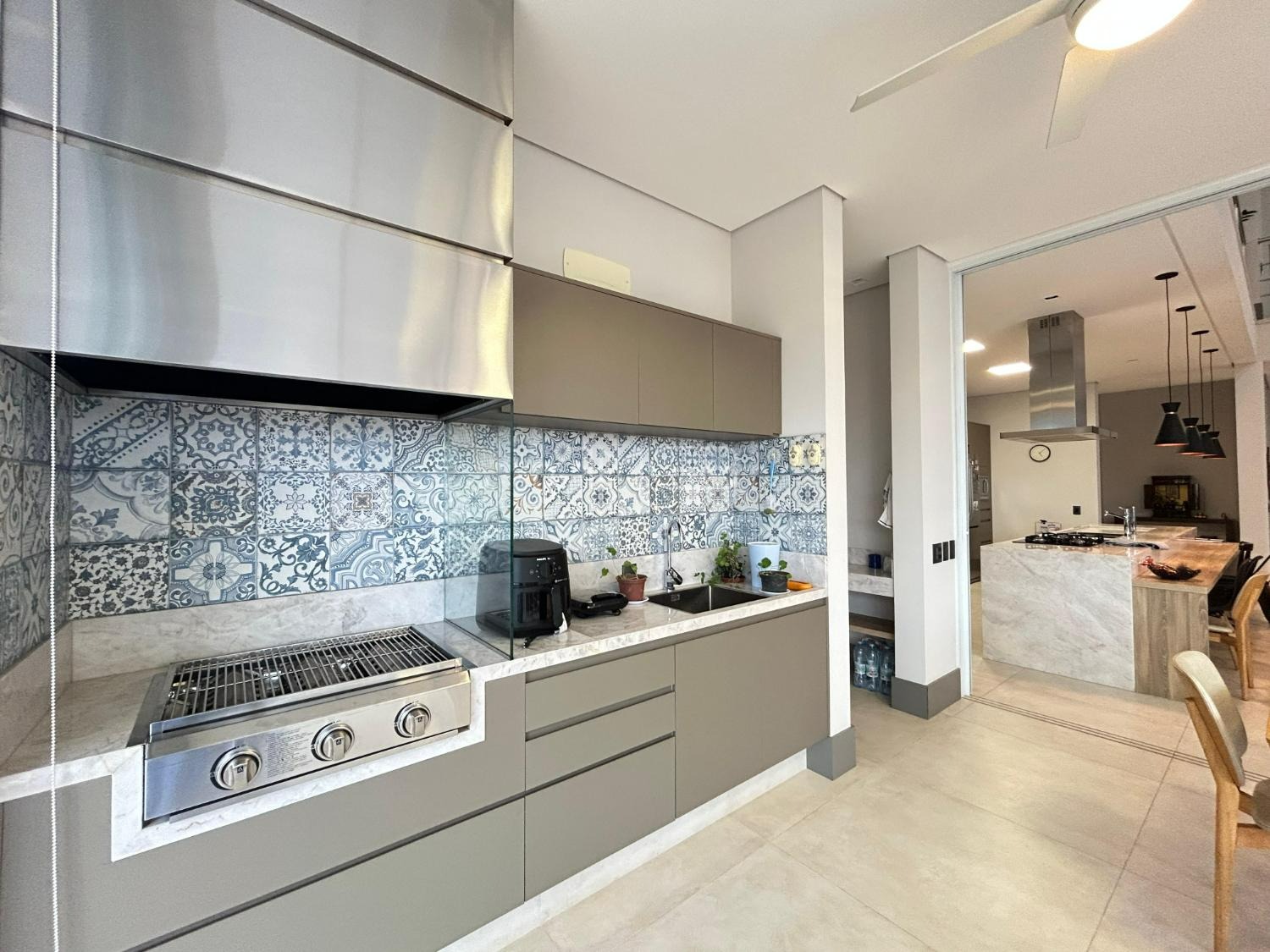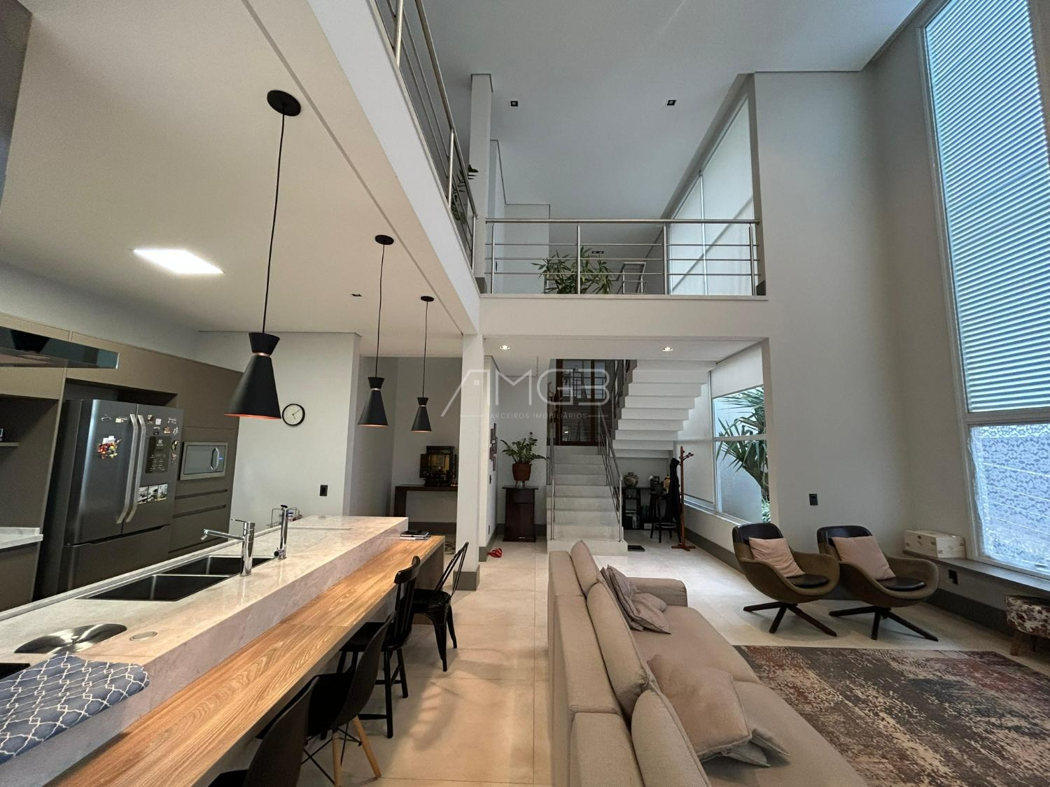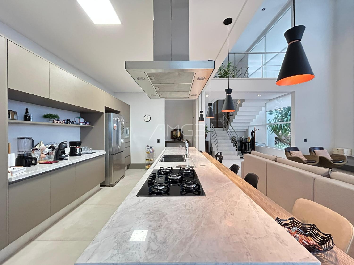 Ampla área gourmet integrada à sala de estar, escritório no piso superior.