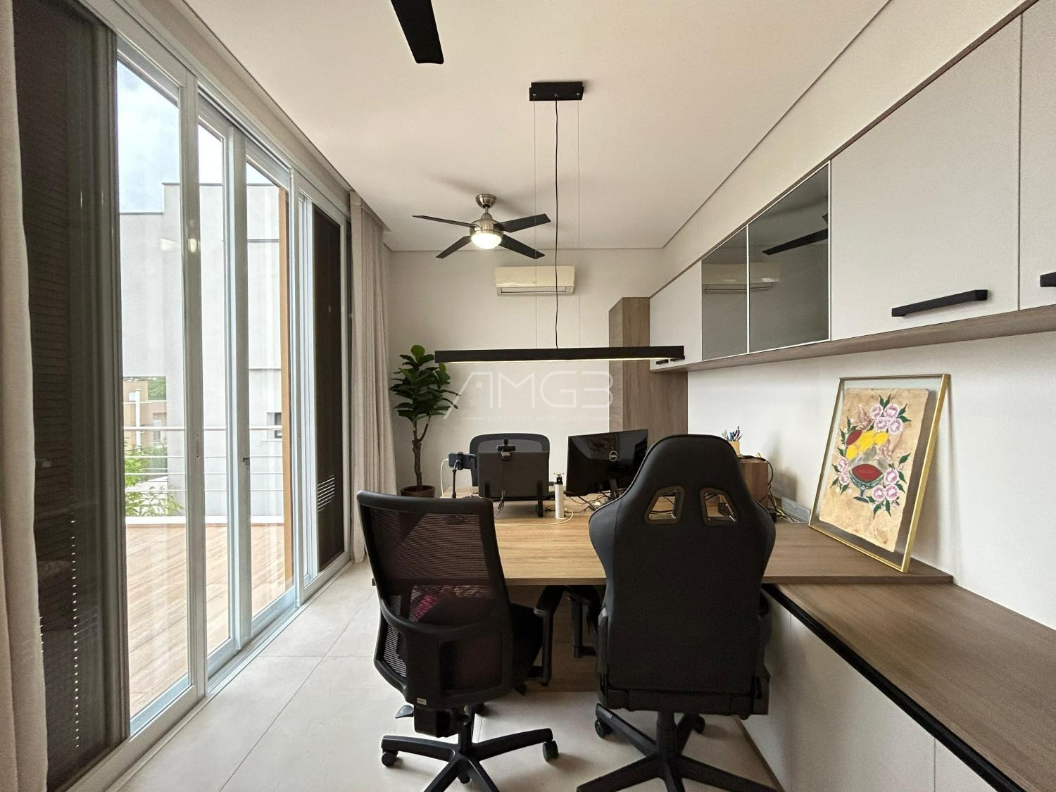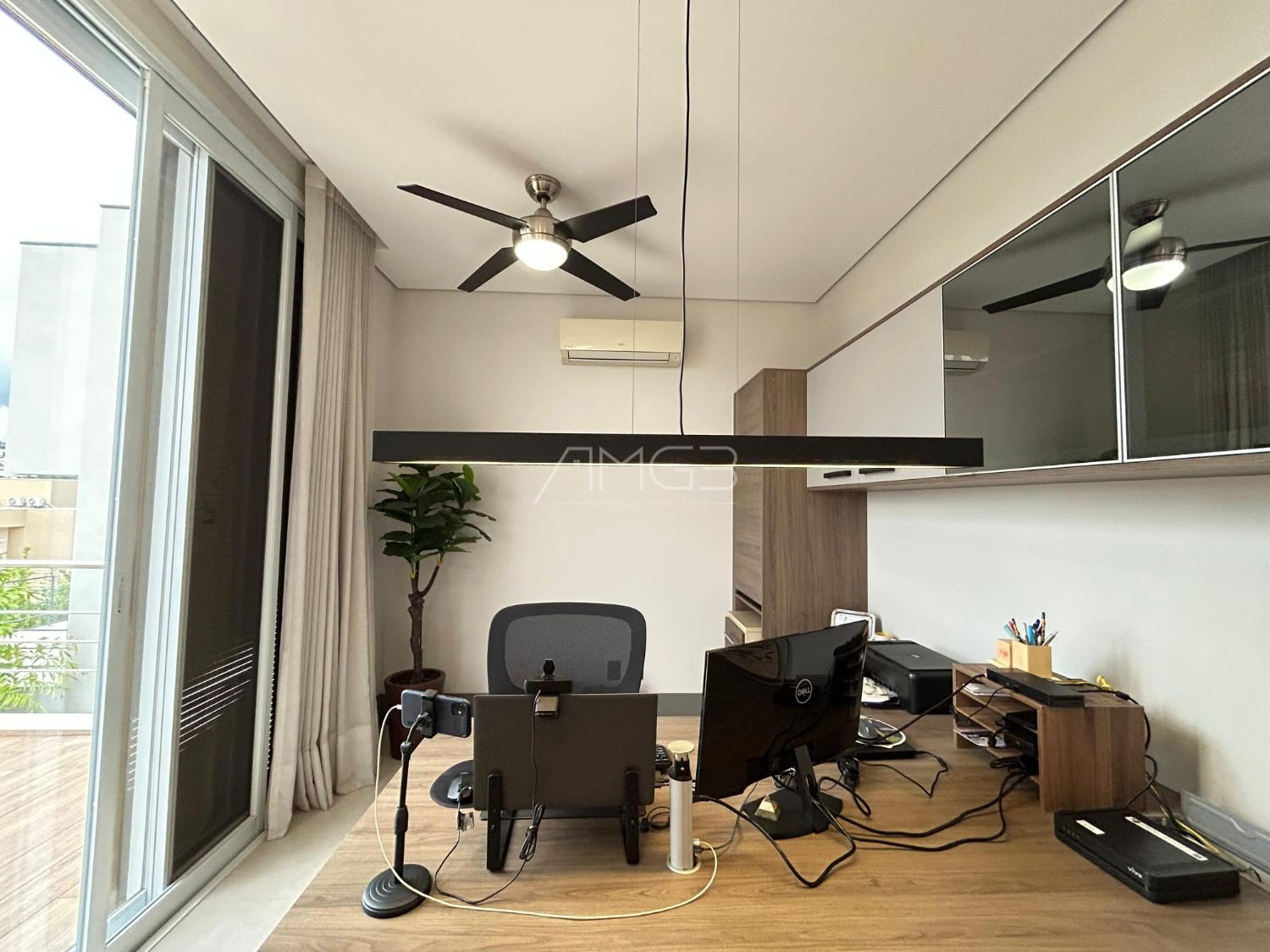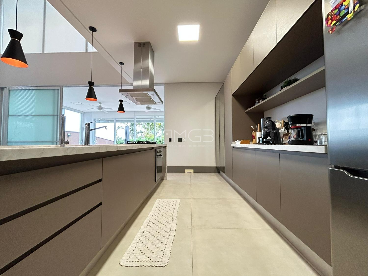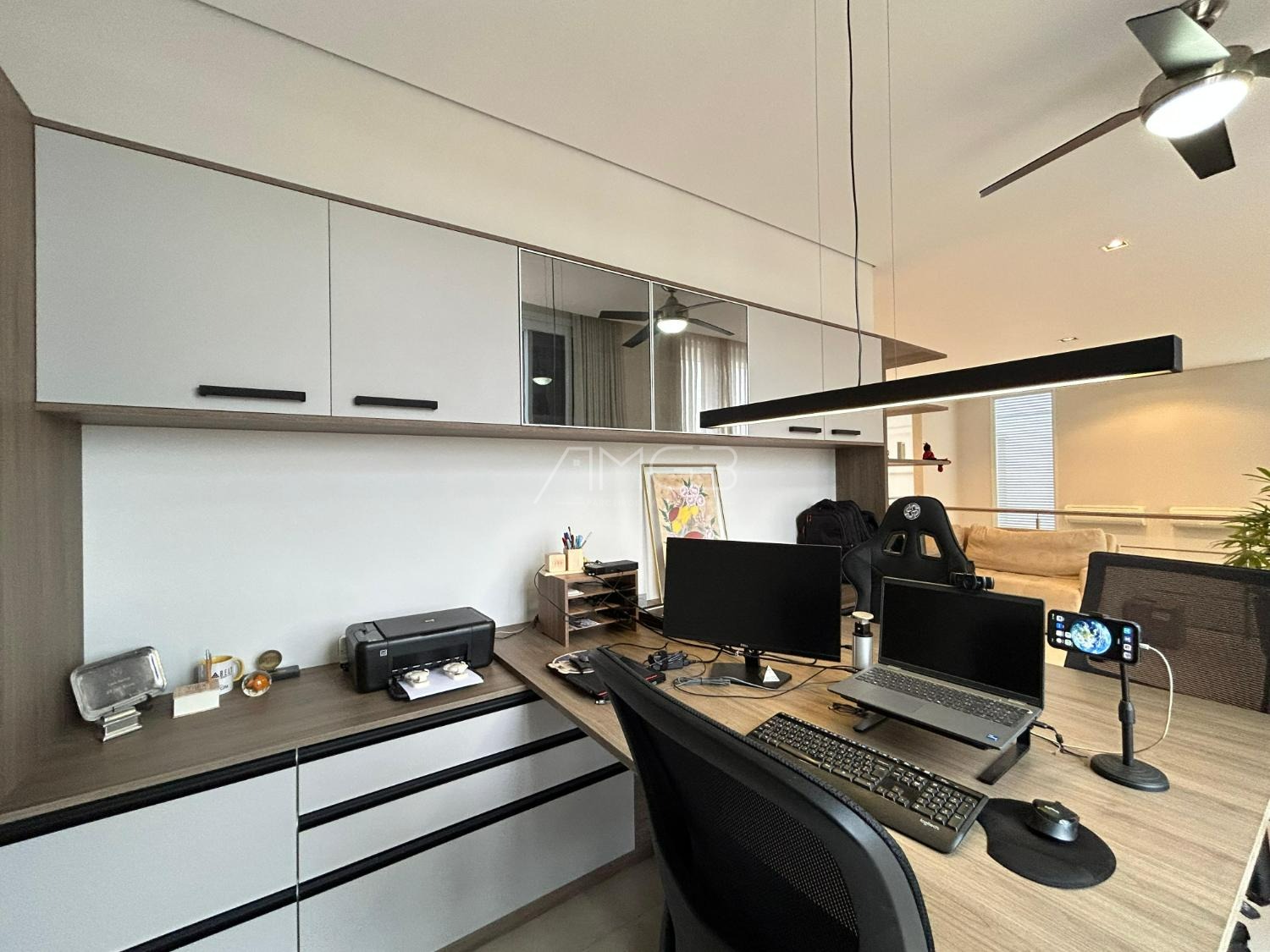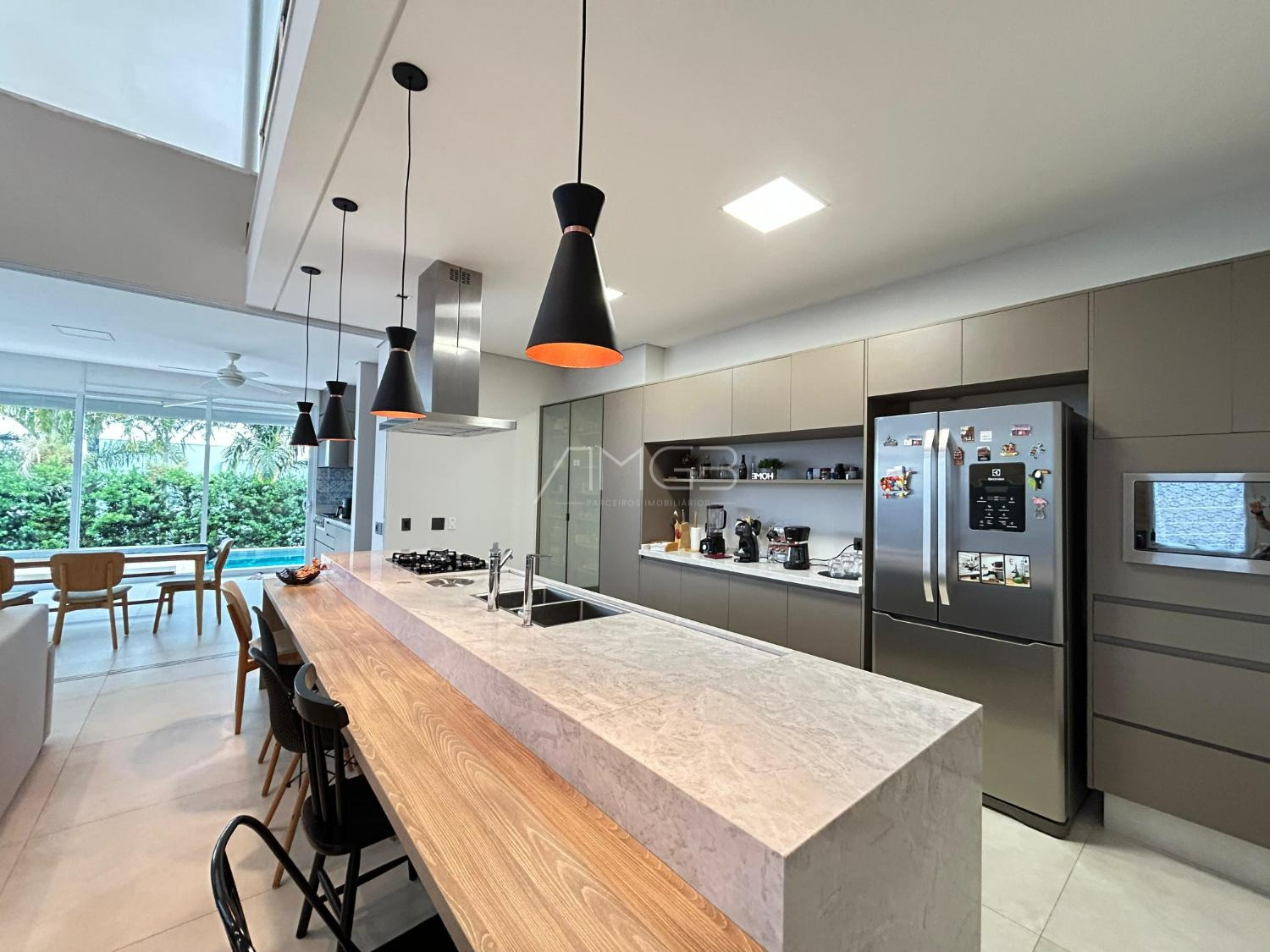 Ampla área gourmet integrada à sala de estar, escritório no piso superior.