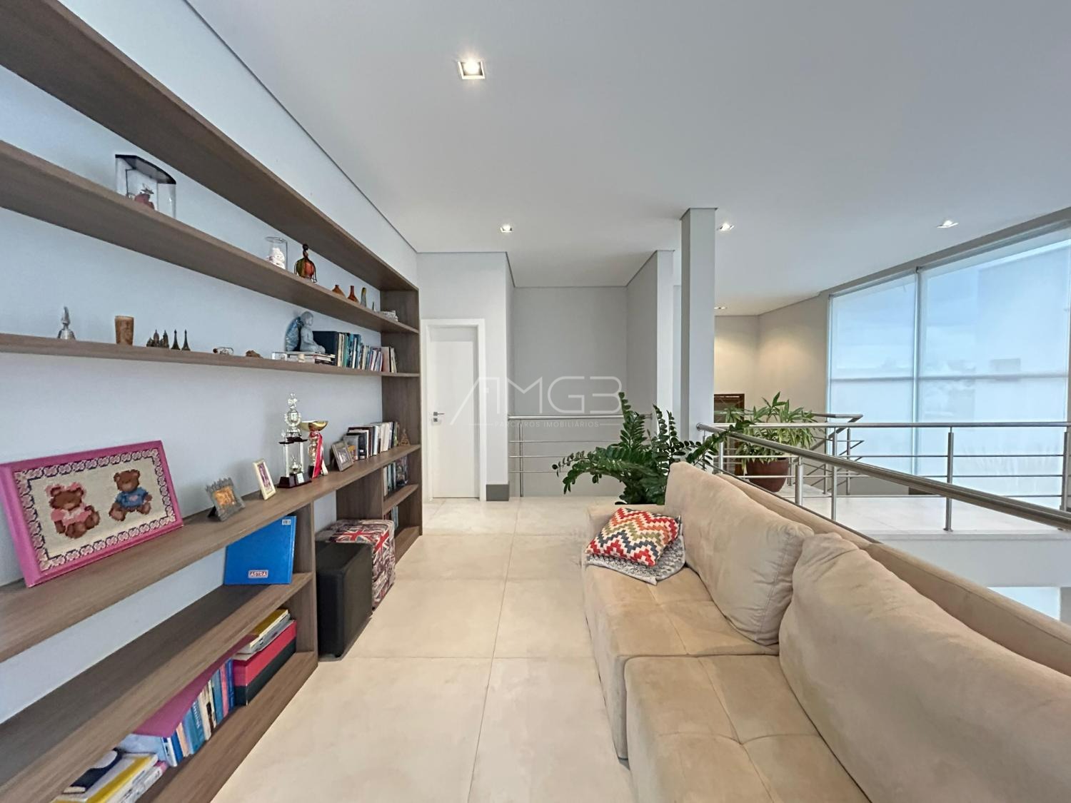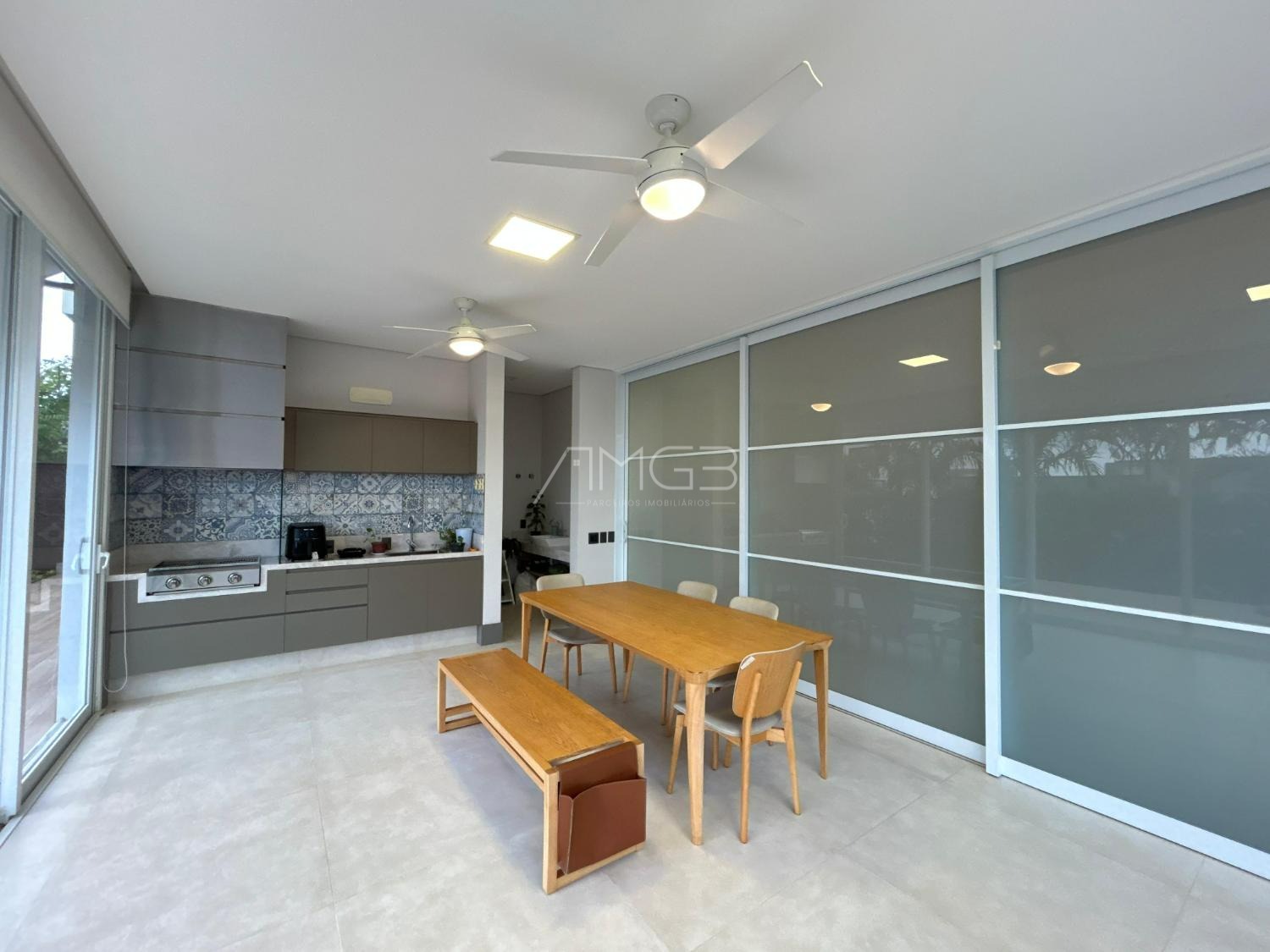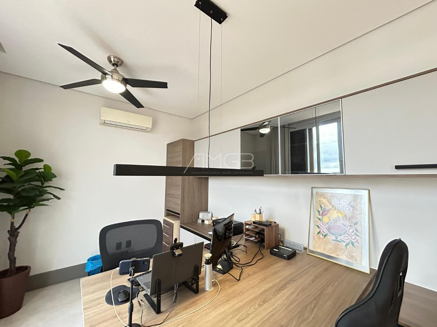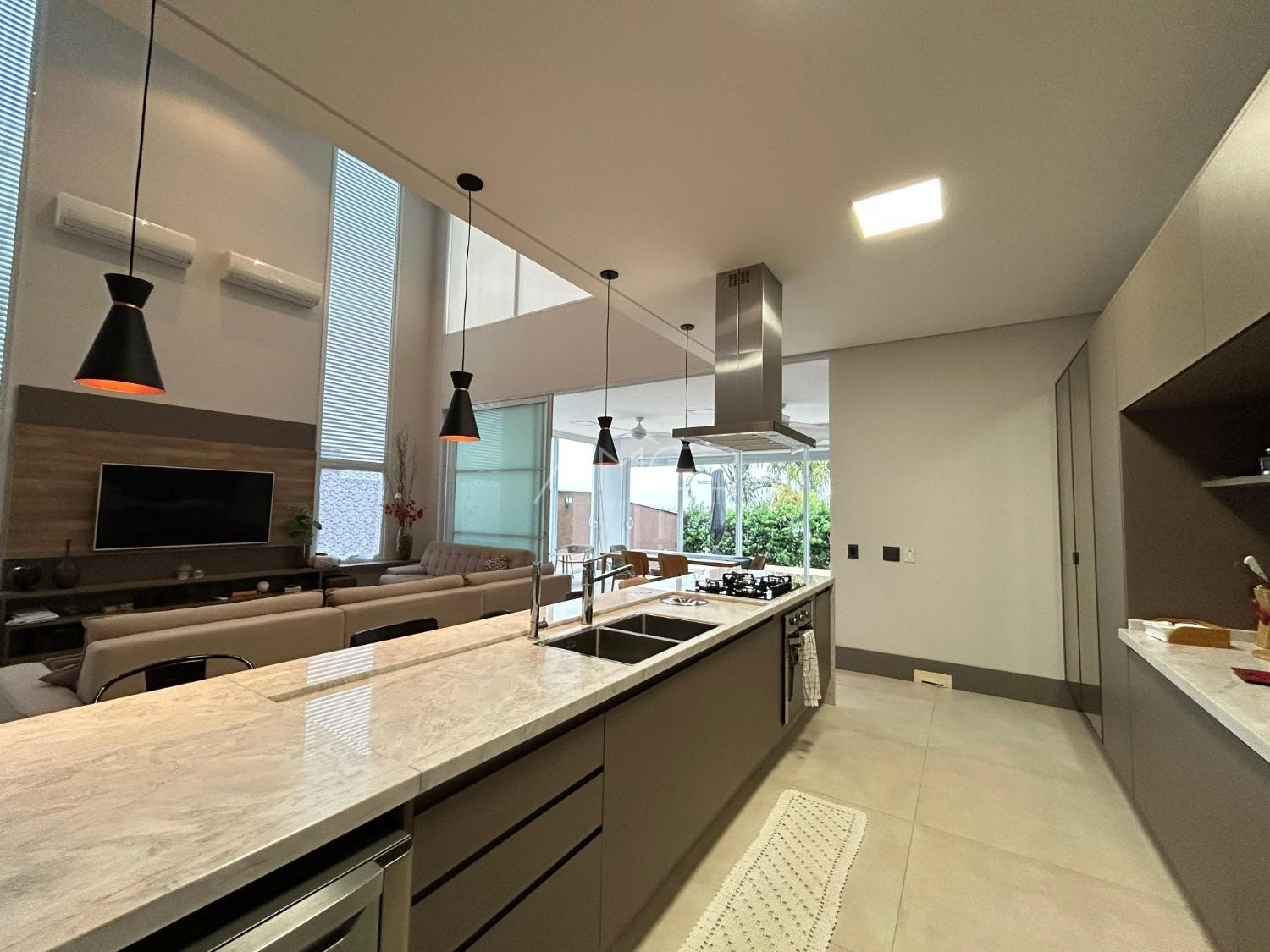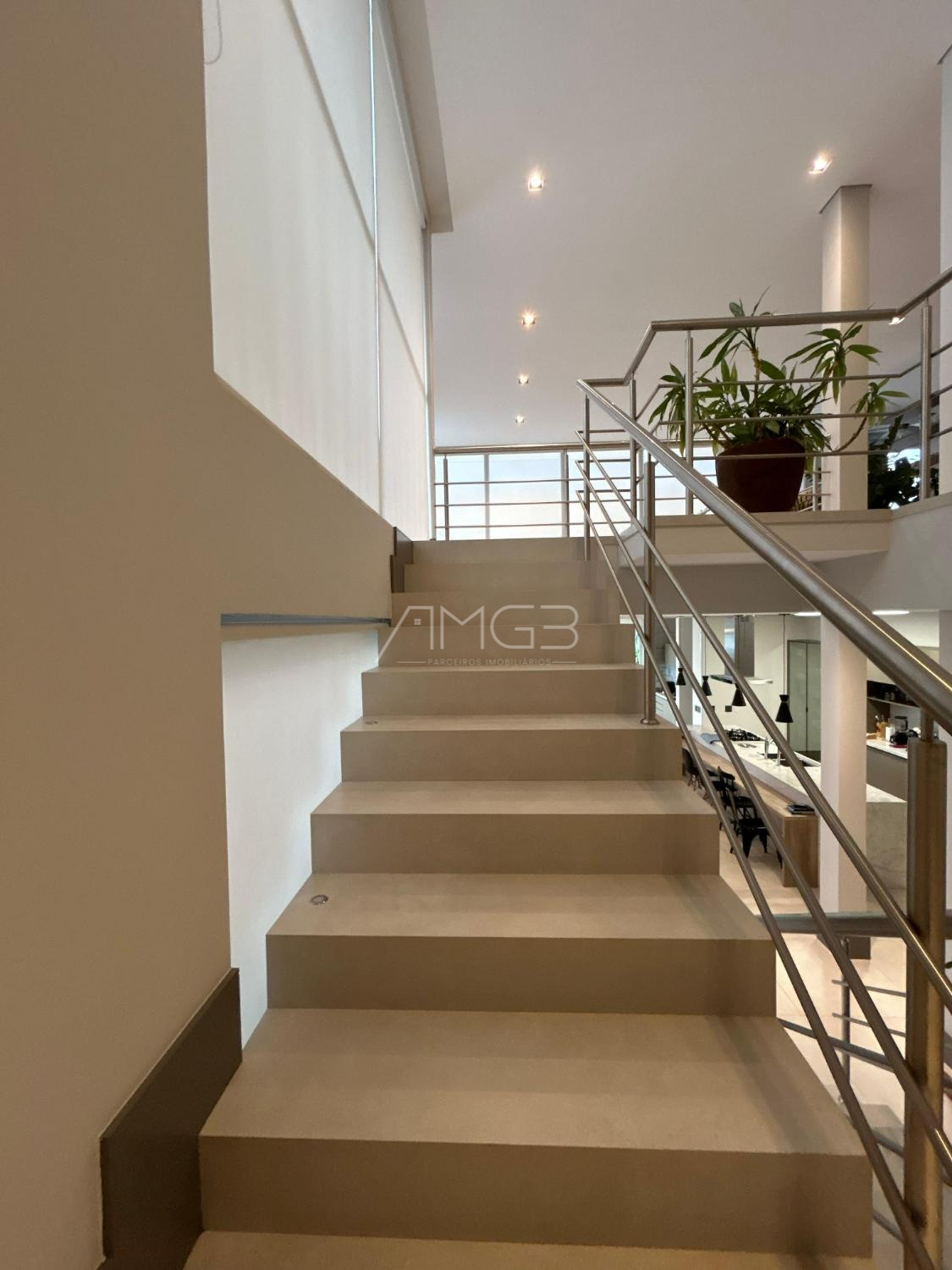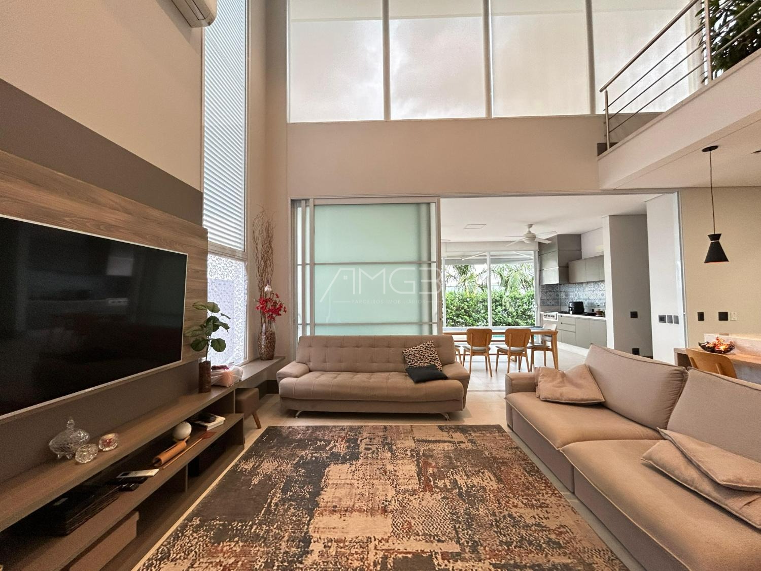 Ampla área gourmet integrada à sala de estar, escritório no piso superior.