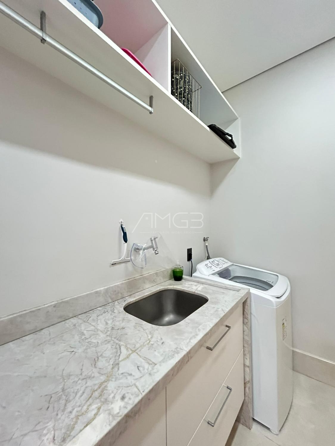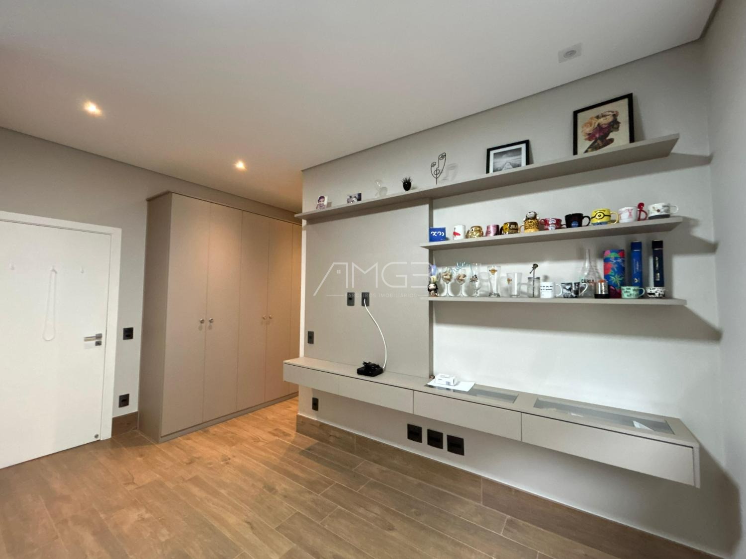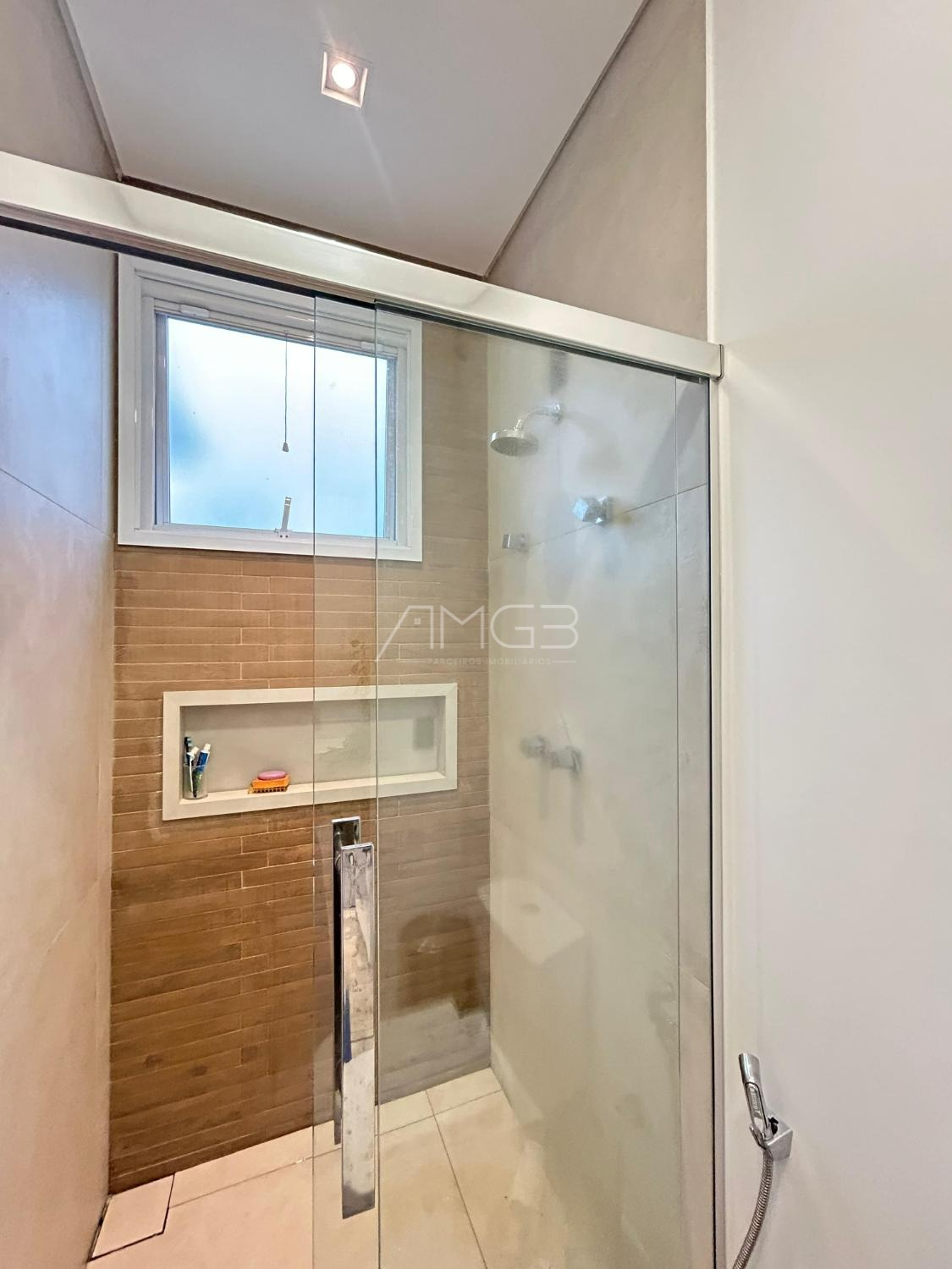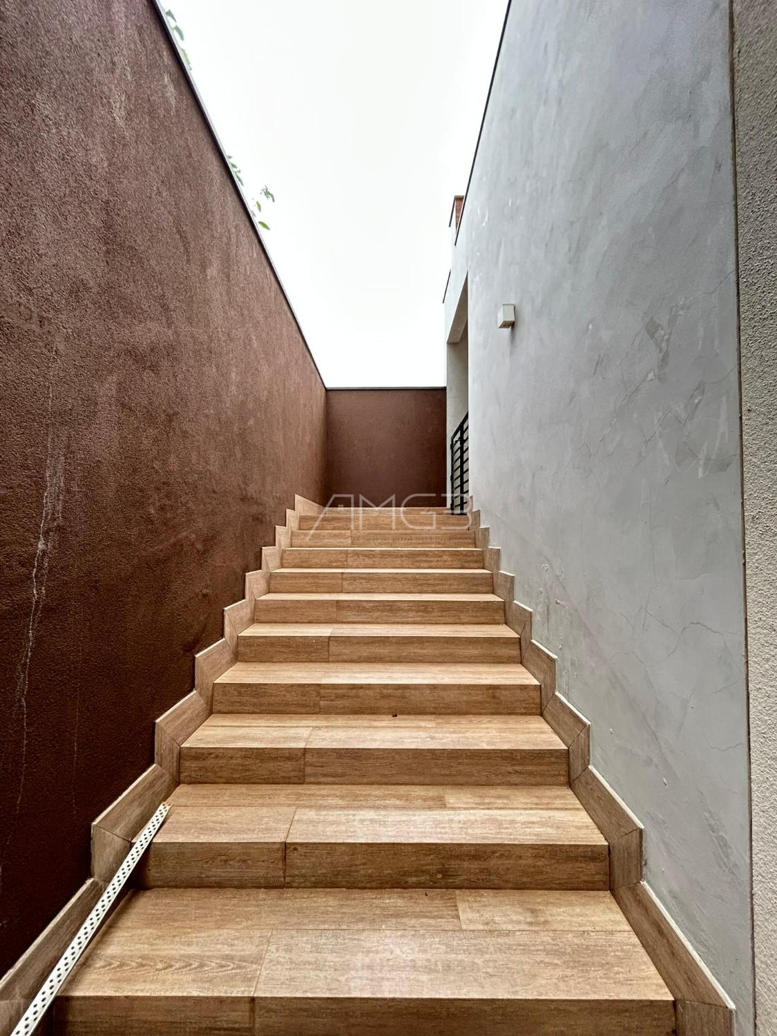 Projeto diferenciado com 3 suítes, sendo 2 no térreo e 1 no piso superior. Roupeiro anexo à suíte do piso superior, cozinha americana.