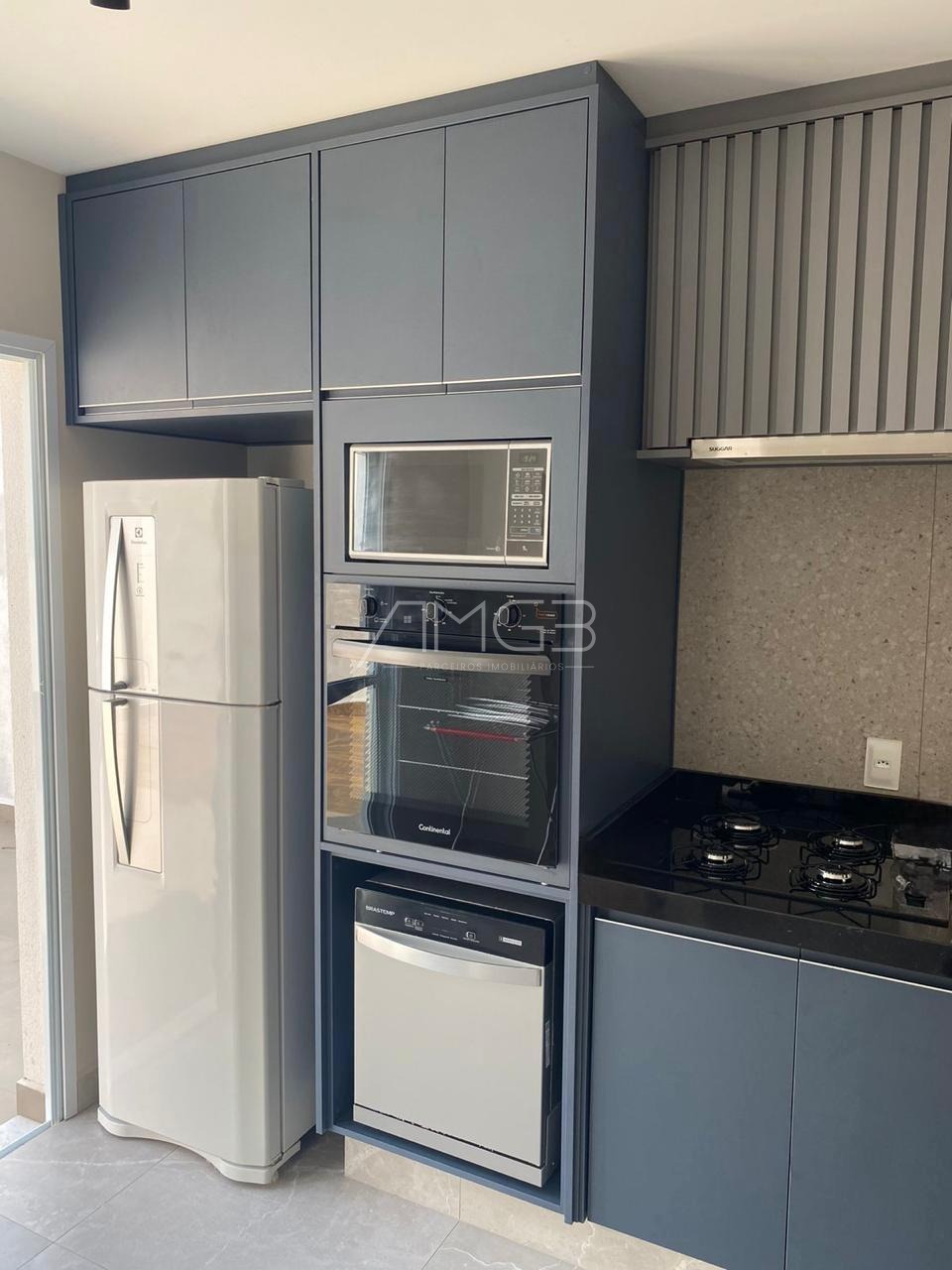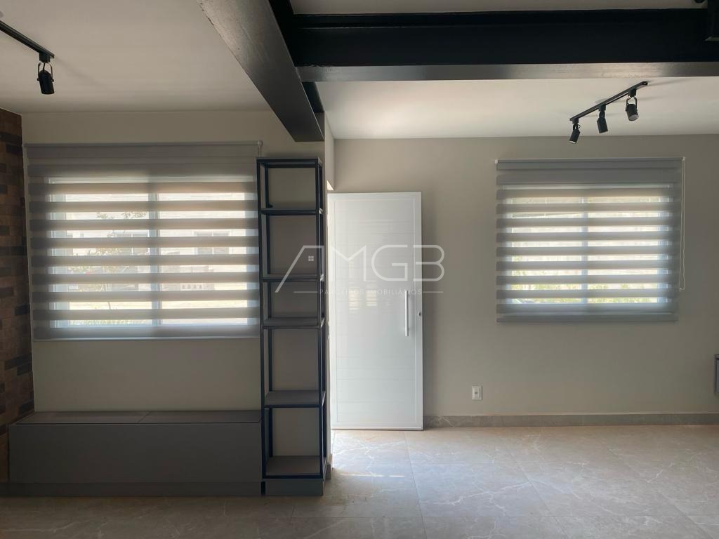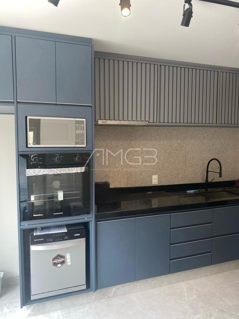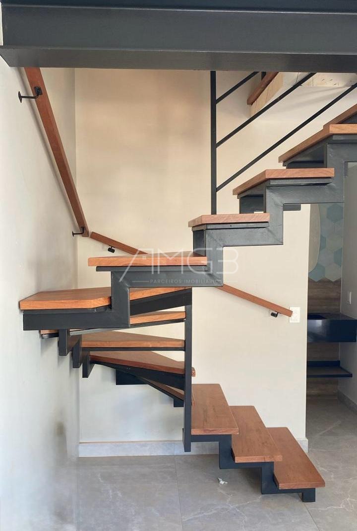 A cozinha é ampla e moderna, equipada com armários embutidos, torre quente, cooktop de quatro bocas, forno elétrico, exaustor, bancadas em granito negresco e cuba ampla, oferecendo praticidade e sofisticação no dia a dia. A área social dispõe de sala de estar e sala de TV, ambas com móveis planejados, cortinas e excelente aproveitamento de espaço. A escada é revestida em madeira tamarindo com corrimão, agregando charme e elegância ao ambiente.