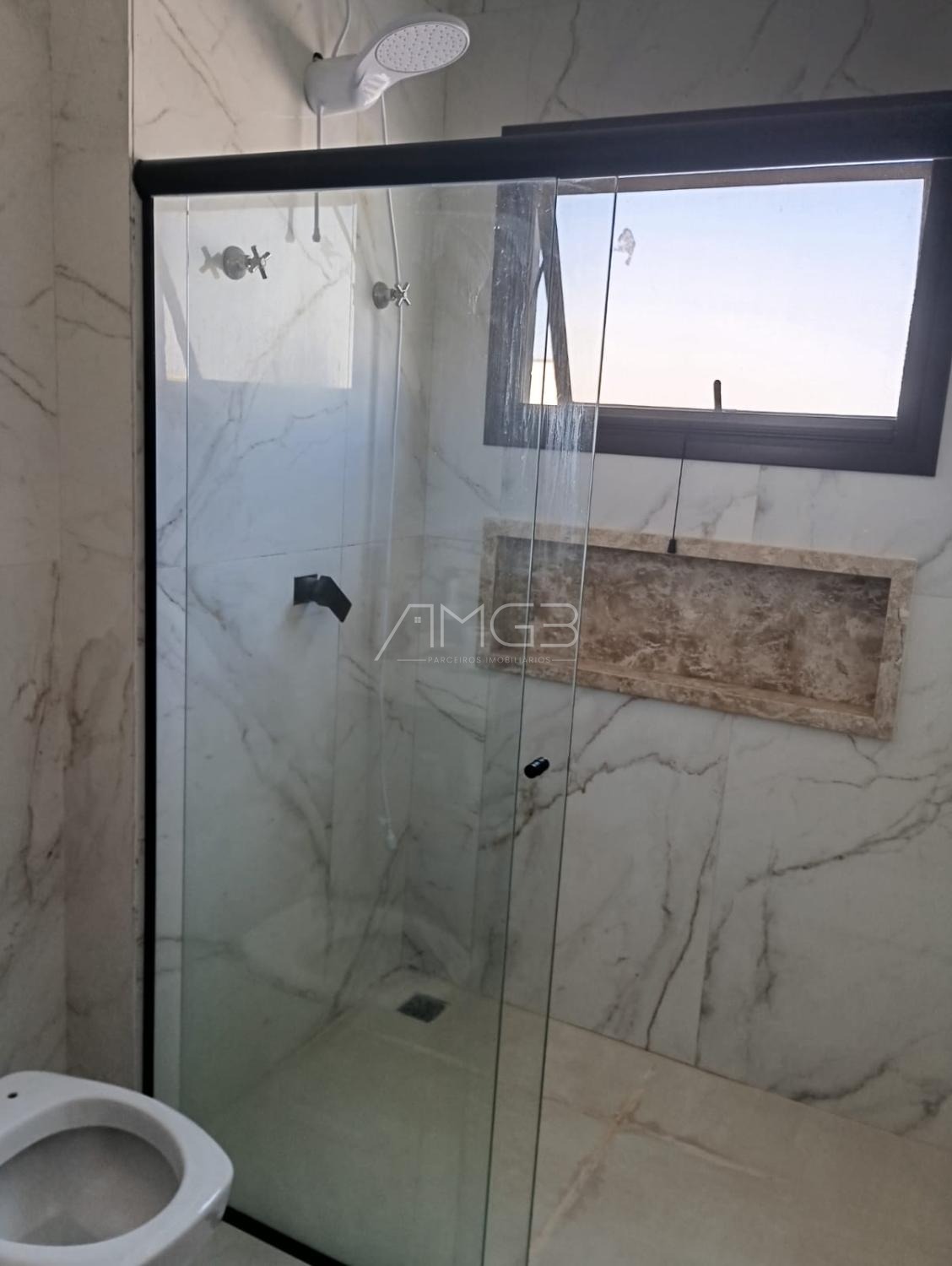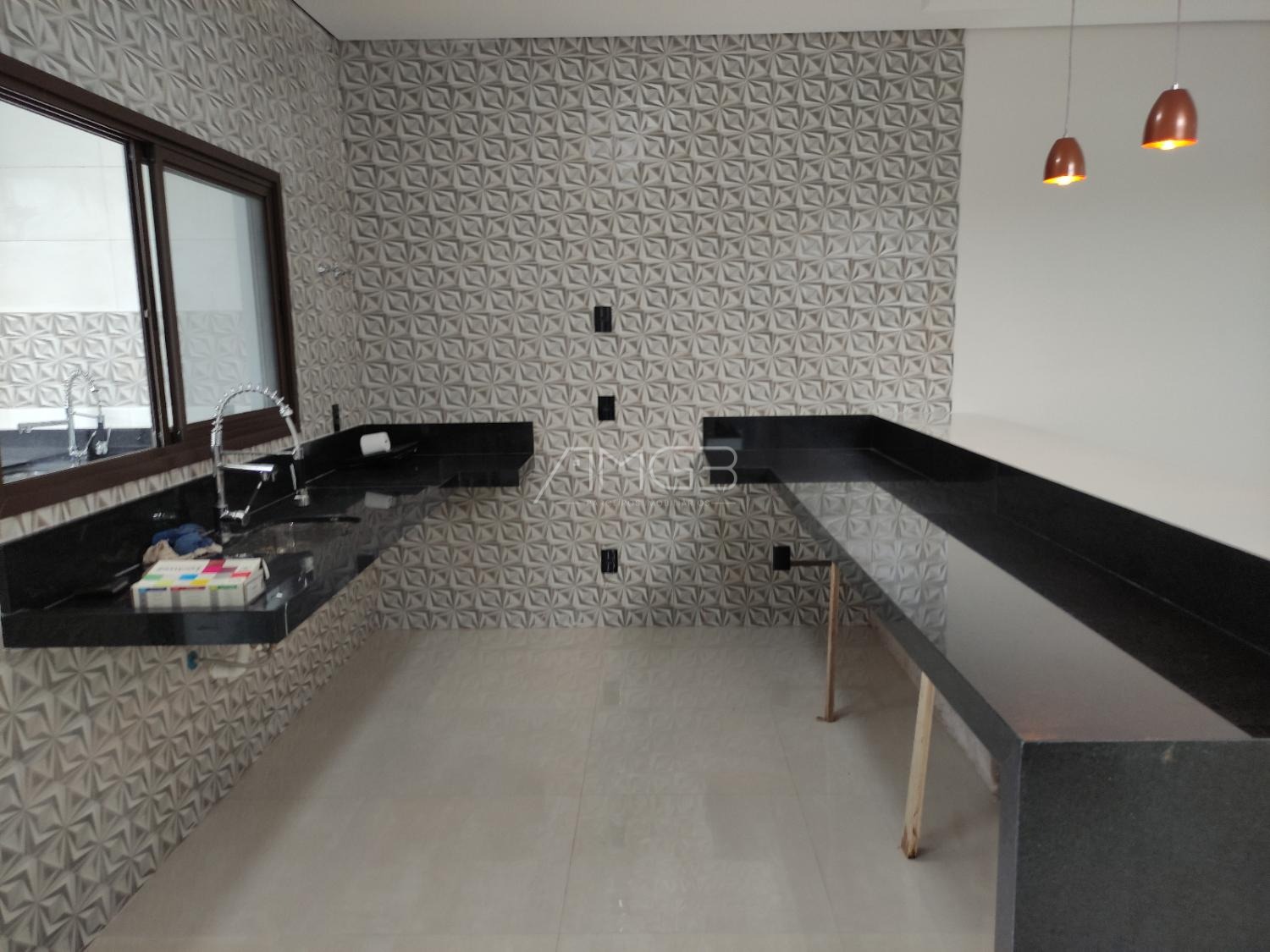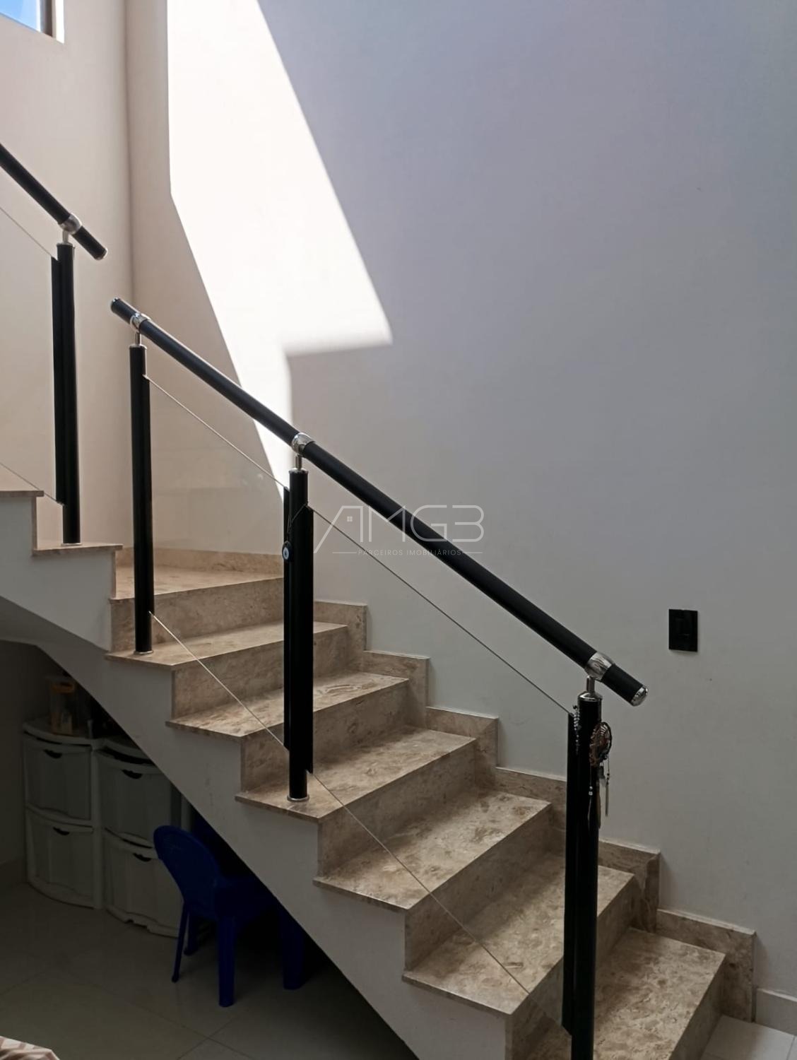 A residência conta com sala de jantar integrada à cozinha americana, proporcionando um espaço amplo e agradável para o convívio diário. Dispõe ainda de área gourmet com churrasqueira, ideal para momentos de lazer, além de lavanderia independente. São três banheiros, todos com pias e nichos em mármore travertino, revestidos até o teto, evidenciando o cuidado com os detalhes.