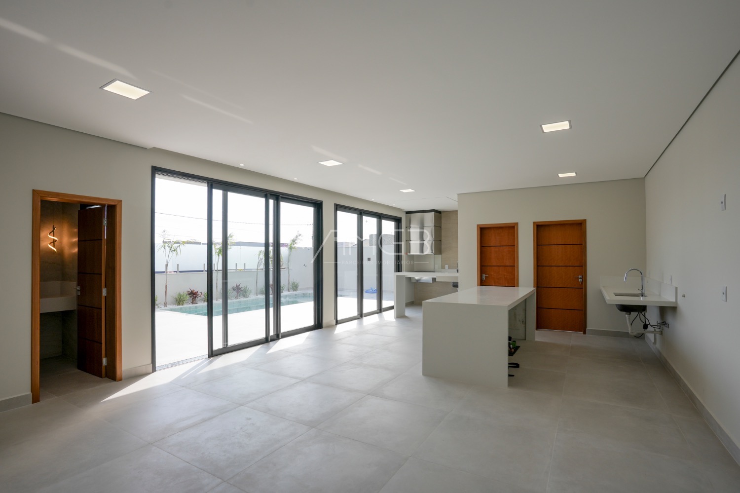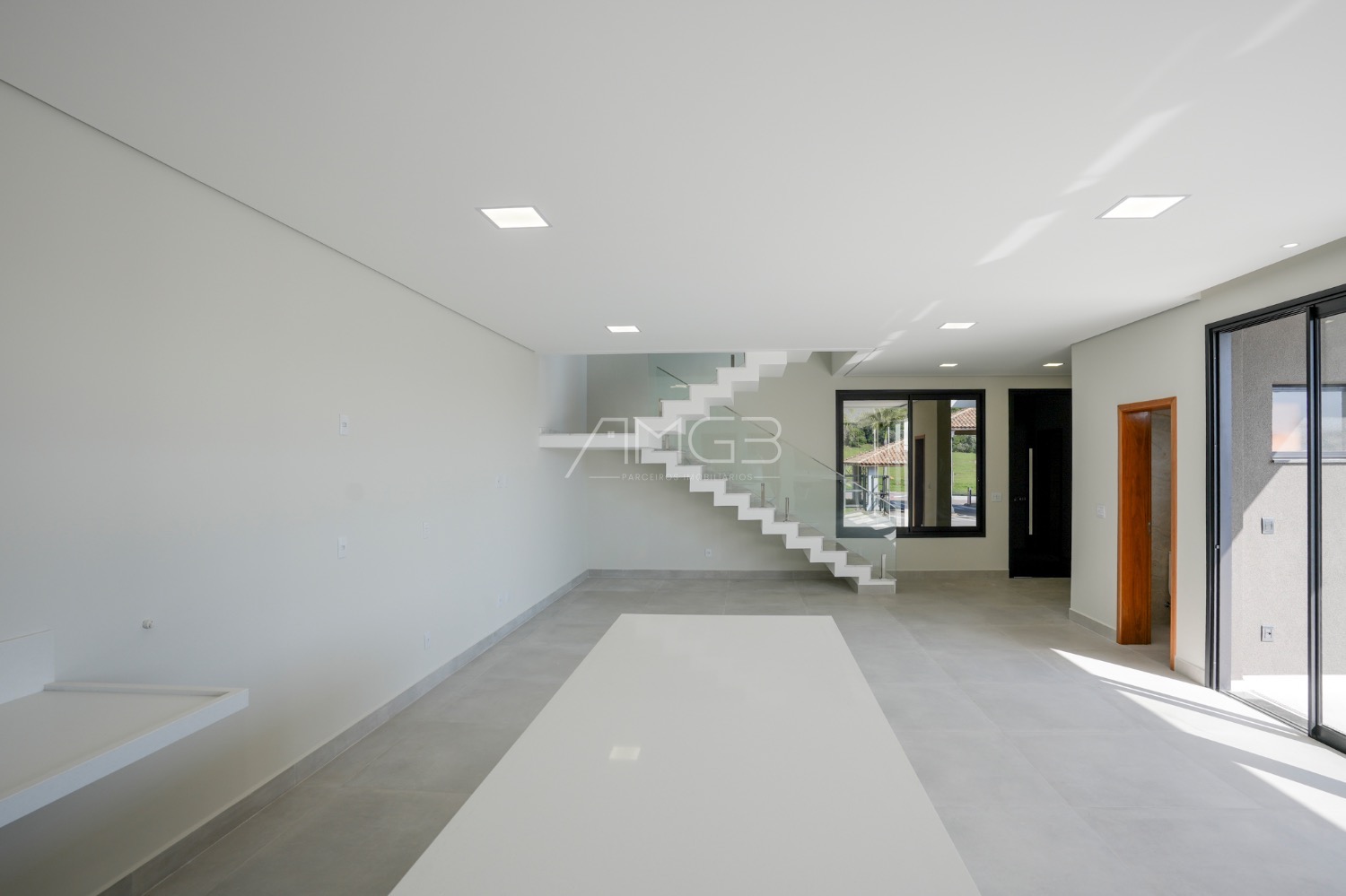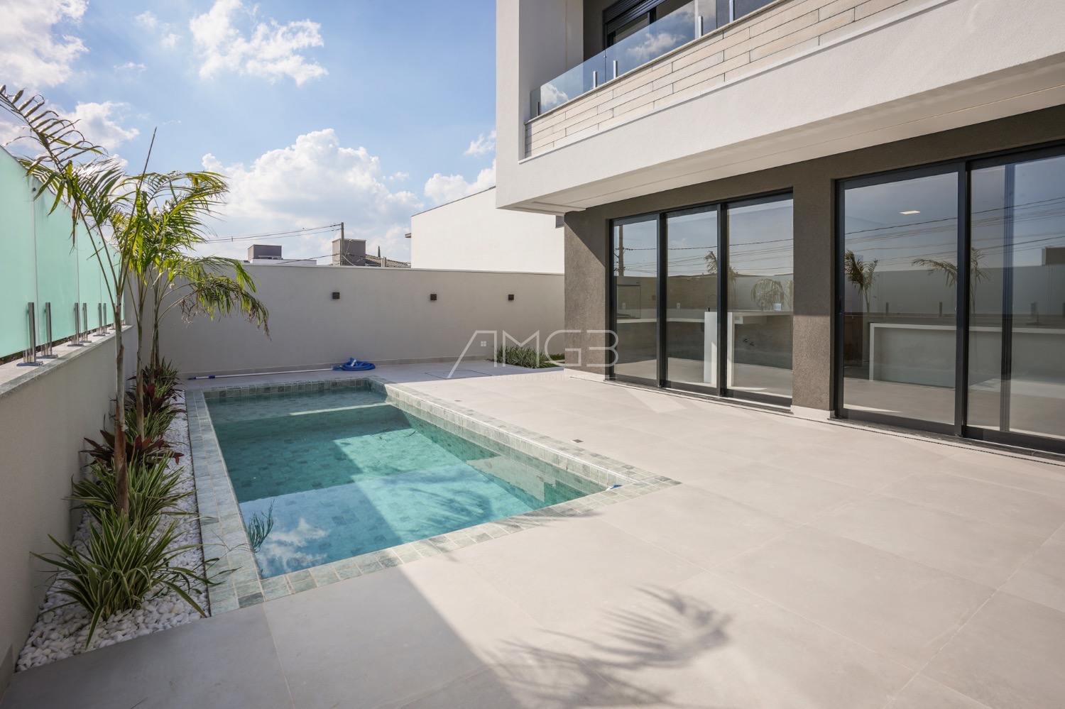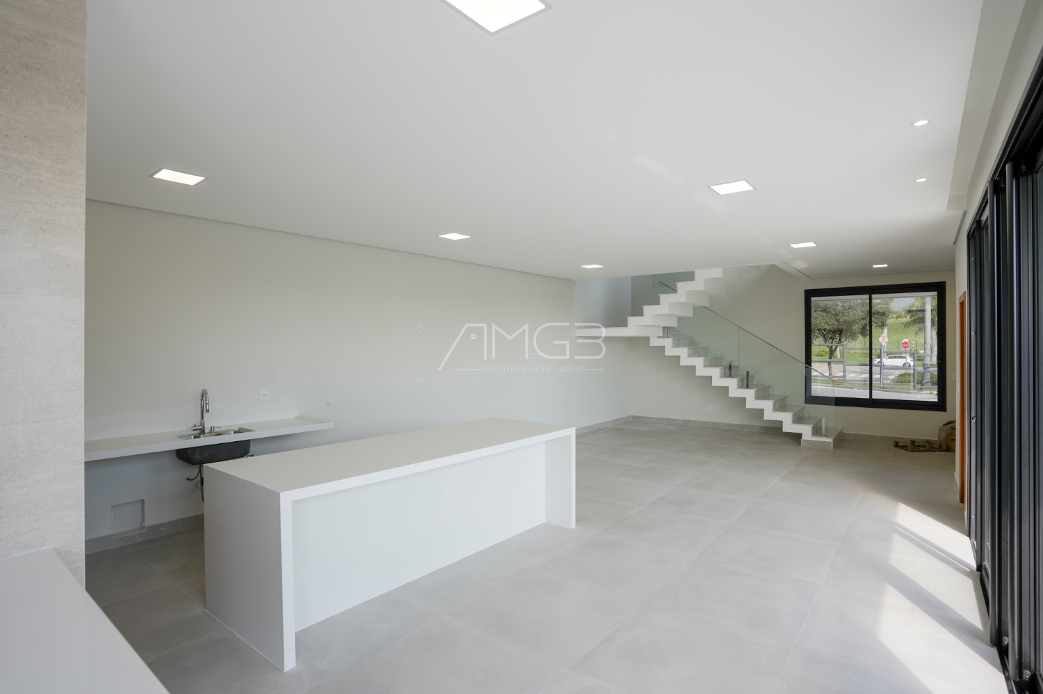 A área social se destaca pela elegância: living amplo, cozinha com ilha em quartzo branco e espaço gourmet completo, integrados à área externa com piscina e paisagismo.