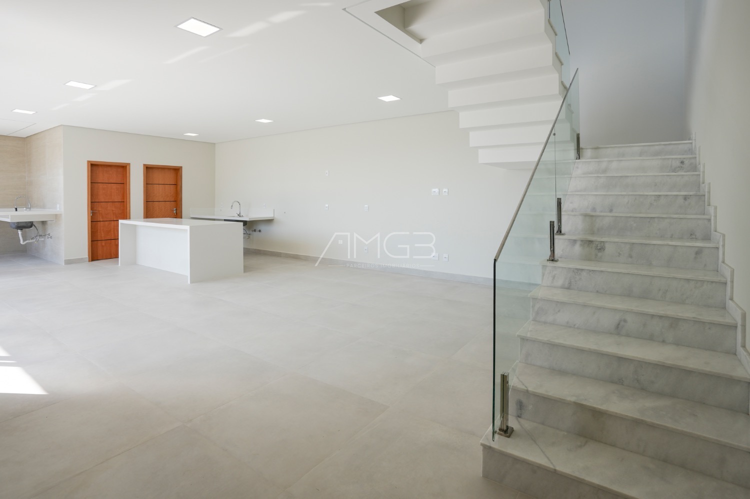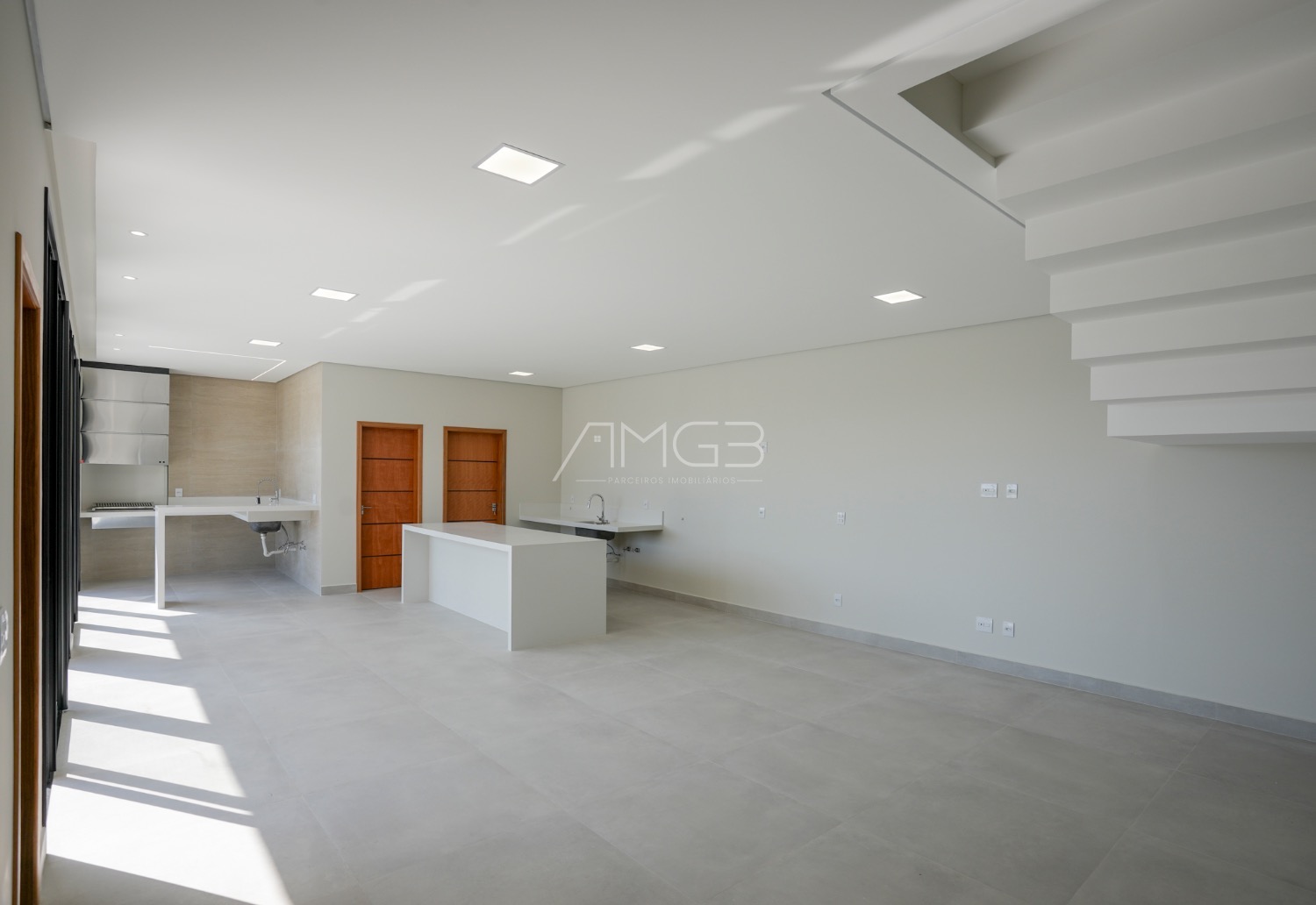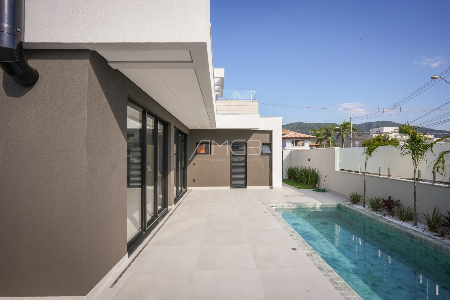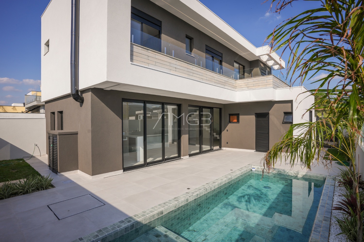A área social se destaca pela elegância: living amplo, cozinha com ilha em quartzo branco e espaço gourmet completo, integrados à área externa com piscina e paisagismo.